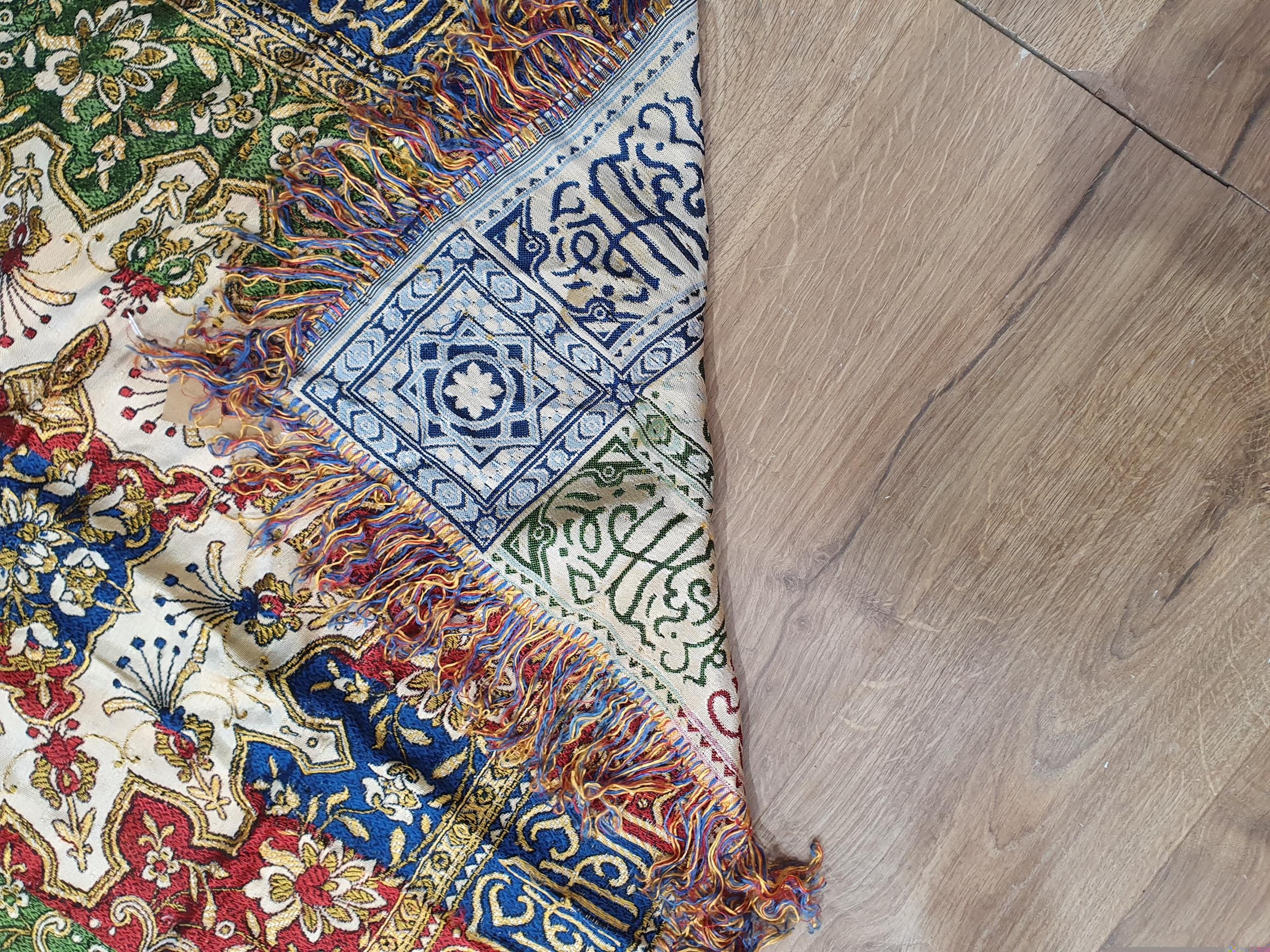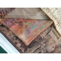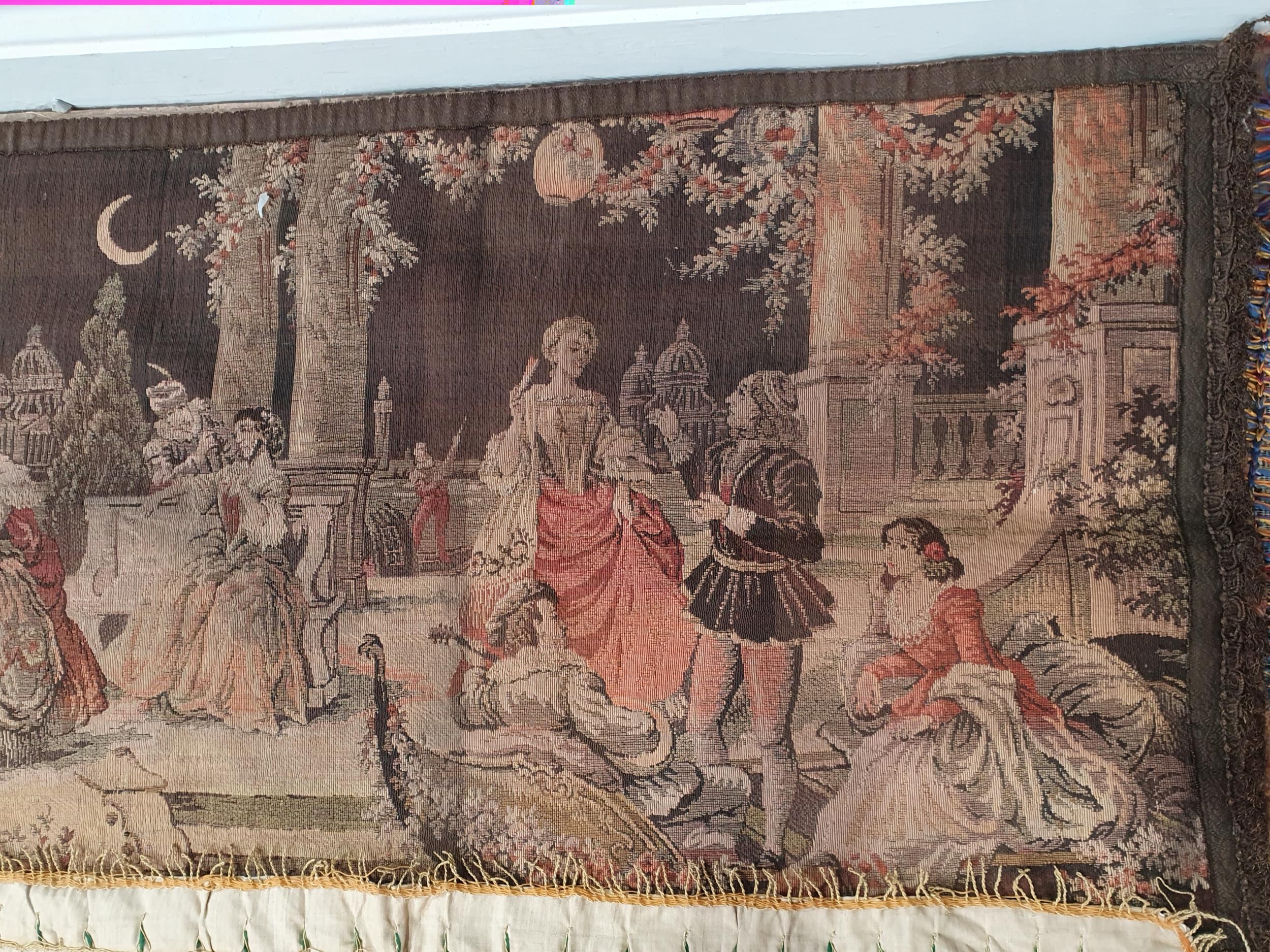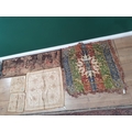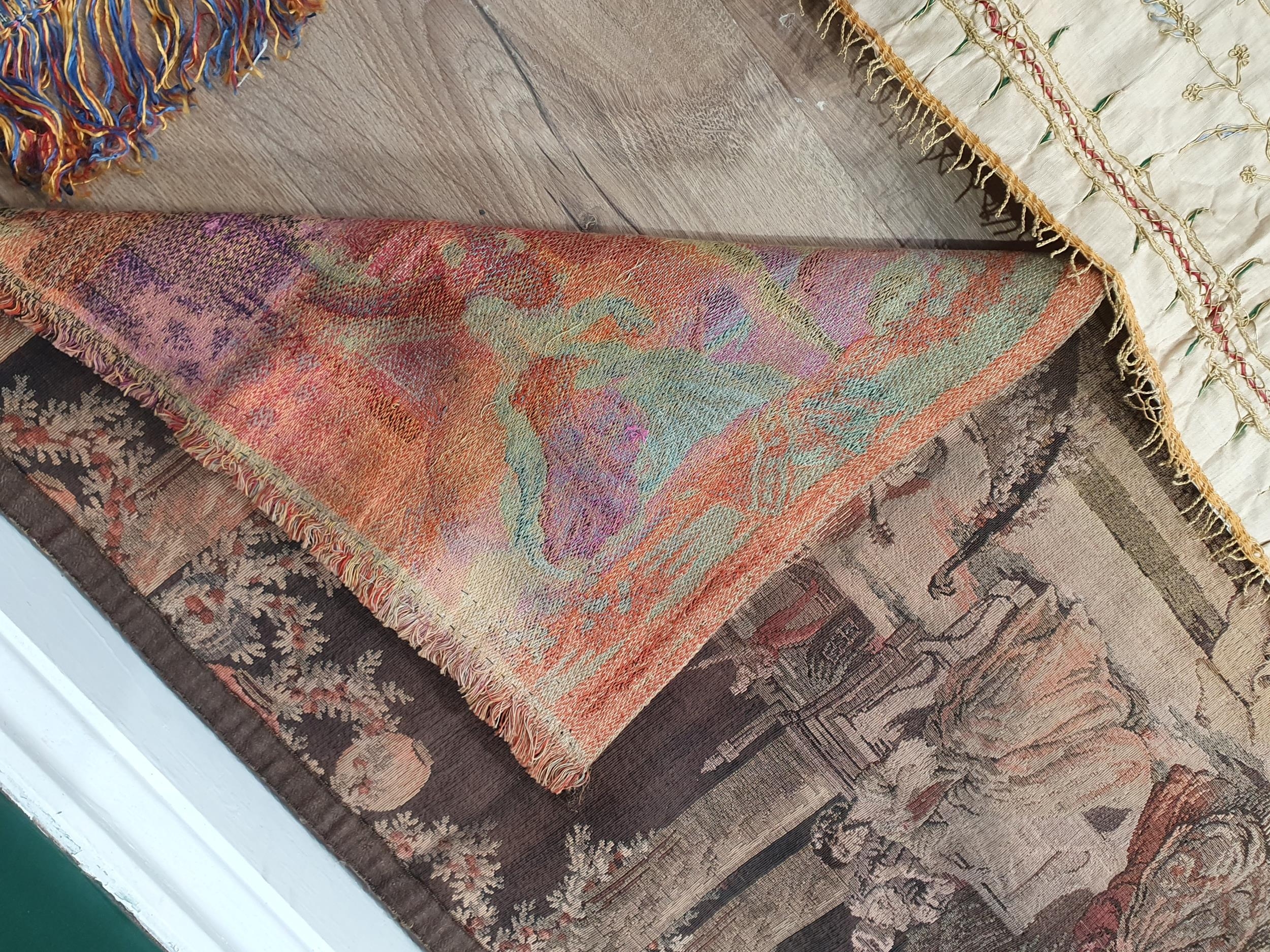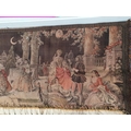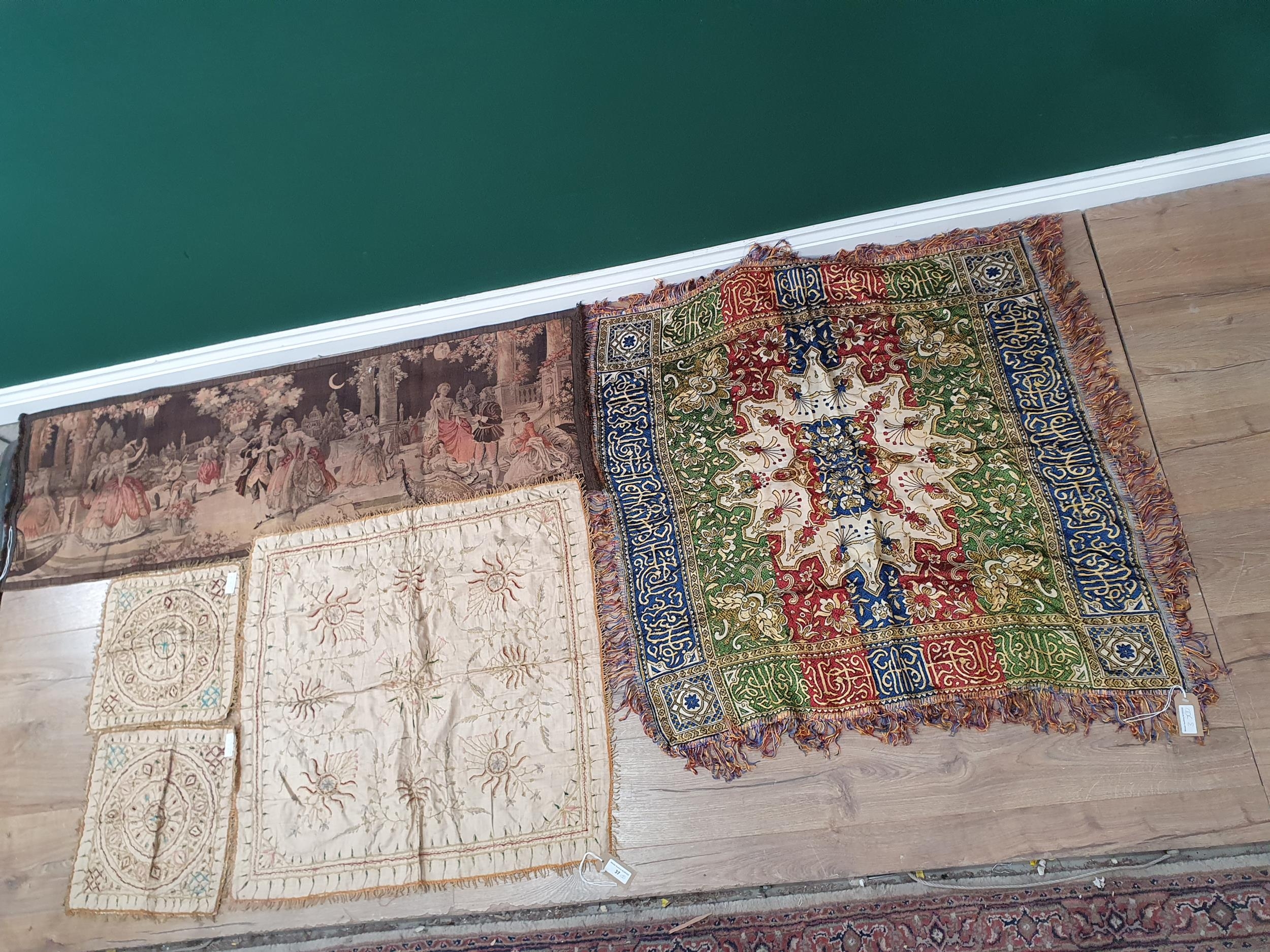 A bordered Table Cloth, the central ground with floral designs, 3ft square, a tapestry Wall Hanging depicting figures dancing and musicians, 4ft 7in x 18in, a needlework Tablecloth and two smaller of similar design (R3)
