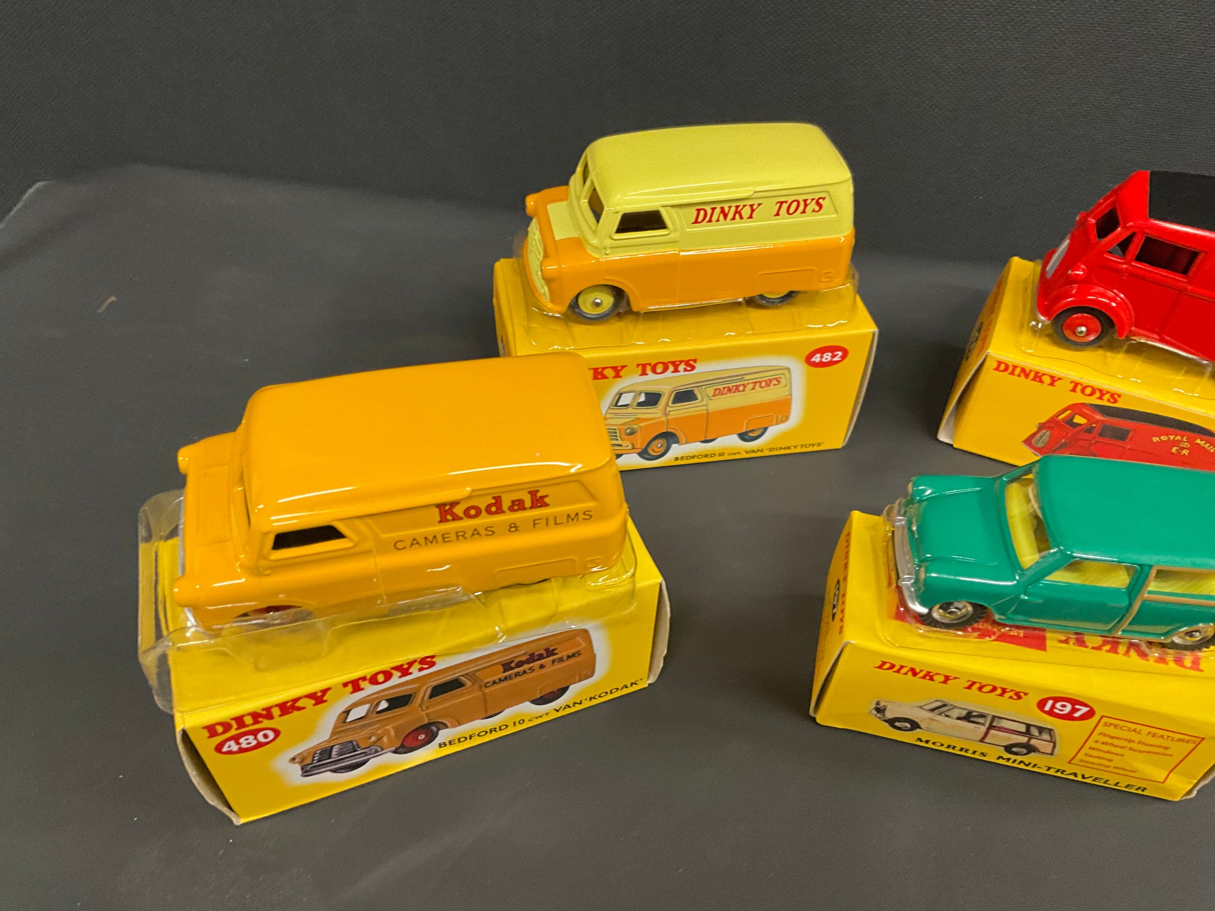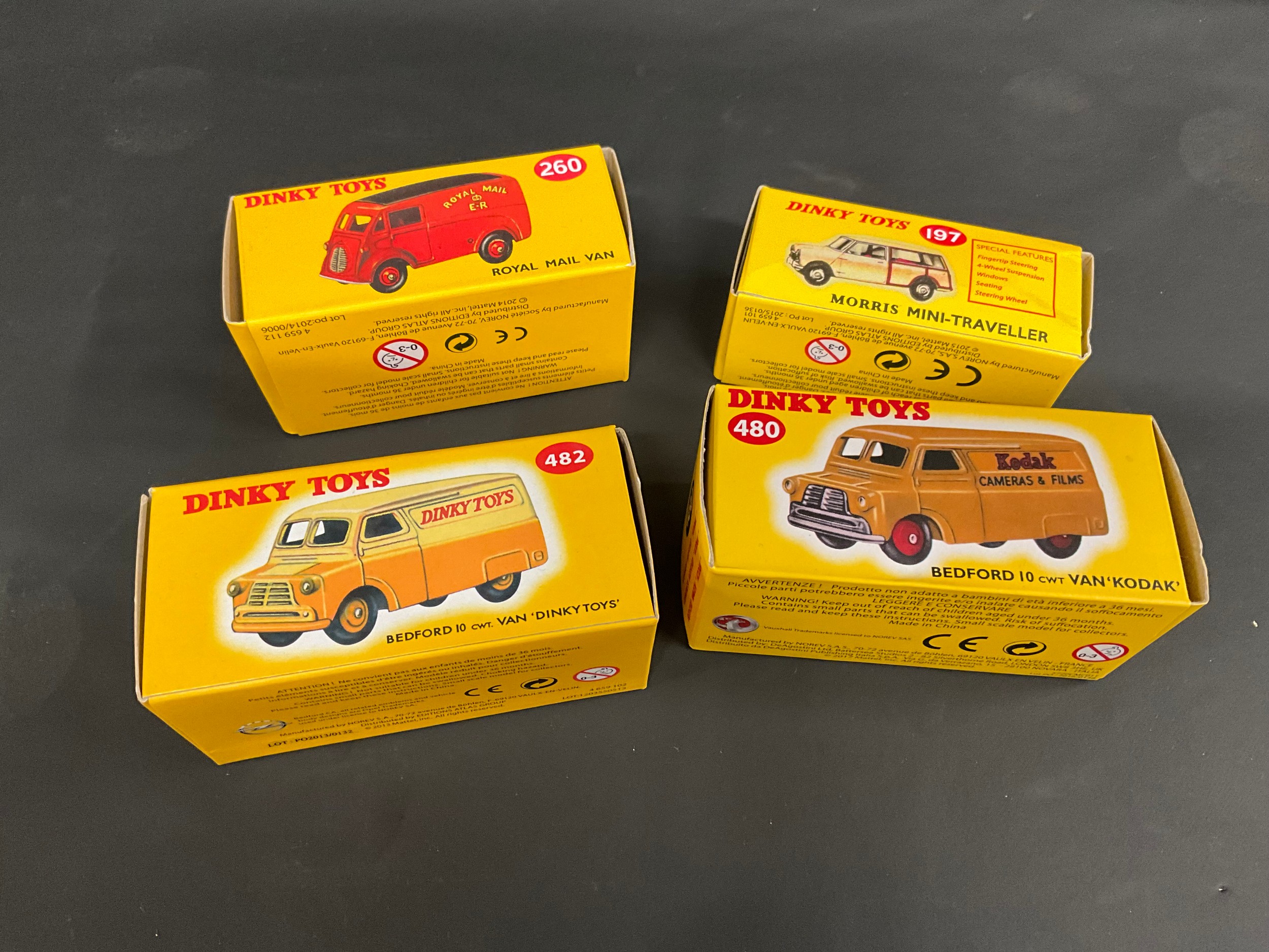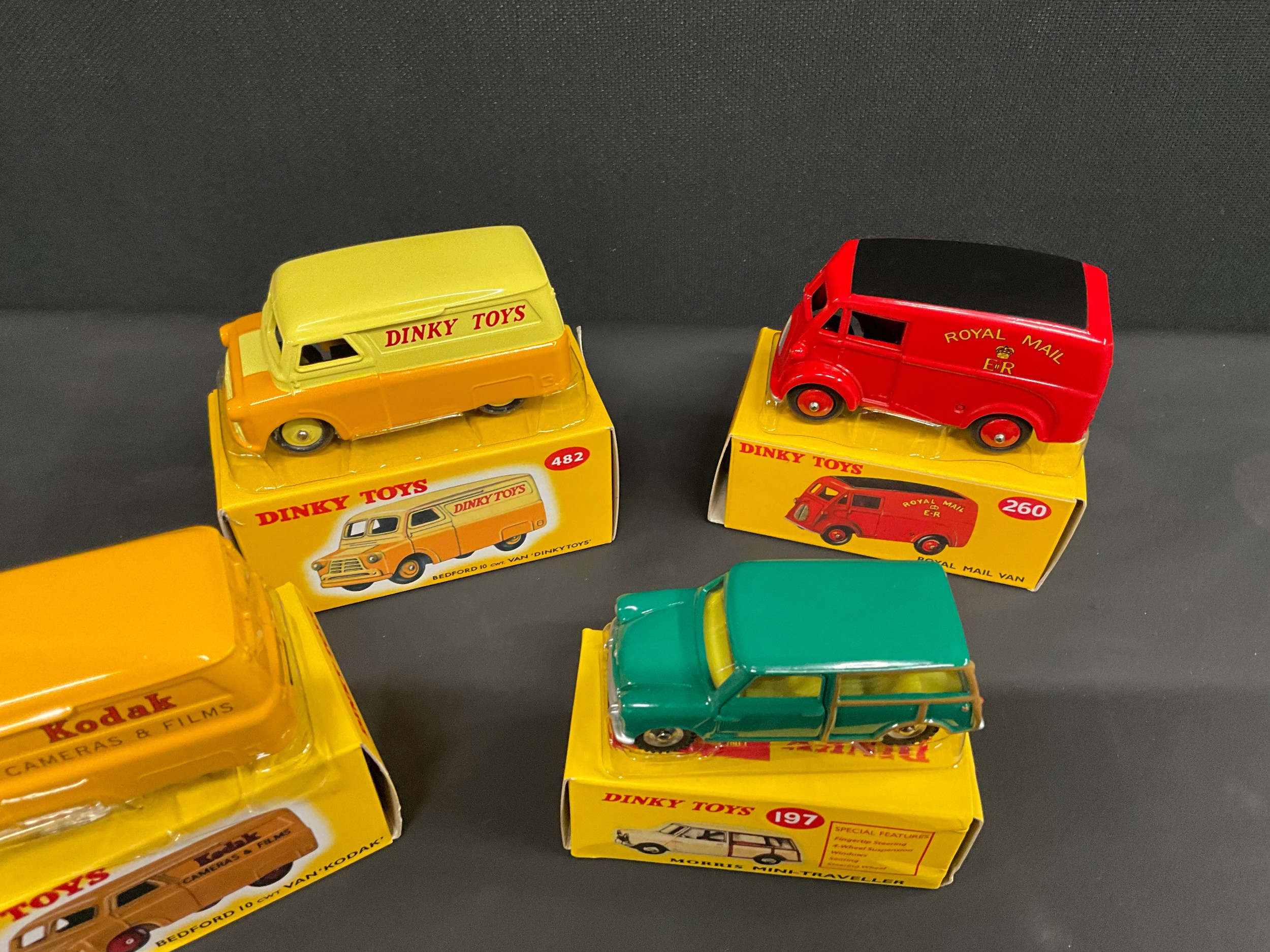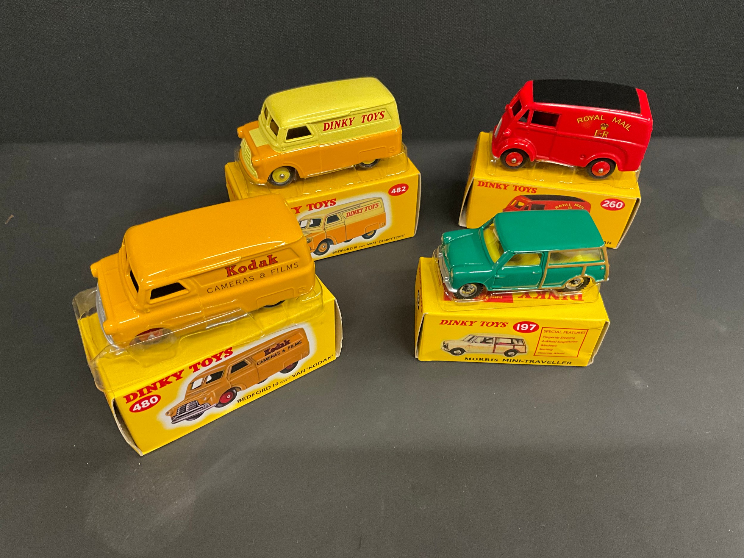 4 BOXED DINKY TOYS TO INCLUDE MORRIS MINI TRAVELLER 197, BEDFORD KODAK VAN NO 480, BEDFORD DINKY TOYS VAN NO 482, ROYAL MAIL VAN NO 260