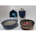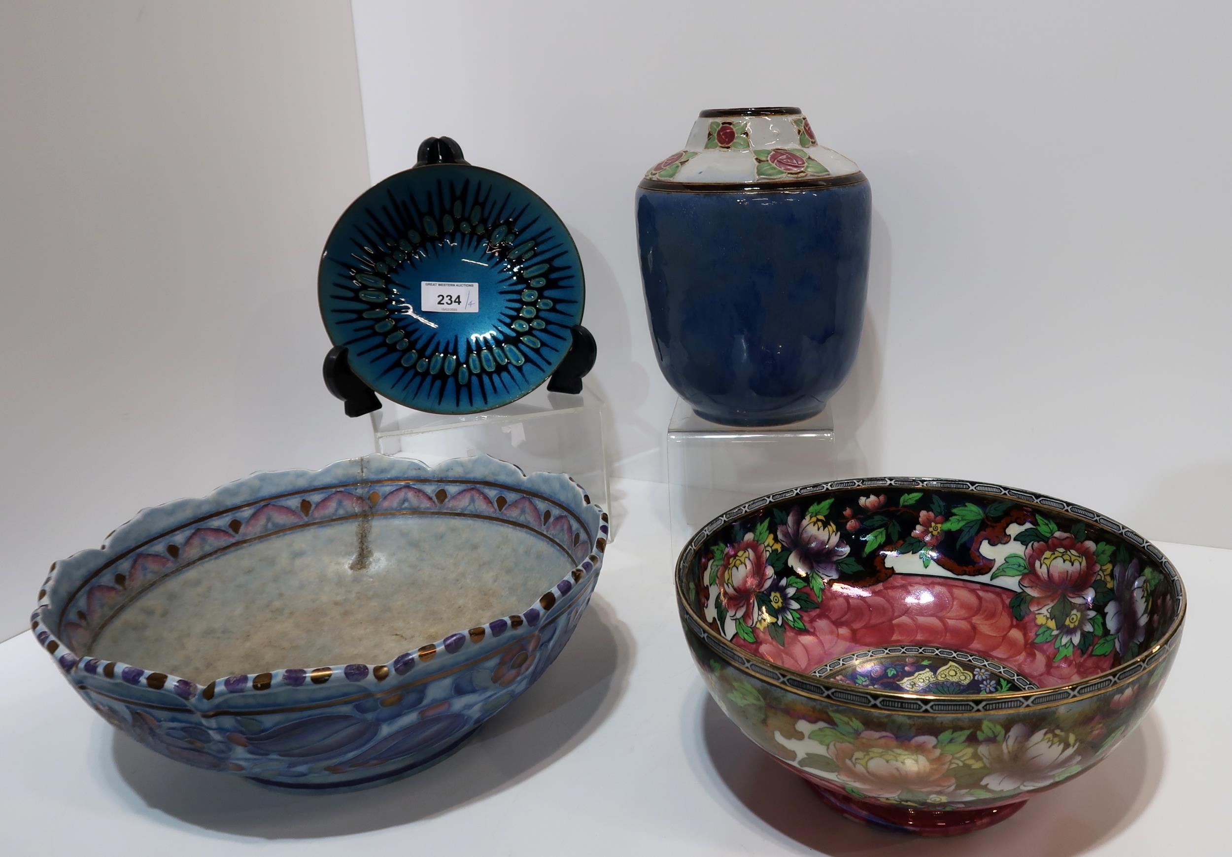 A De Passillé-Sylvestre enamel bowl, a Maud Bowden for Royal Doulton vase with Glasgow Rose style decoration, a Frederick Rhead decorated bowl and a Maling peony bowl