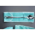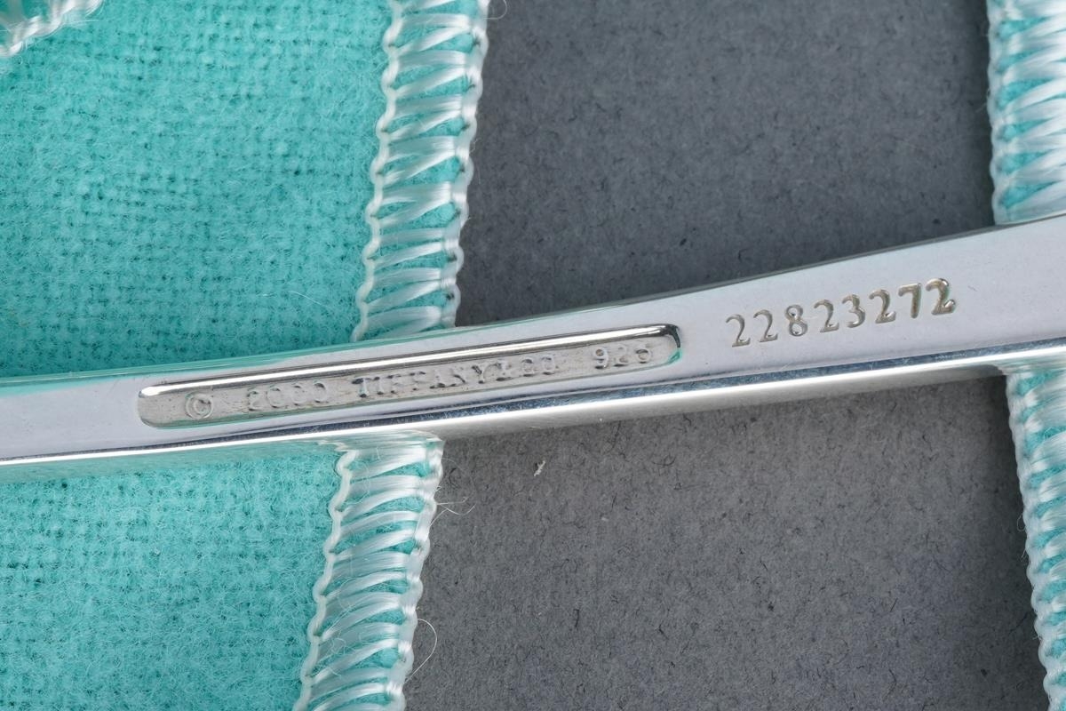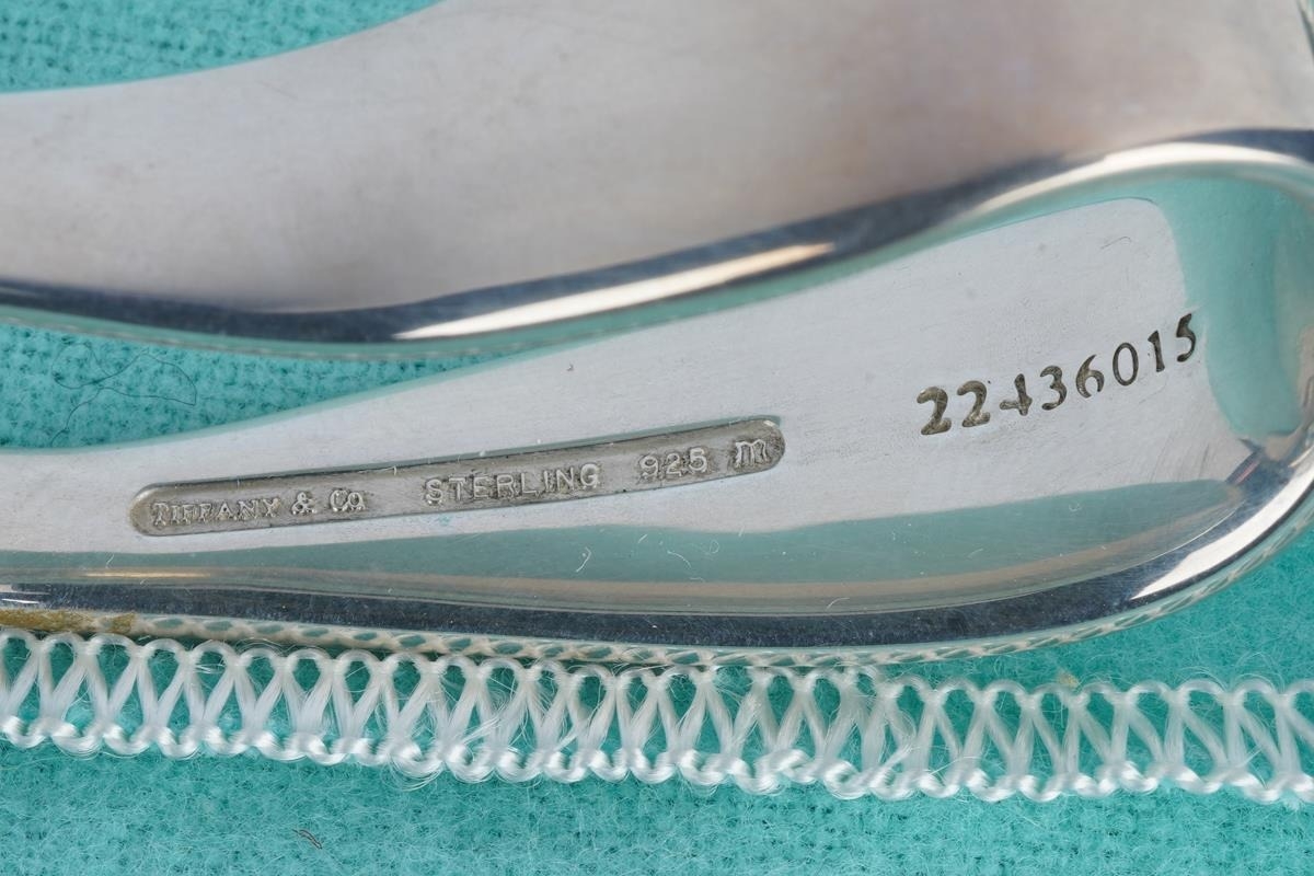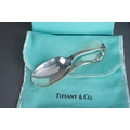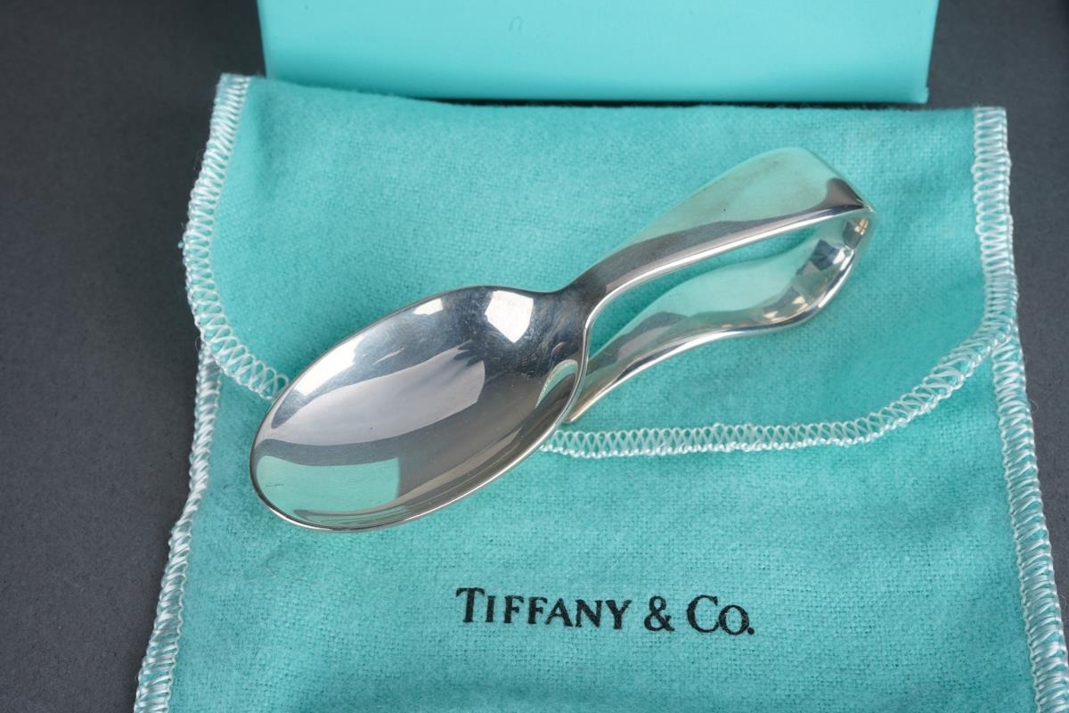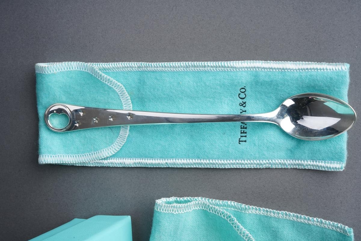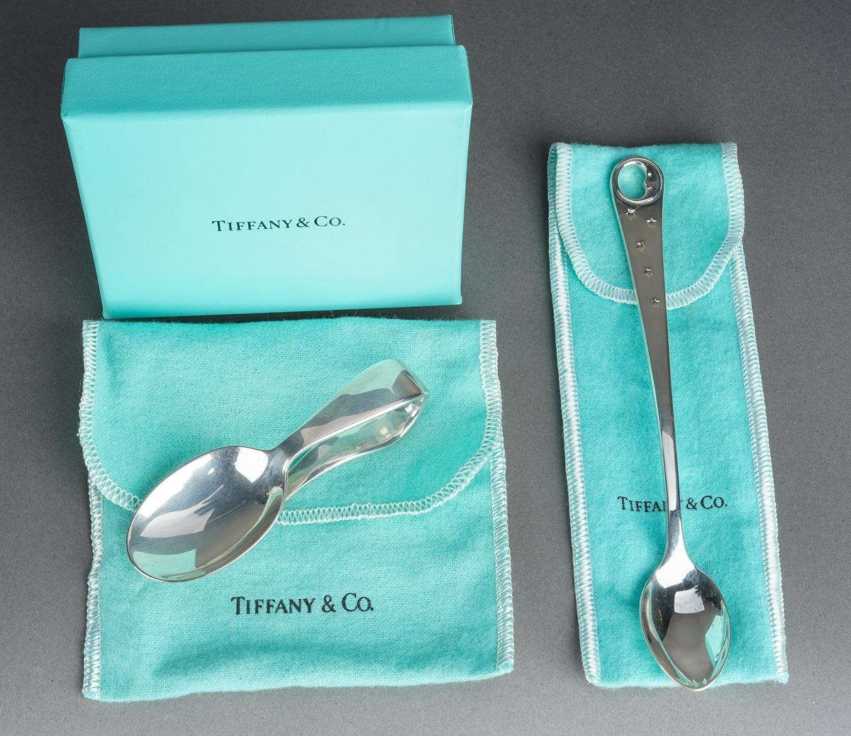 Two Tiffany & Co silver spoons, comprising a boxed baby's feeding spoon, stamped "TIFFANY & CO STERLING 925 M" and London hallmarks, 1.25ozt, 38.9 grams approx, with Tiffany & Co fabric pouch and lidded card box and a long handled teaspoon with crescent moon and stars decoration, stamped 22823272 and "2000 TIFFANY & CO 925", 35.5 grams approx, comes with Tiffany & Co fabric pouch (2)