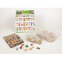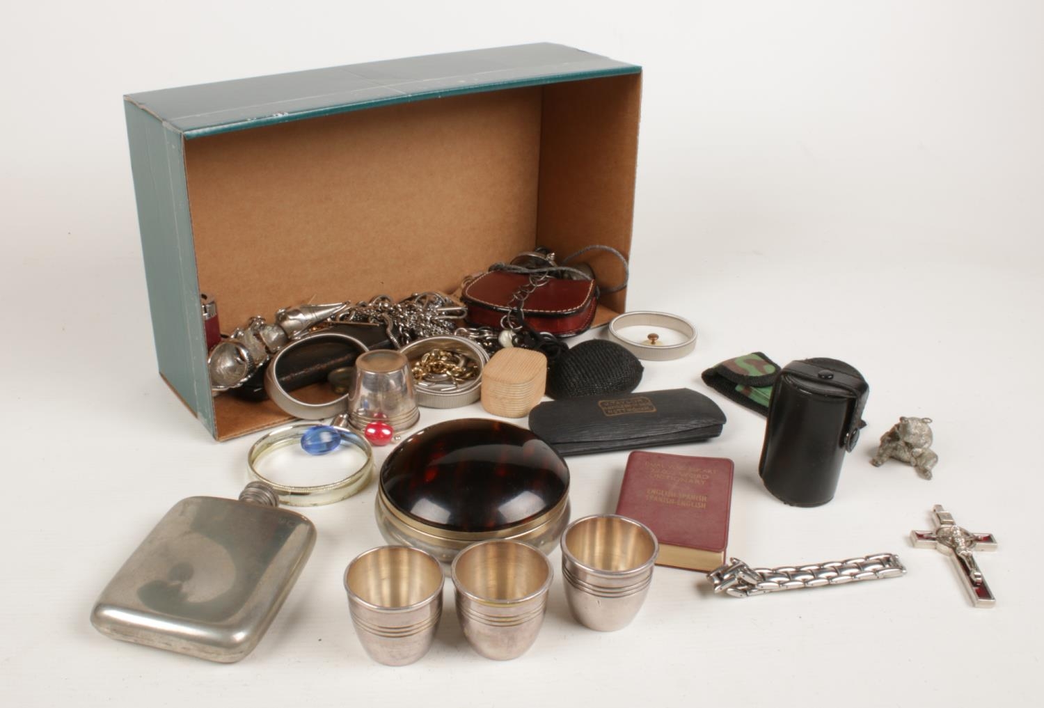 A box of collectables. Including hipflask, pendants, small bear trinket, etc.