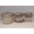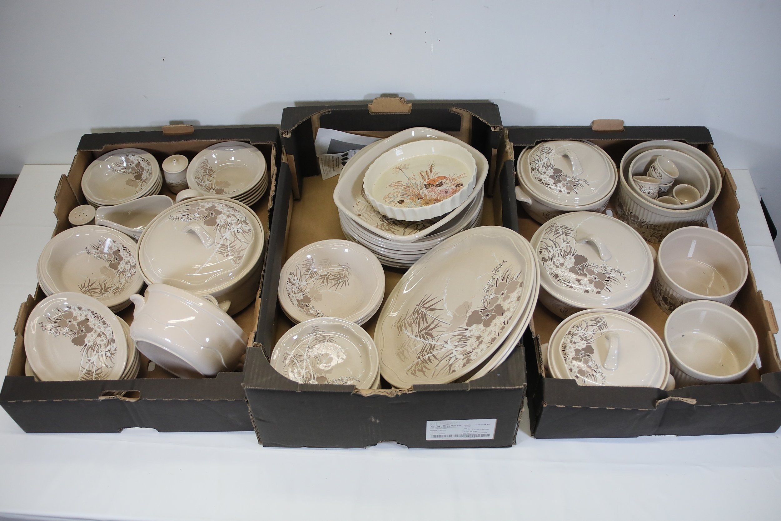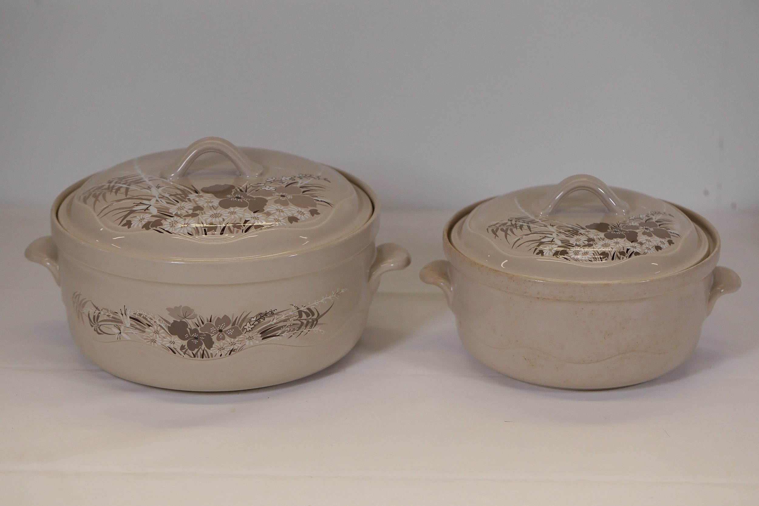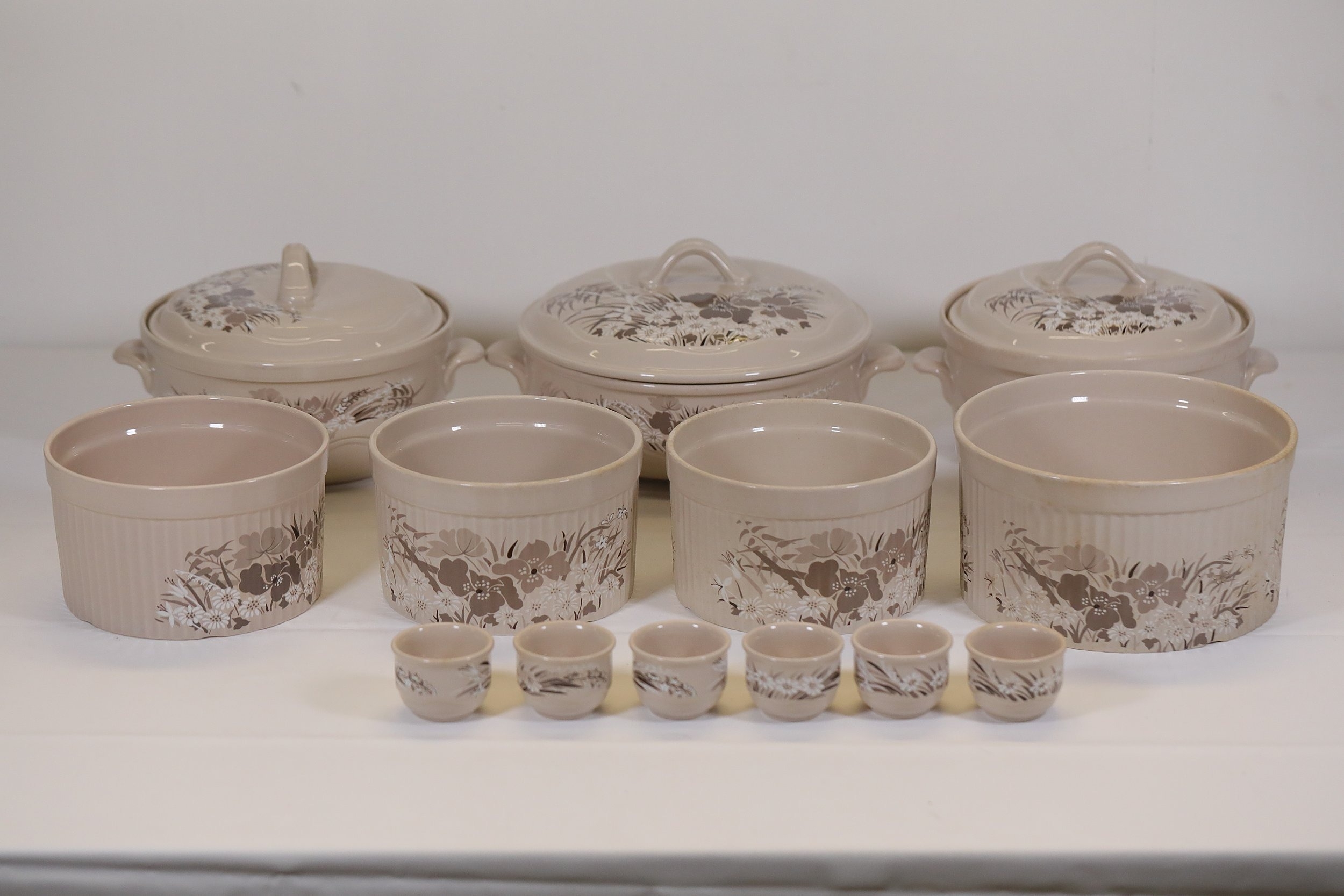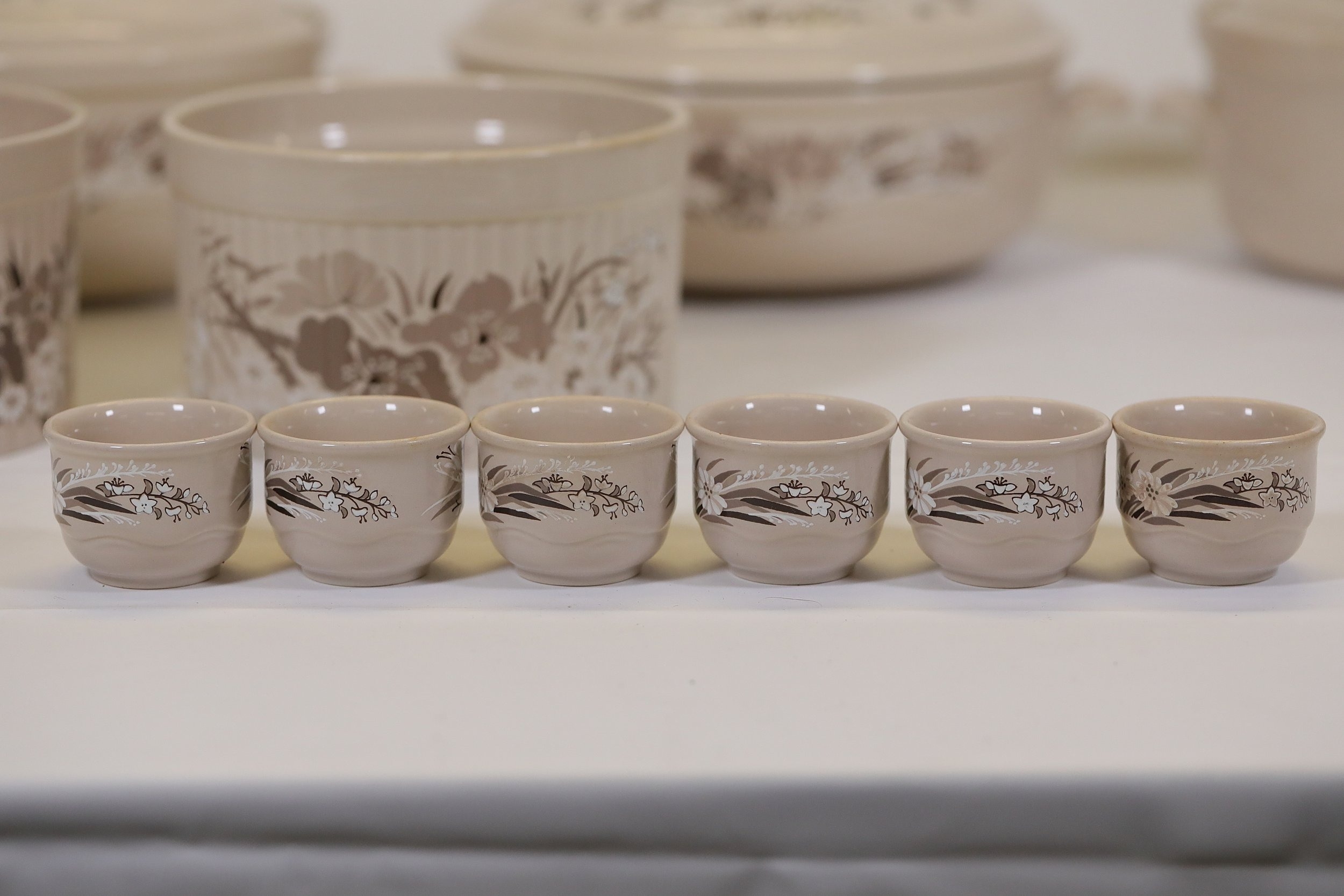 Additional pieces include lidded serving dishes, casserole dishes, small cups and saucers, and other assorted serving pieces. While most items are in very good condition, some exhibit minor chips and crazing, which highlights the set's usage history.
