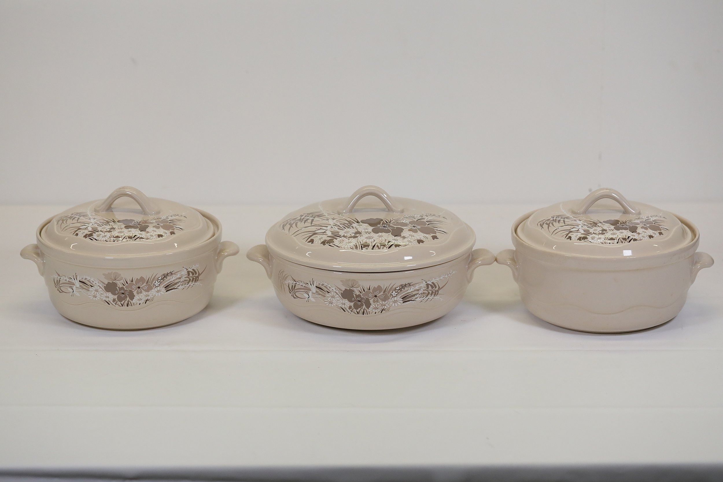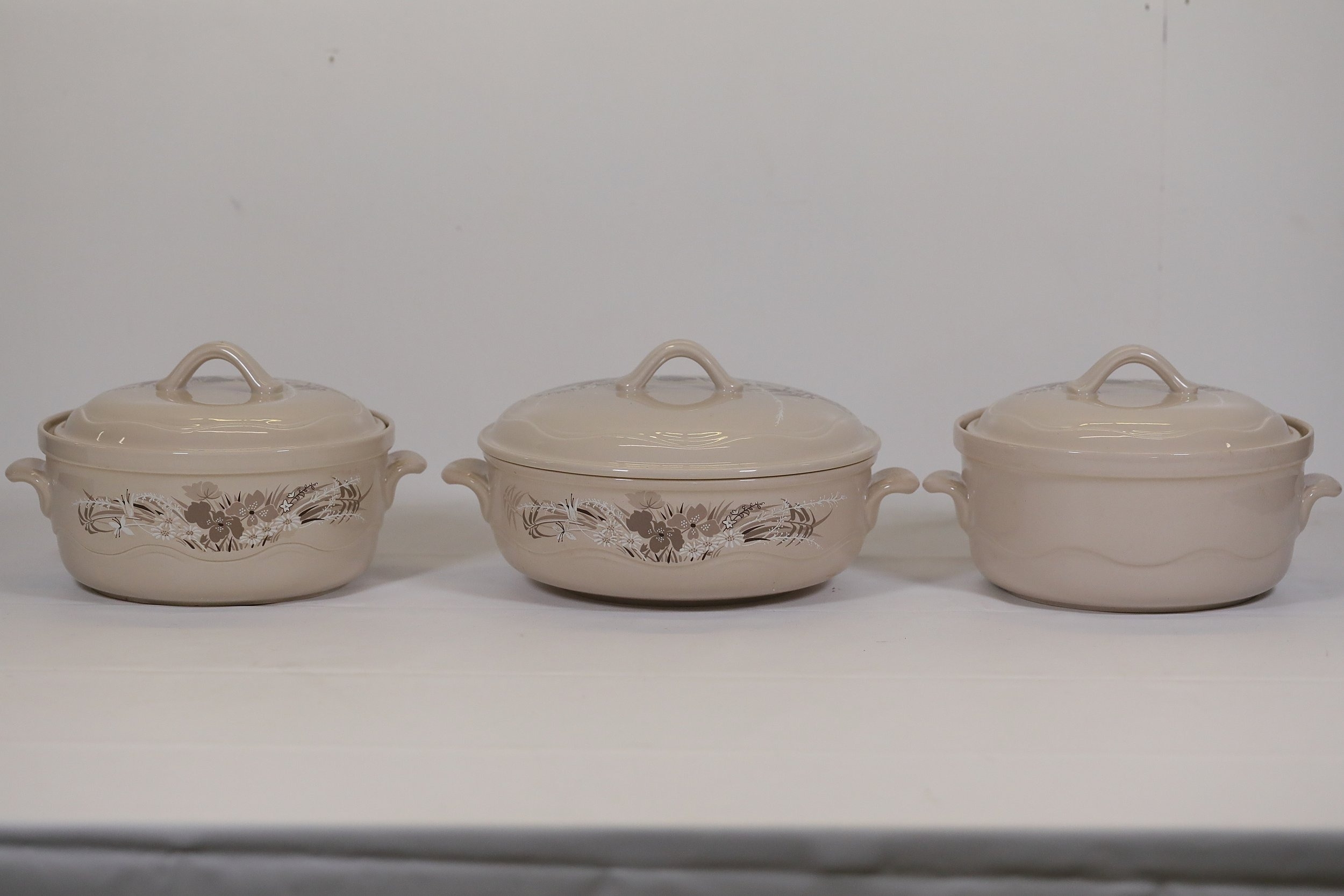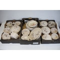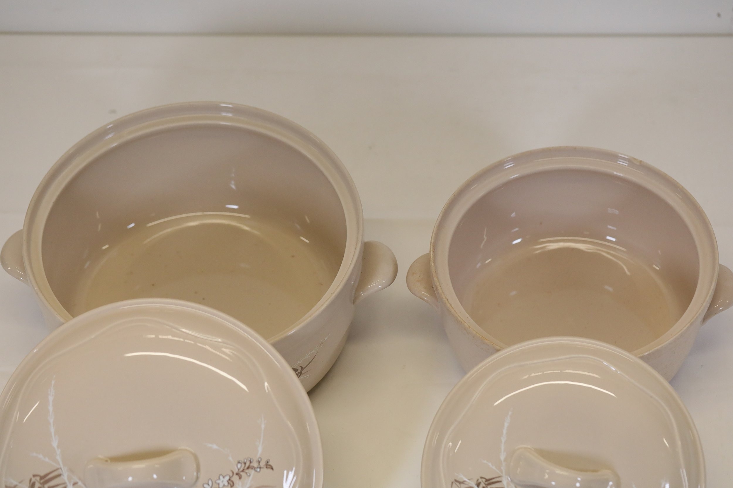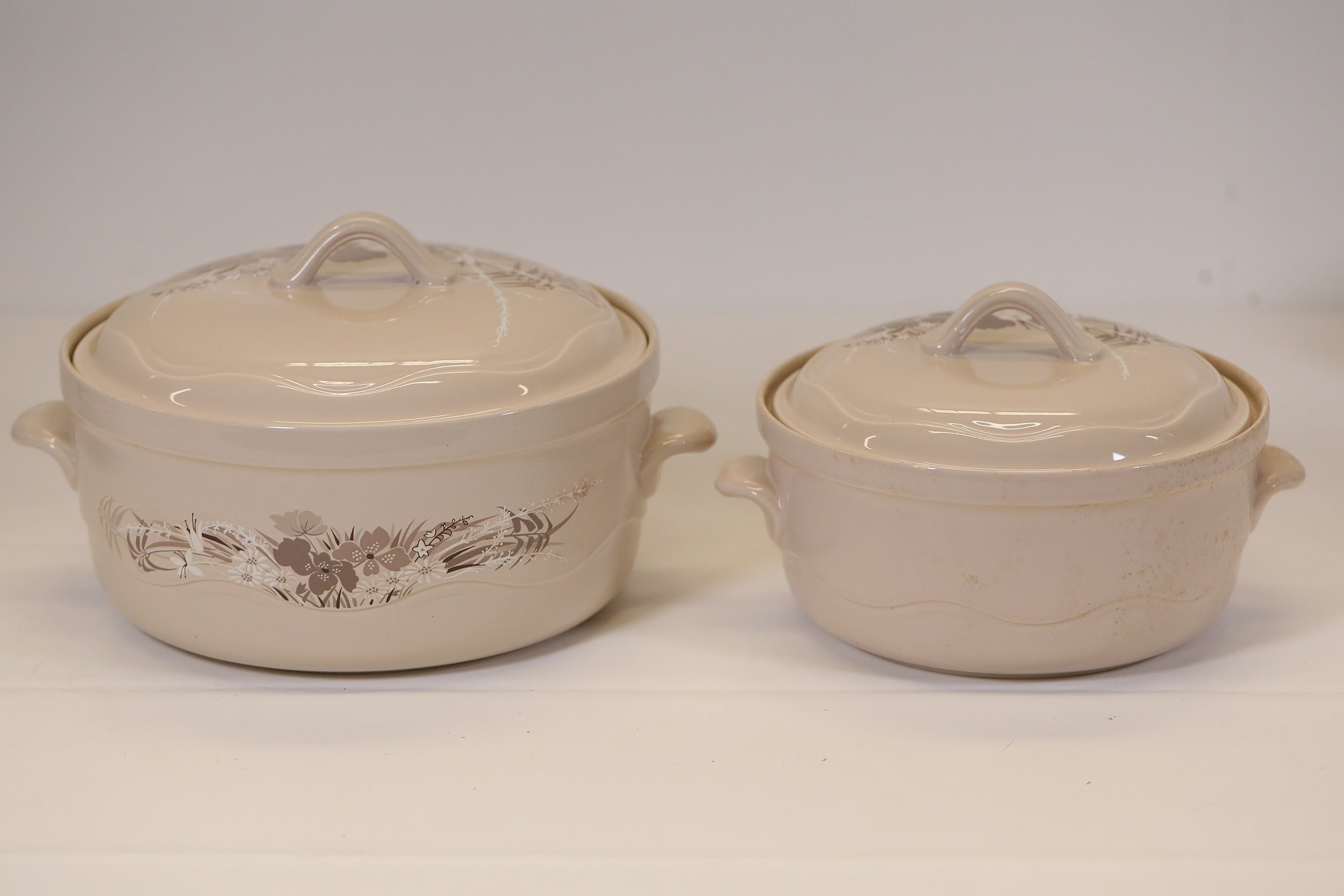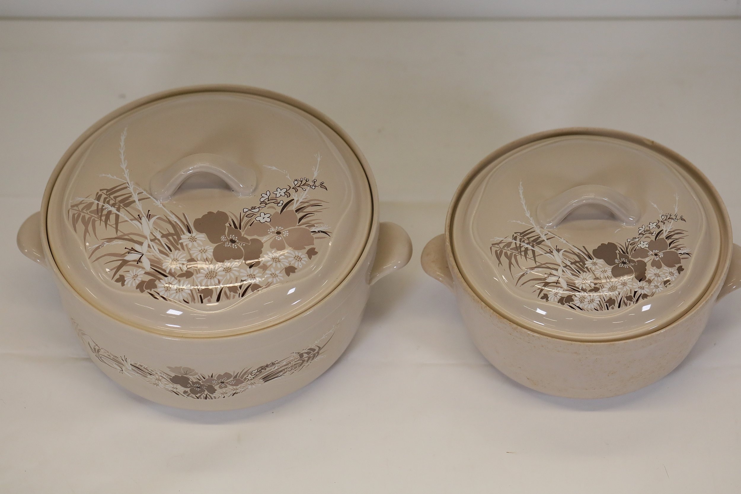 Additional pieces include lidded serving dishes, casserole dishes, small cups and saucers, and other assorted serving pieces. While most items are in very good condition, some exhibit minor chips and crazing, which highlights the set's usage history.