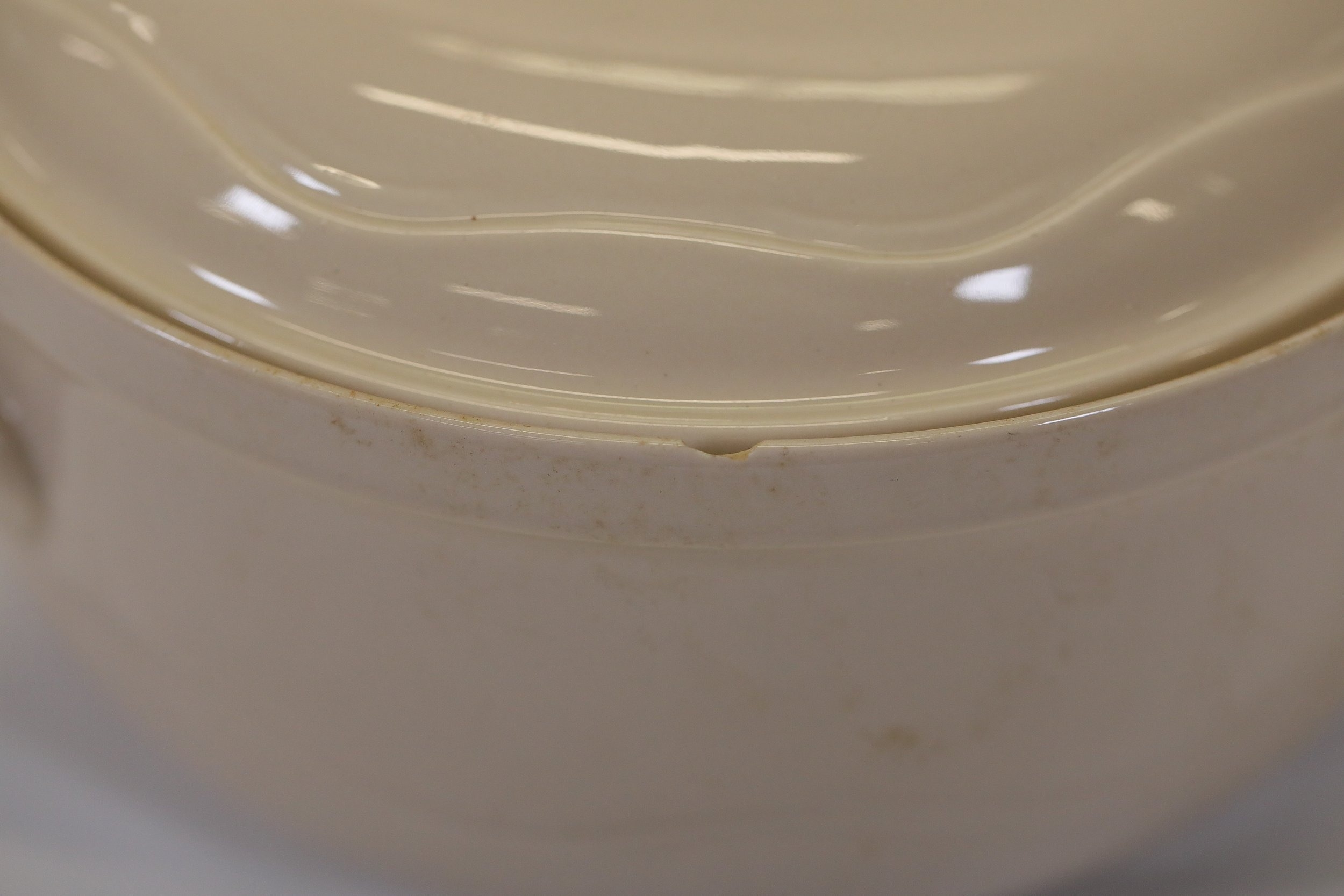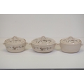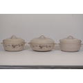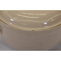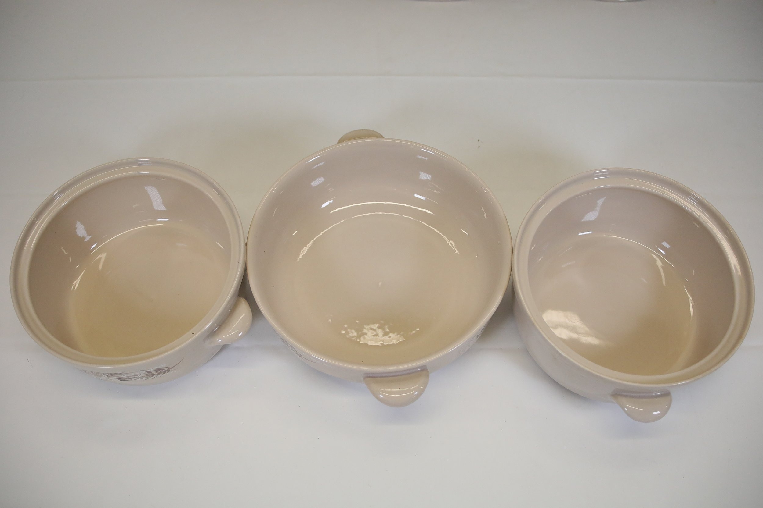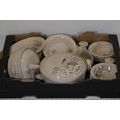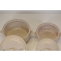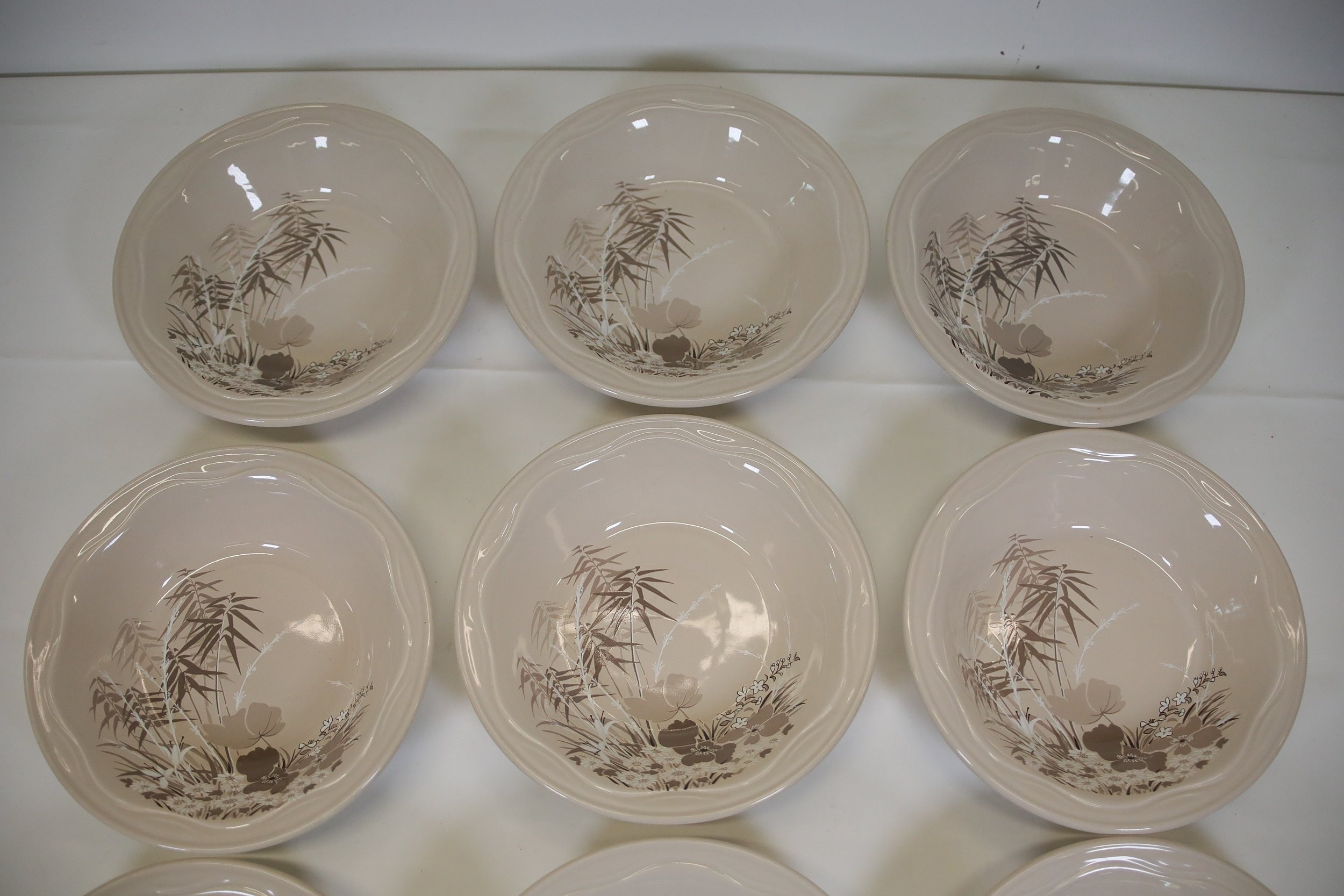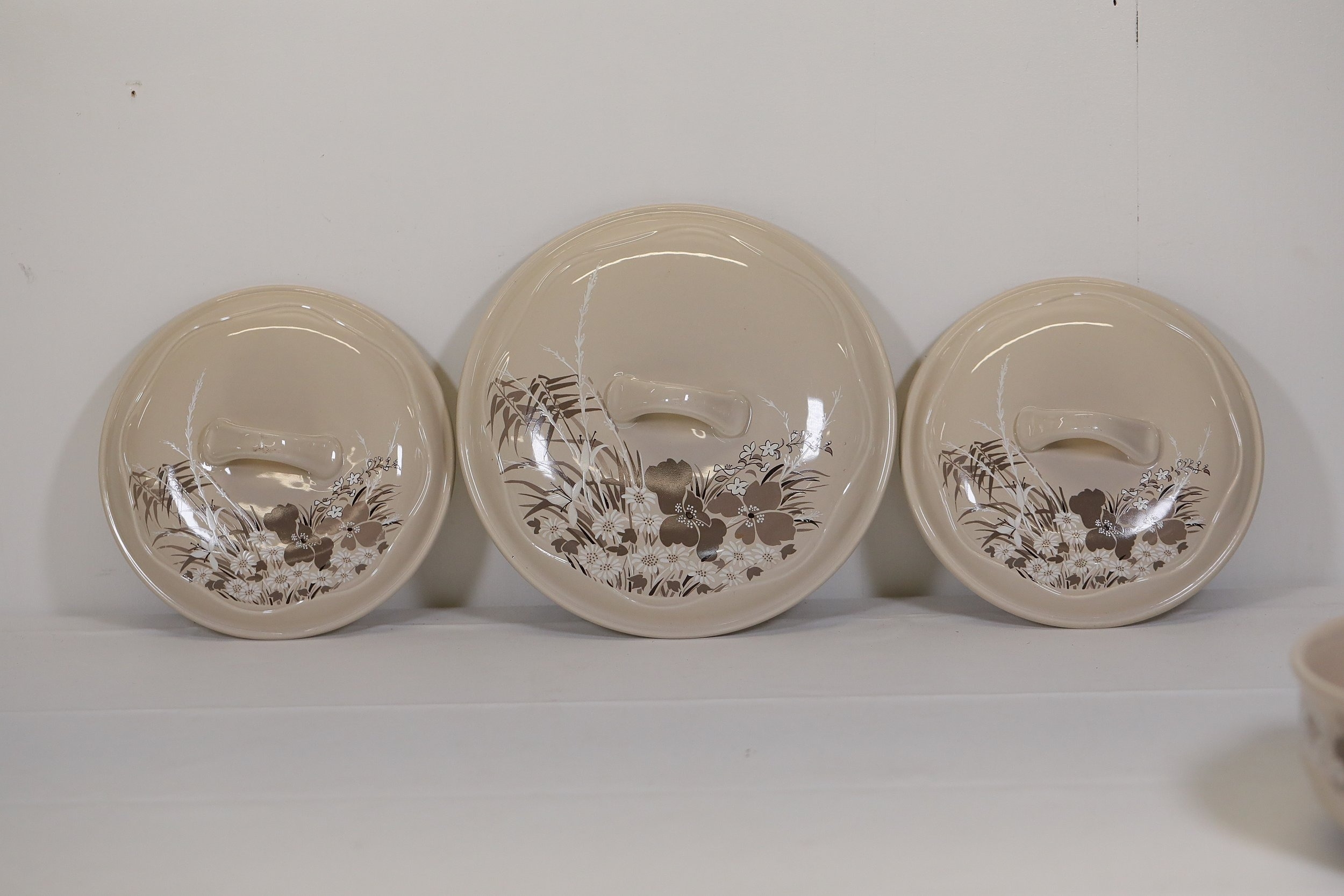 Additional pieces include lidded serving dishes, casserole dishes, small cups and saucers, and other assorted serving pieces. While most items are in very good condition, some exhibit minor chips and crazing, which highlights the set's usage history.