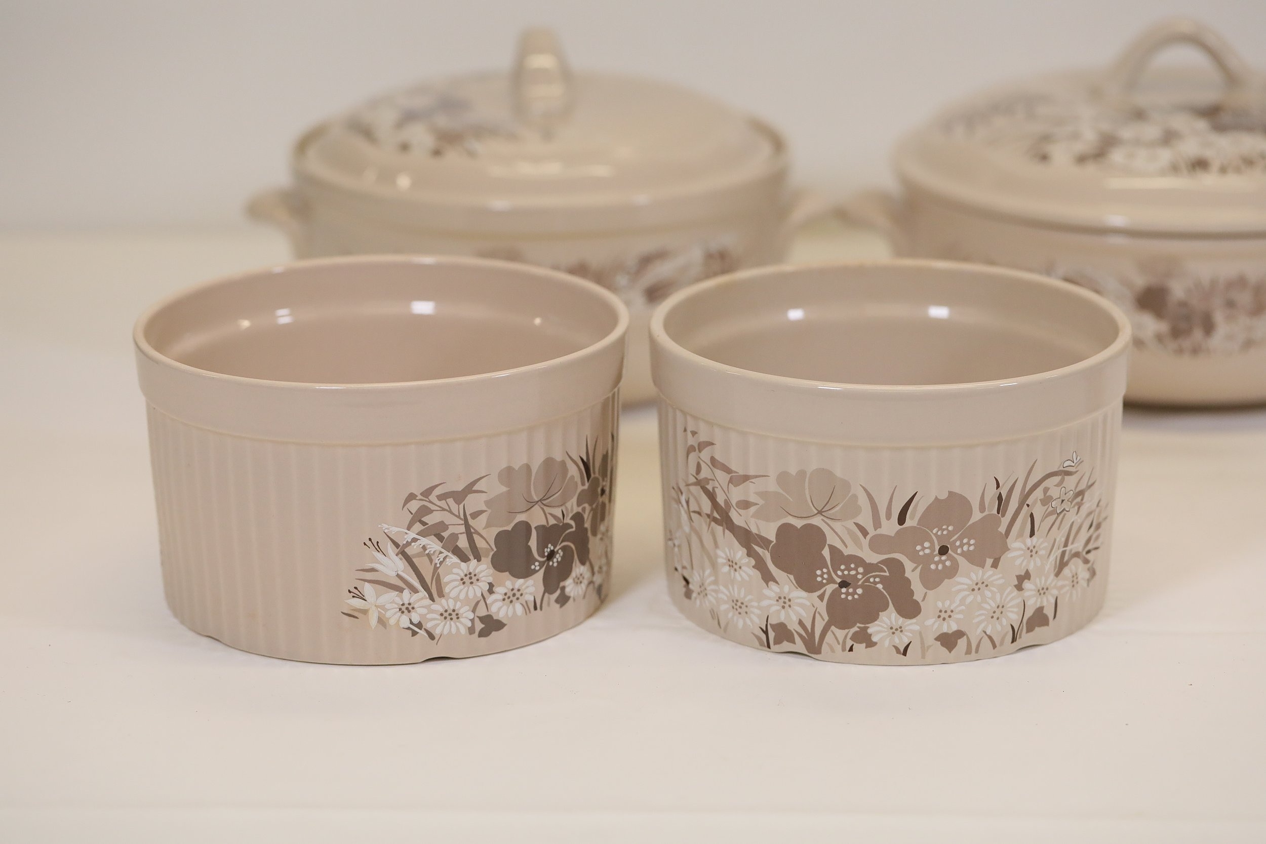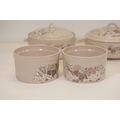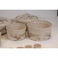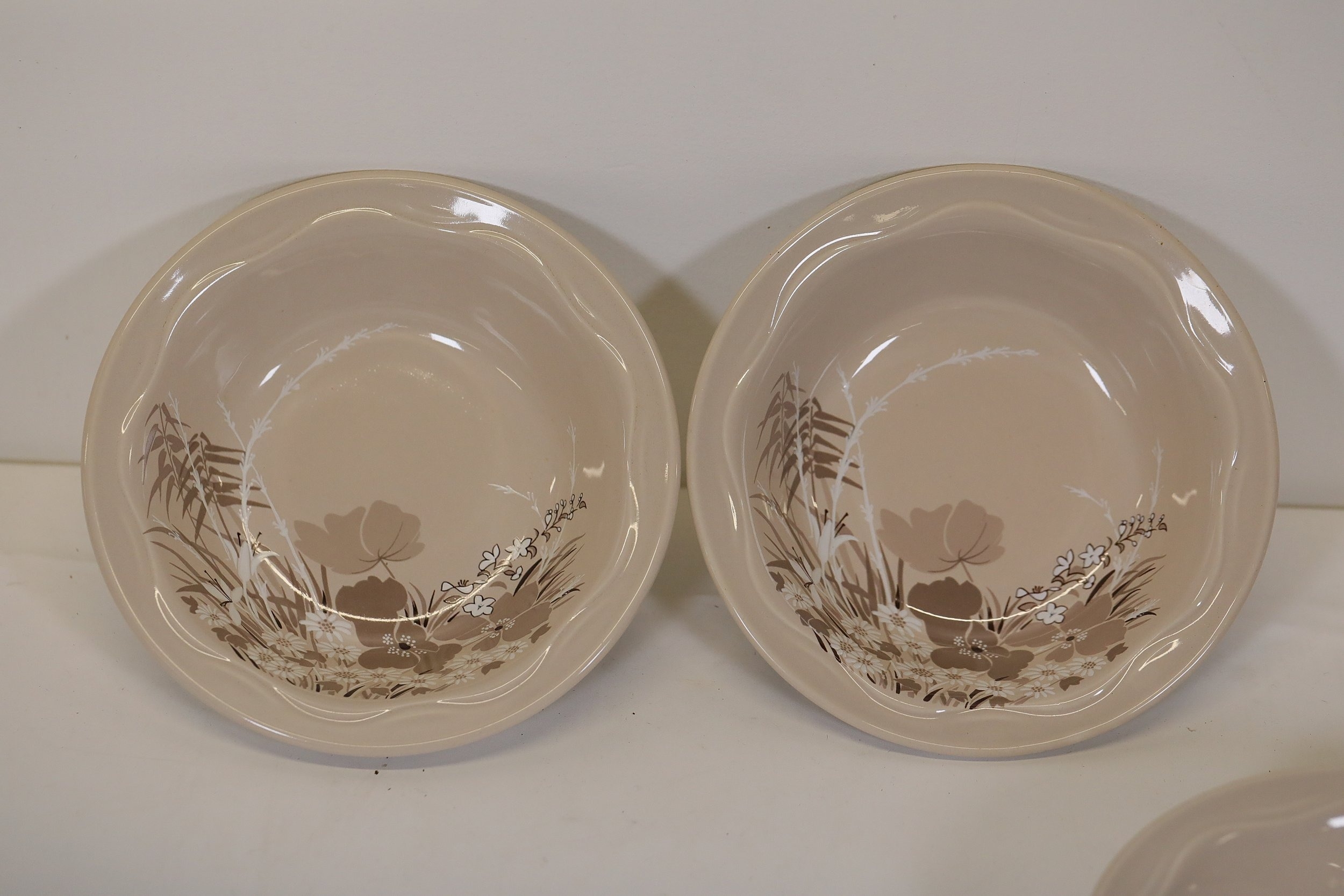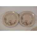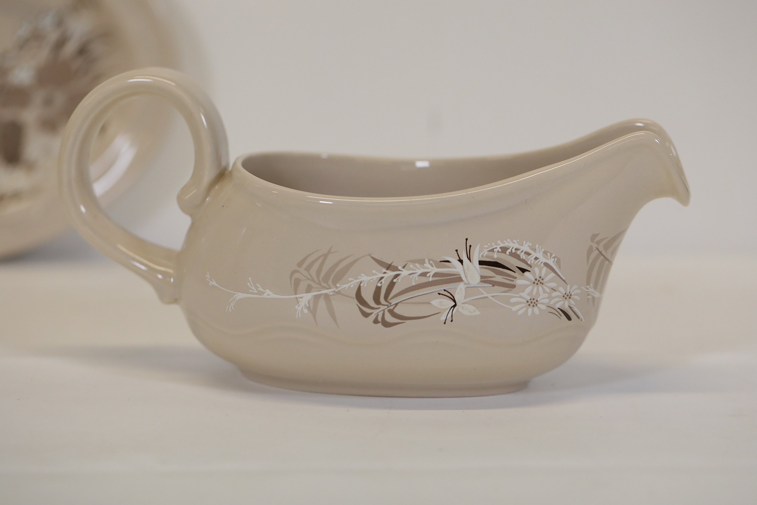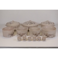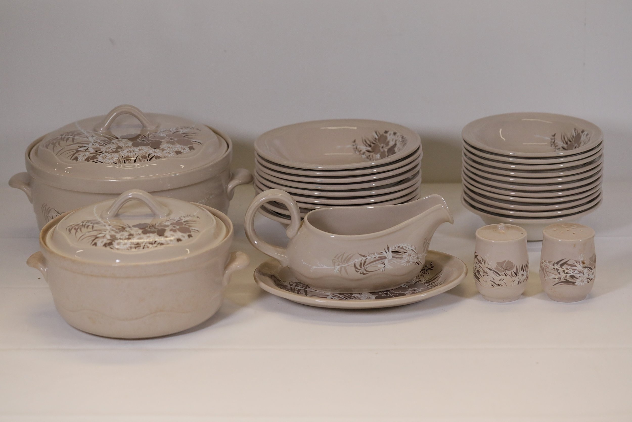 This comprehensive Poole Pottery dinner service set features pieces from the "Mandalay" line, renowned for its elegant floral and foliage designs. The set, crafted in England, includes a variety of essential dining items, each adorned in a distinct pattern with shades of brown and beige, creating a cohesive and charming aesthetic.