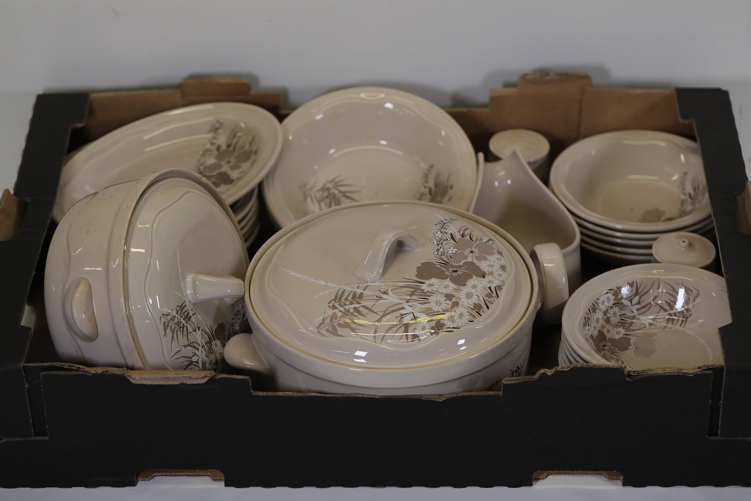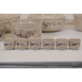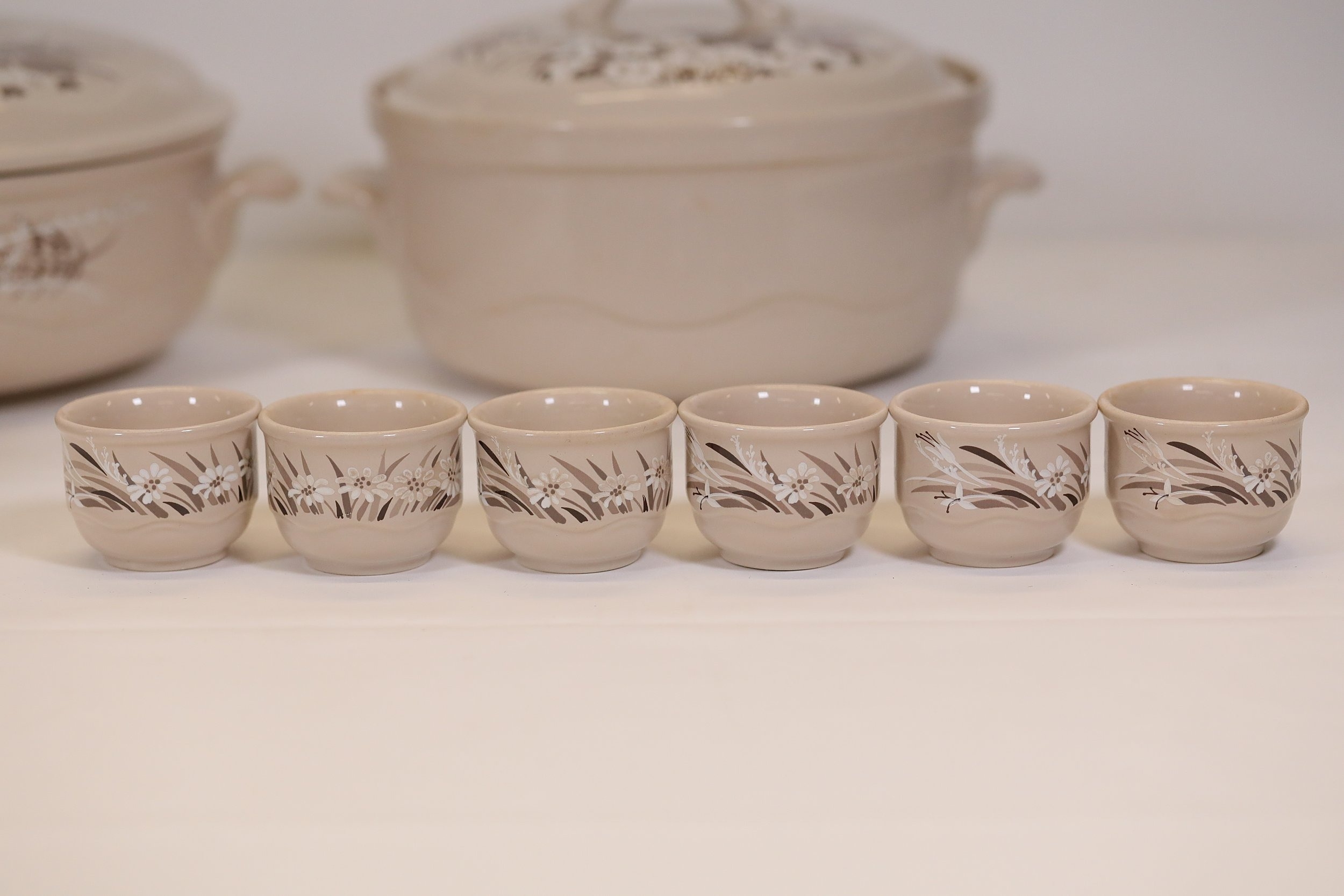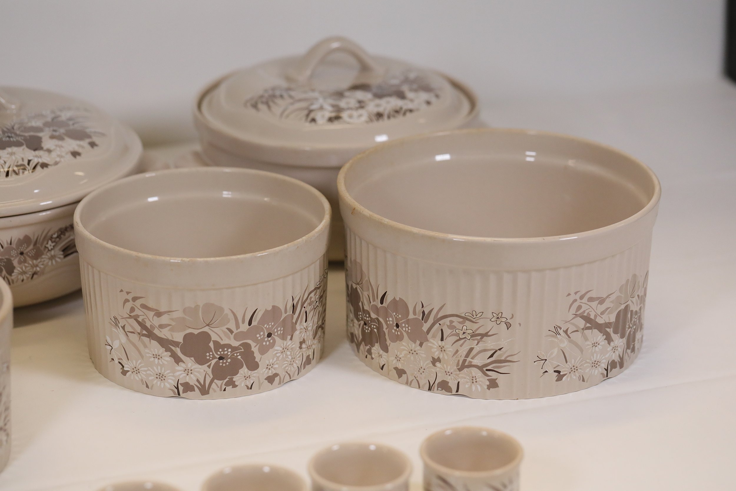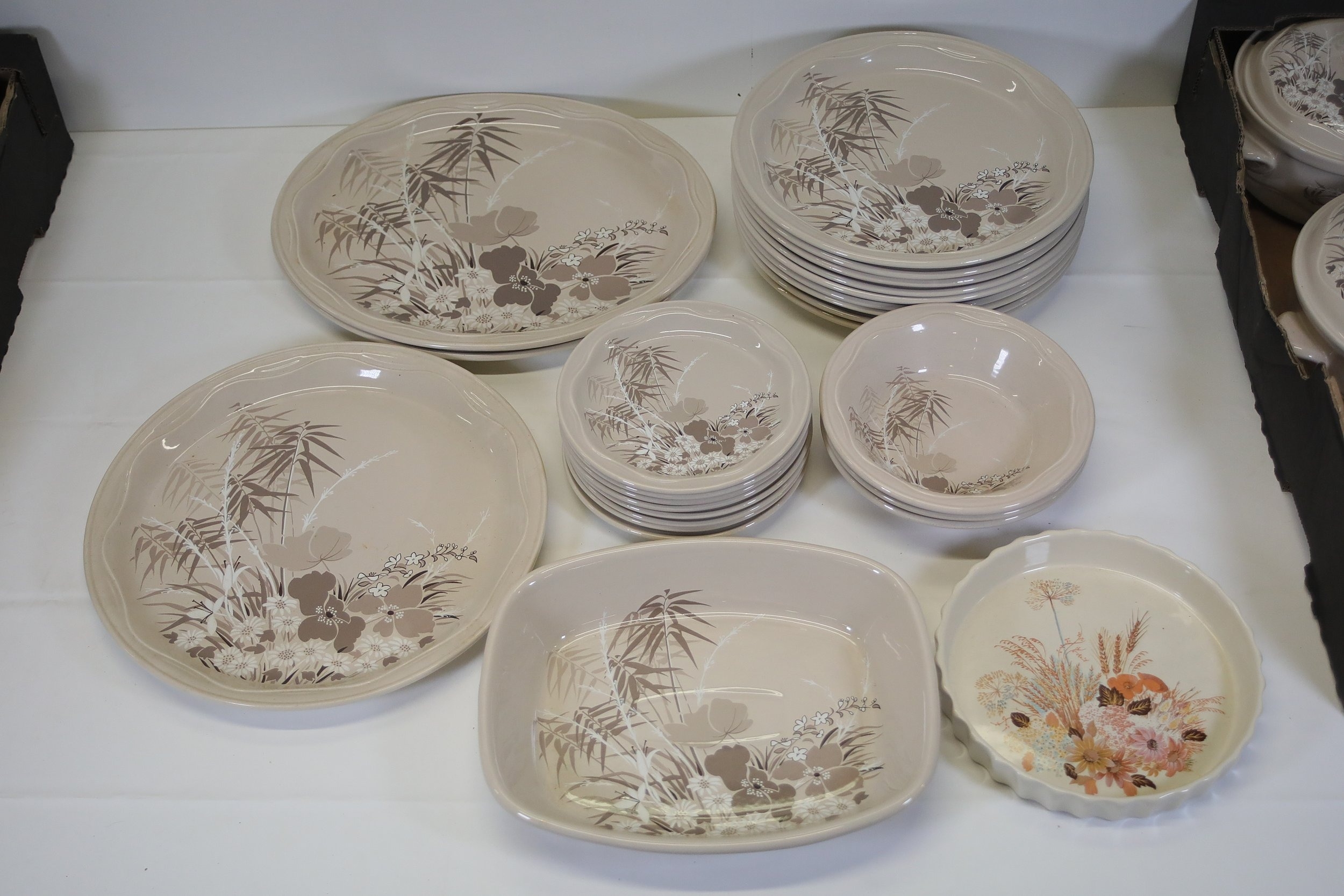 This comprehensive Poole Pottery dinner service set features pieces from the "Mandalay" line, renowned for its elegant floral and foliage designs. The set, crafted in England, includes a variety of essential dining items, each adorned in a distinct pattern with shades of brown and beige, creating a cohesive and charming aesthetic.