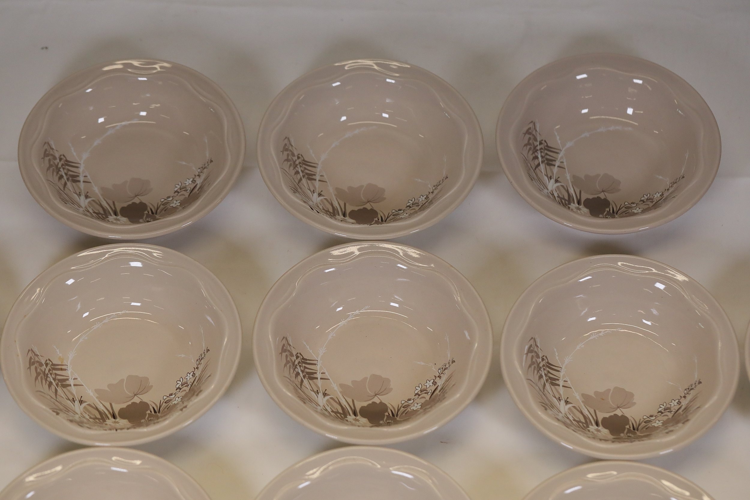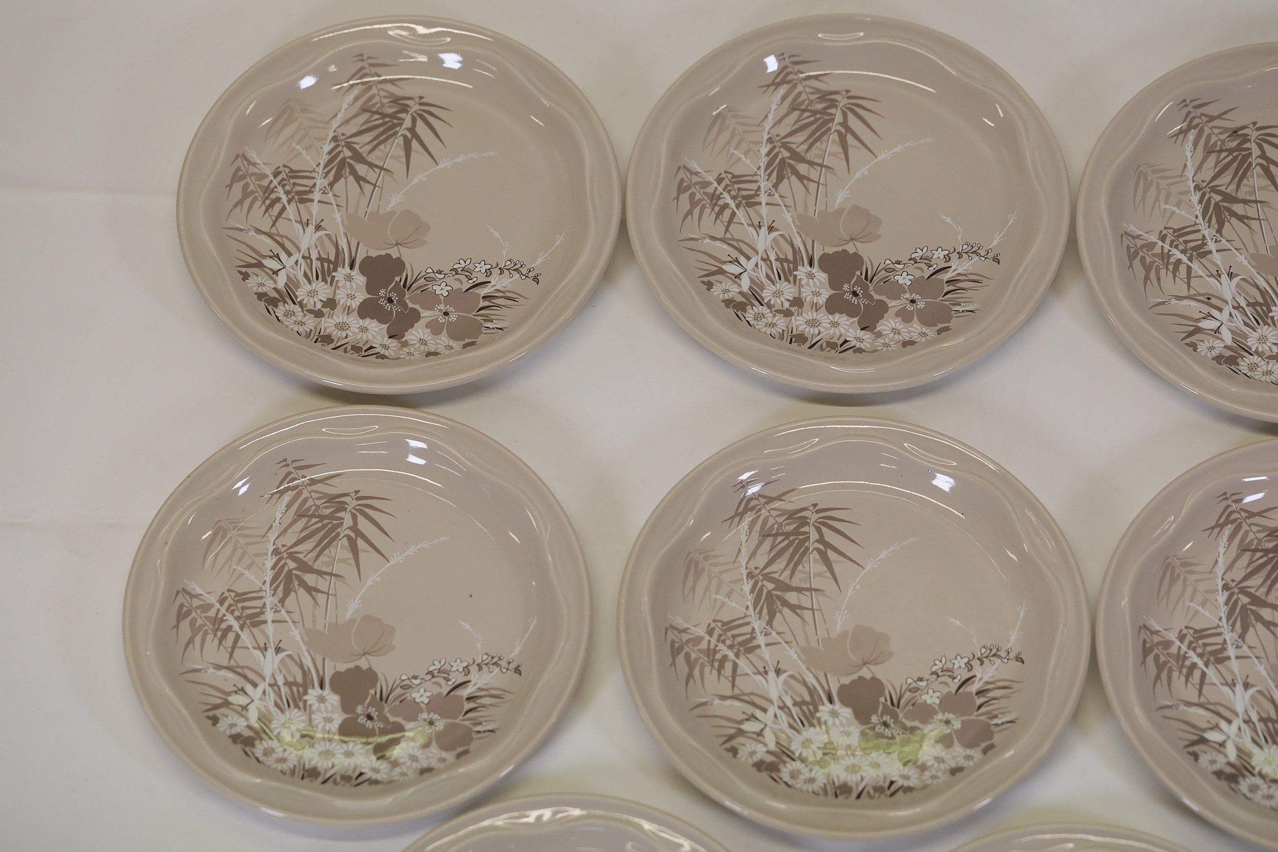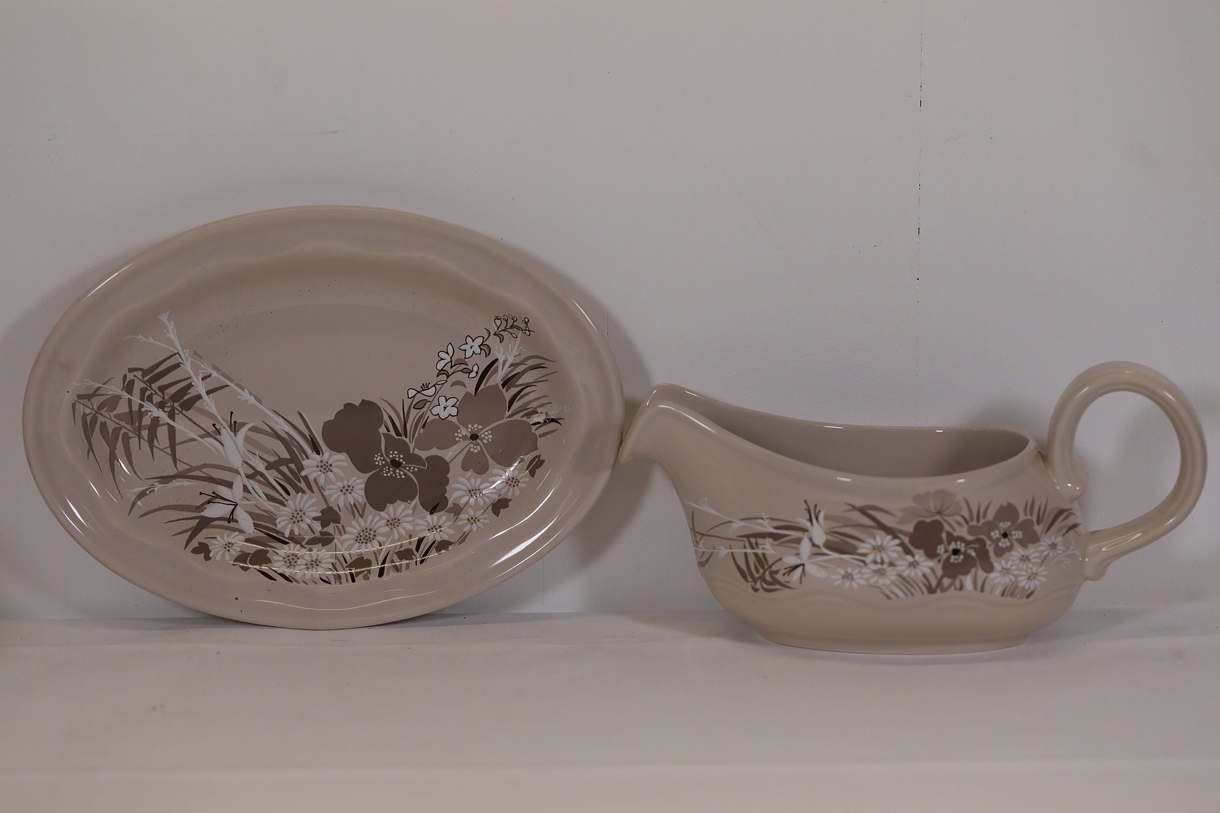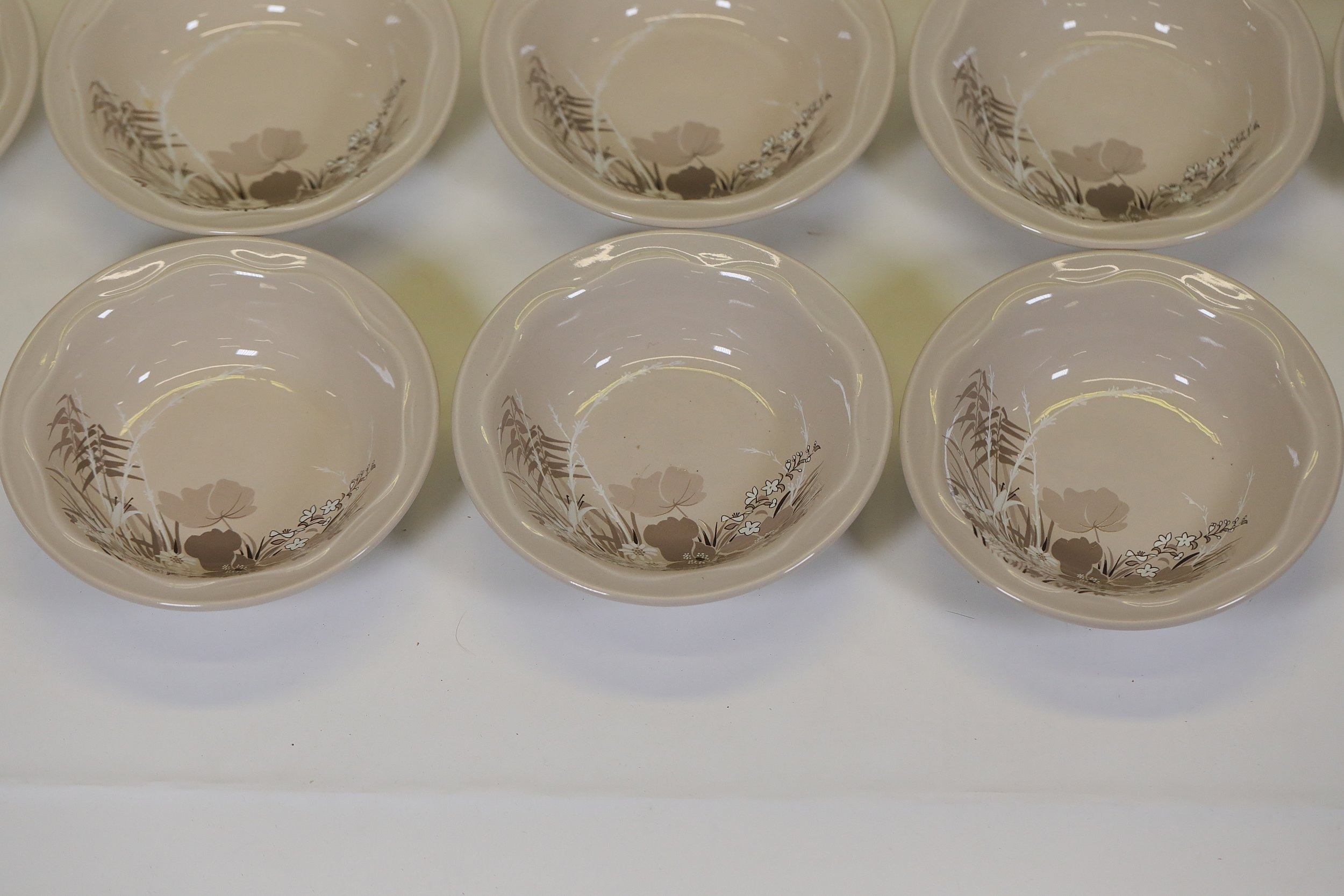 This comprehensive Poole Pottery dinner service set features pieces from the "Mandalay" line, renowned for its elegant floral and foliage designs. The set, crafted in England, includes a variety of essential dining items, each adorned in a distinct pattern with shades of brown and beige, creating a cohesive and charming aesthetic.