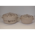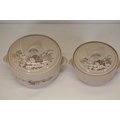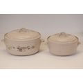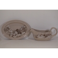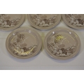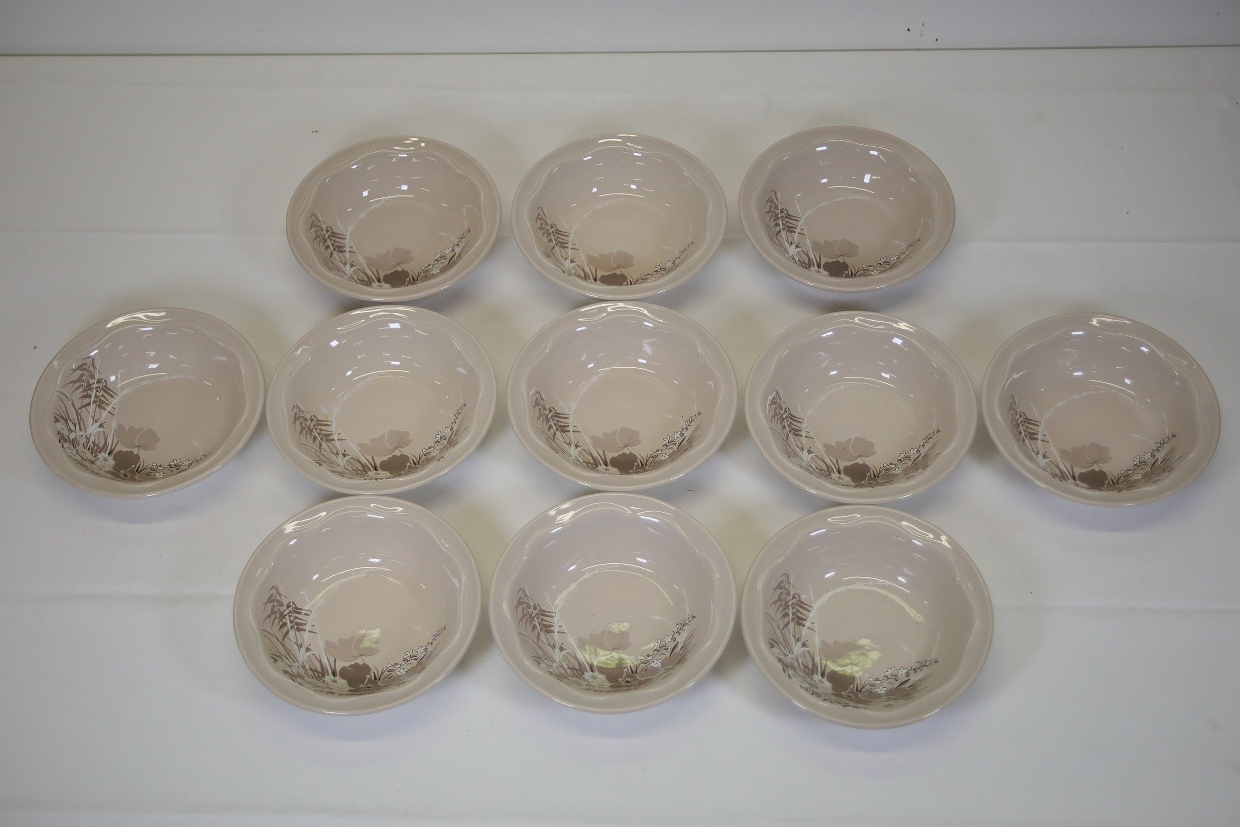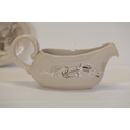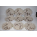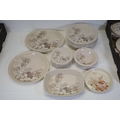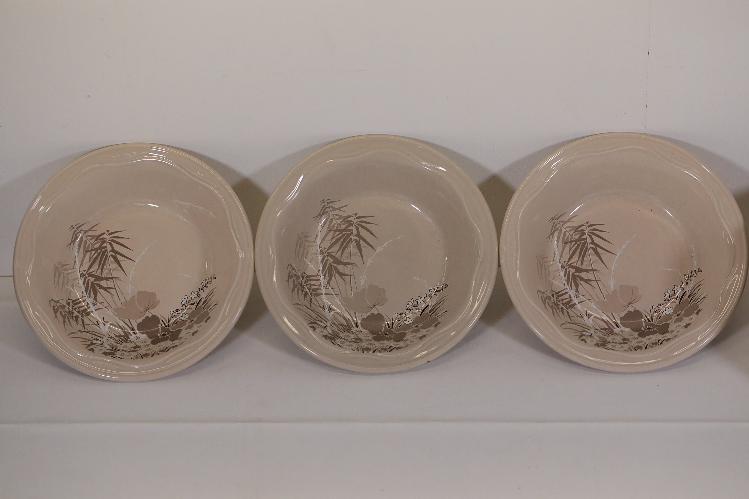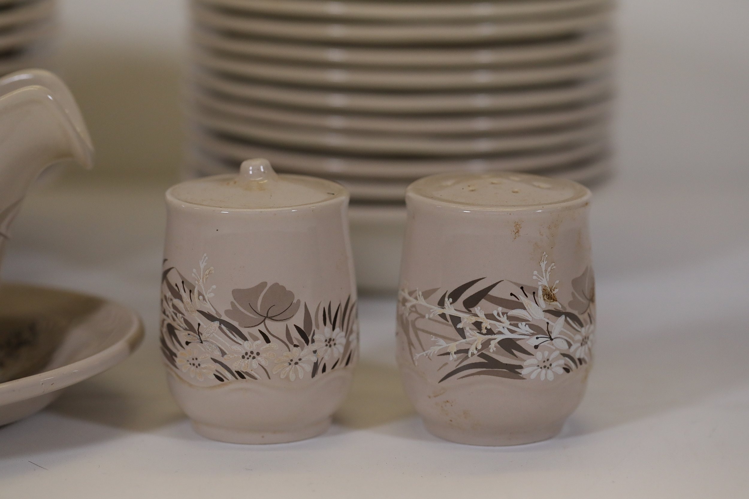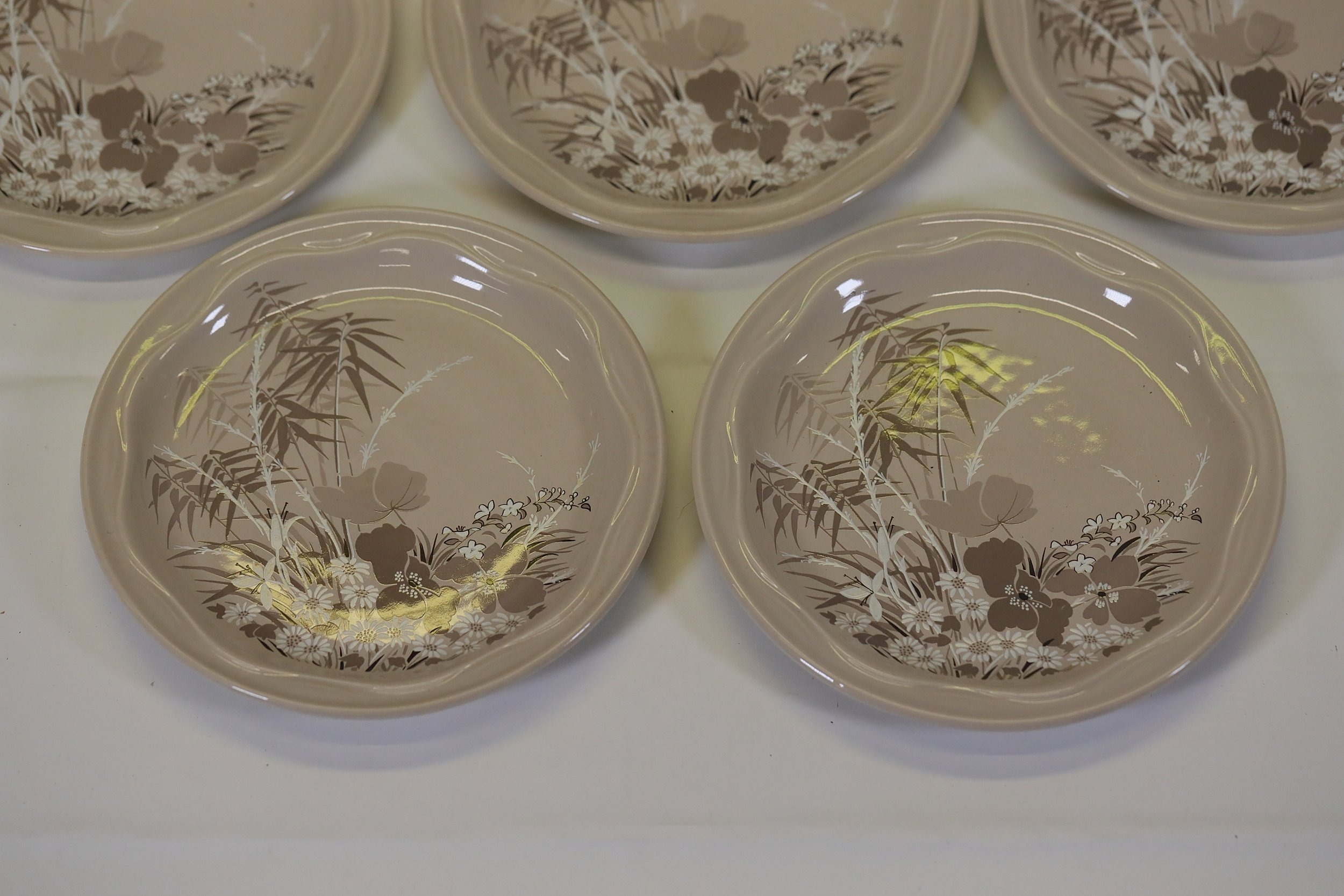 This comprehensive Poole Pottery dinner service set features pieces from the "Mandalay" line, renowned for its elegant floral and foliage designs. The set, crafted in England, includes a variety of essential dining items, each adorned in a distinct pattern with shades of brown and beige, creating a cohesive and charming aesthetic.