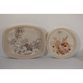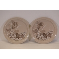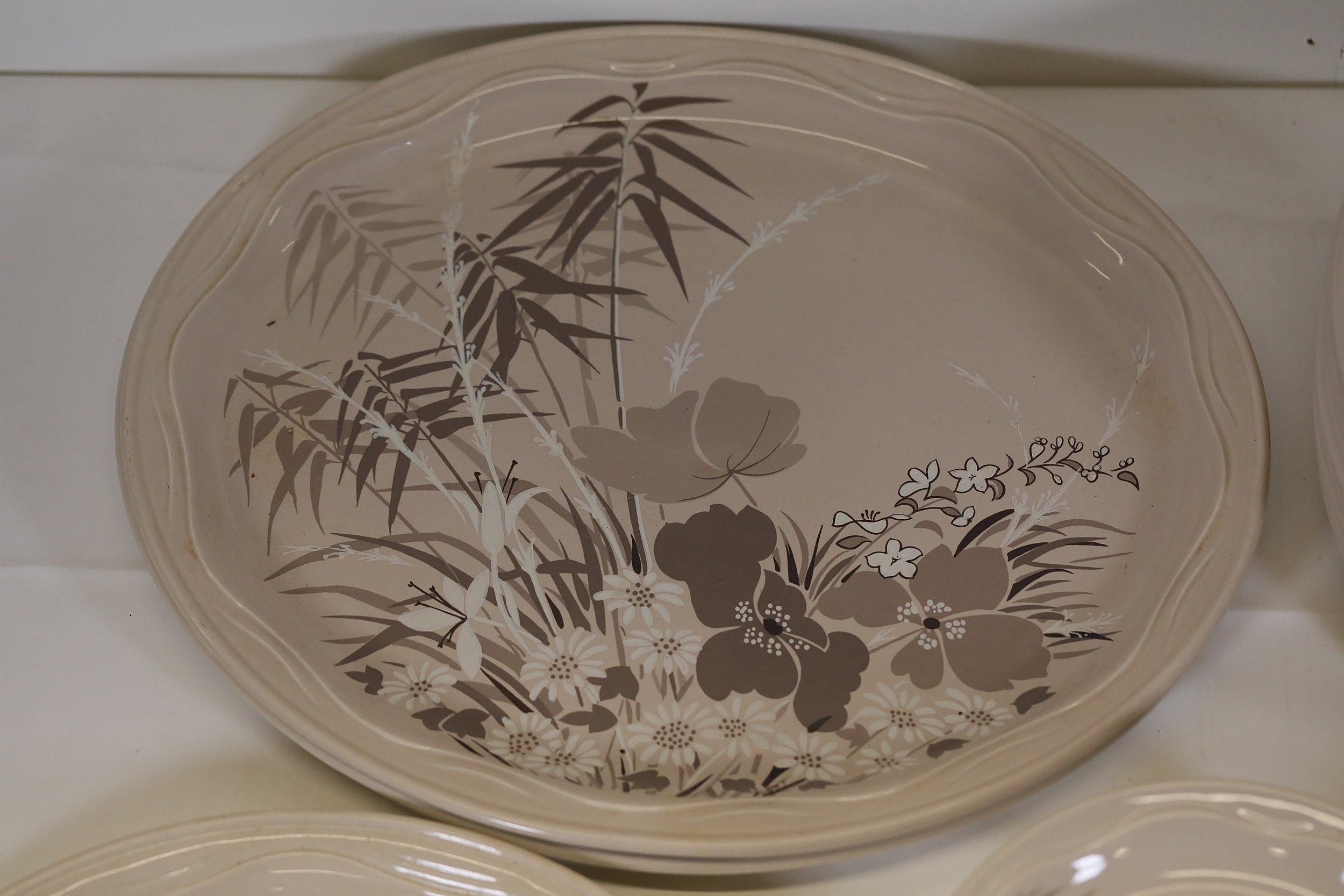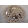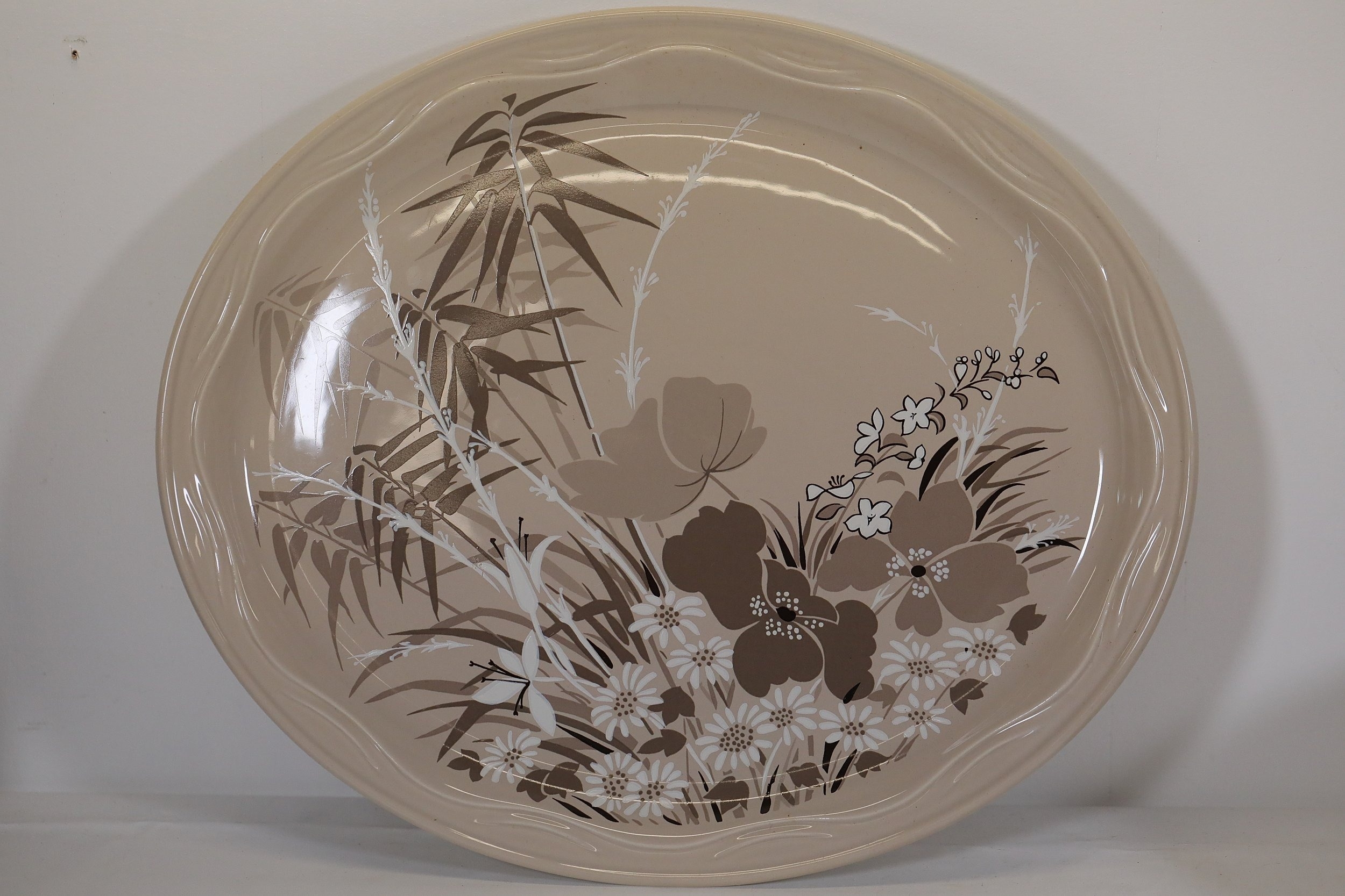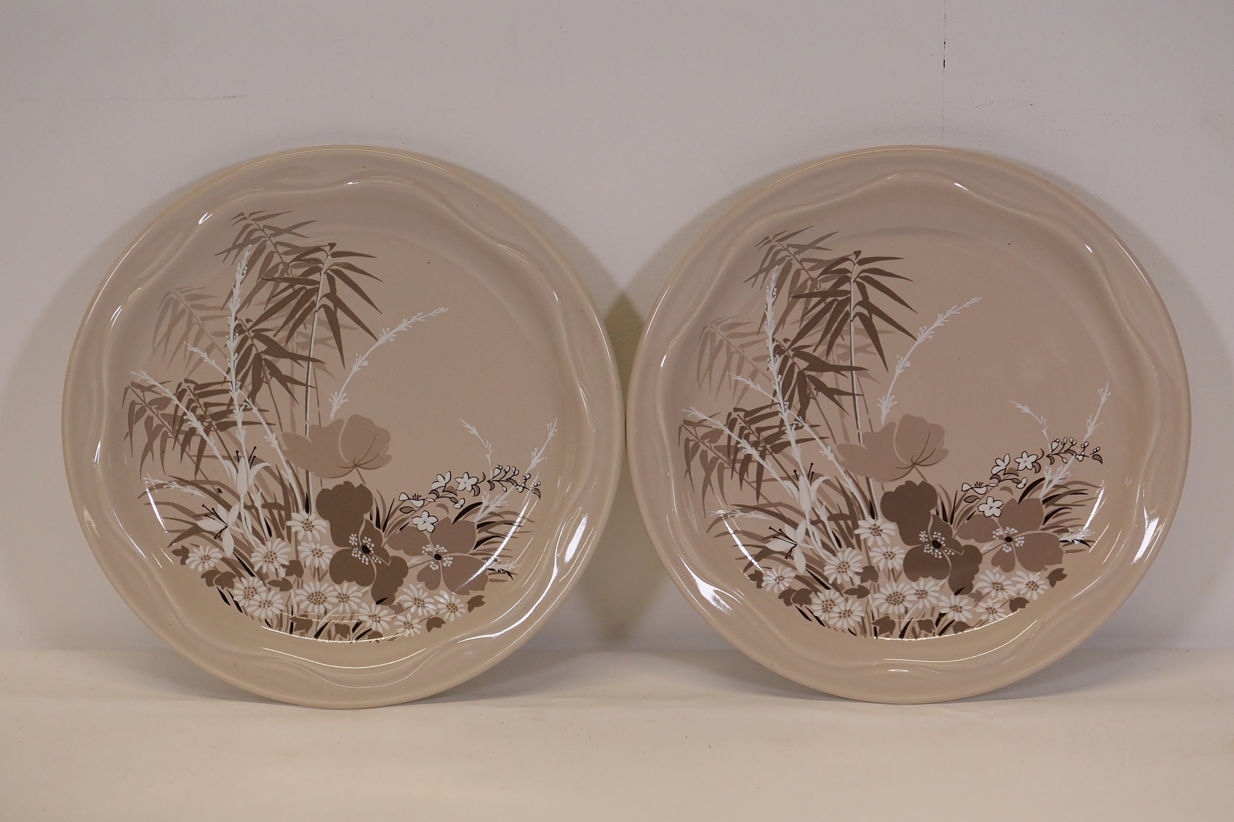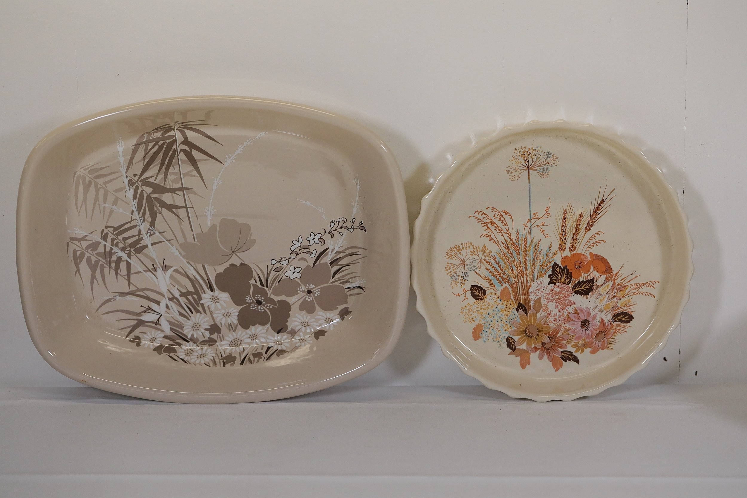 8. **Round Serving Platter**: A round platter with a textured edge and floral design in subdued tones of orange, brown, blue, and beige.