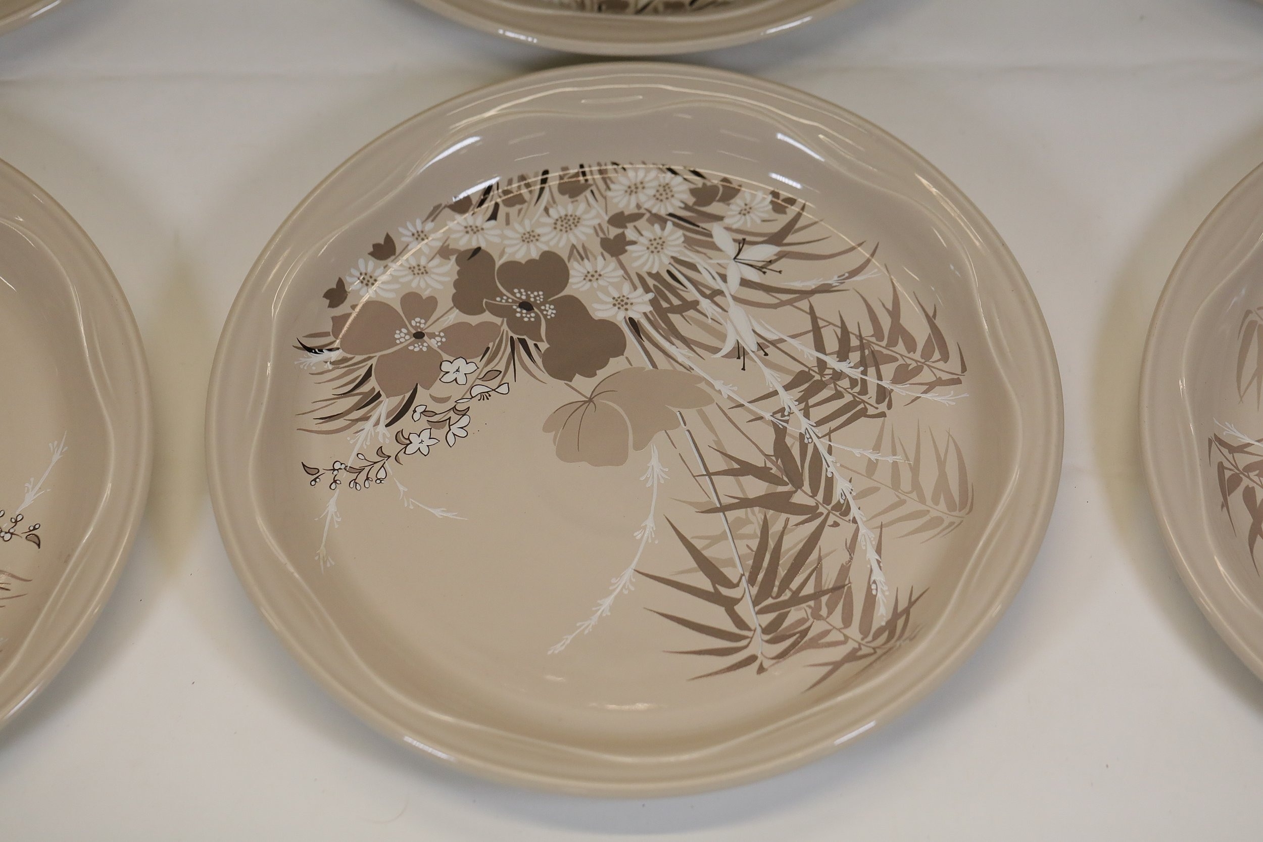 6. **Fluted Round Dish**: A unique round, fluted dish adorned with a floral pattern in shades of orange and brown, adding a touch of variety to the set.
