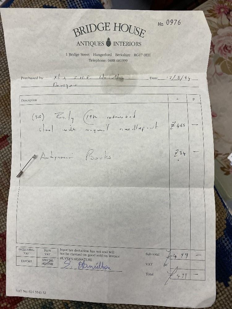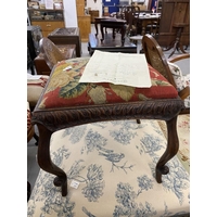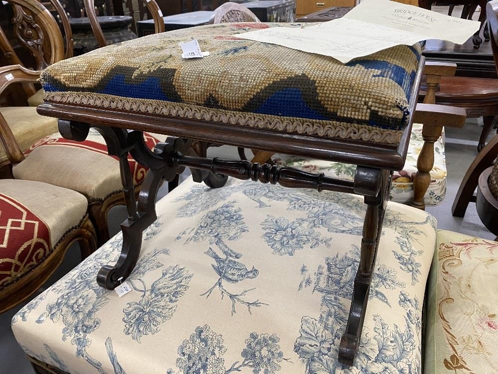 Early 19th cent. Rosewood cabriole cross stretcher footstool with floral needlepoint upholstery.