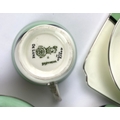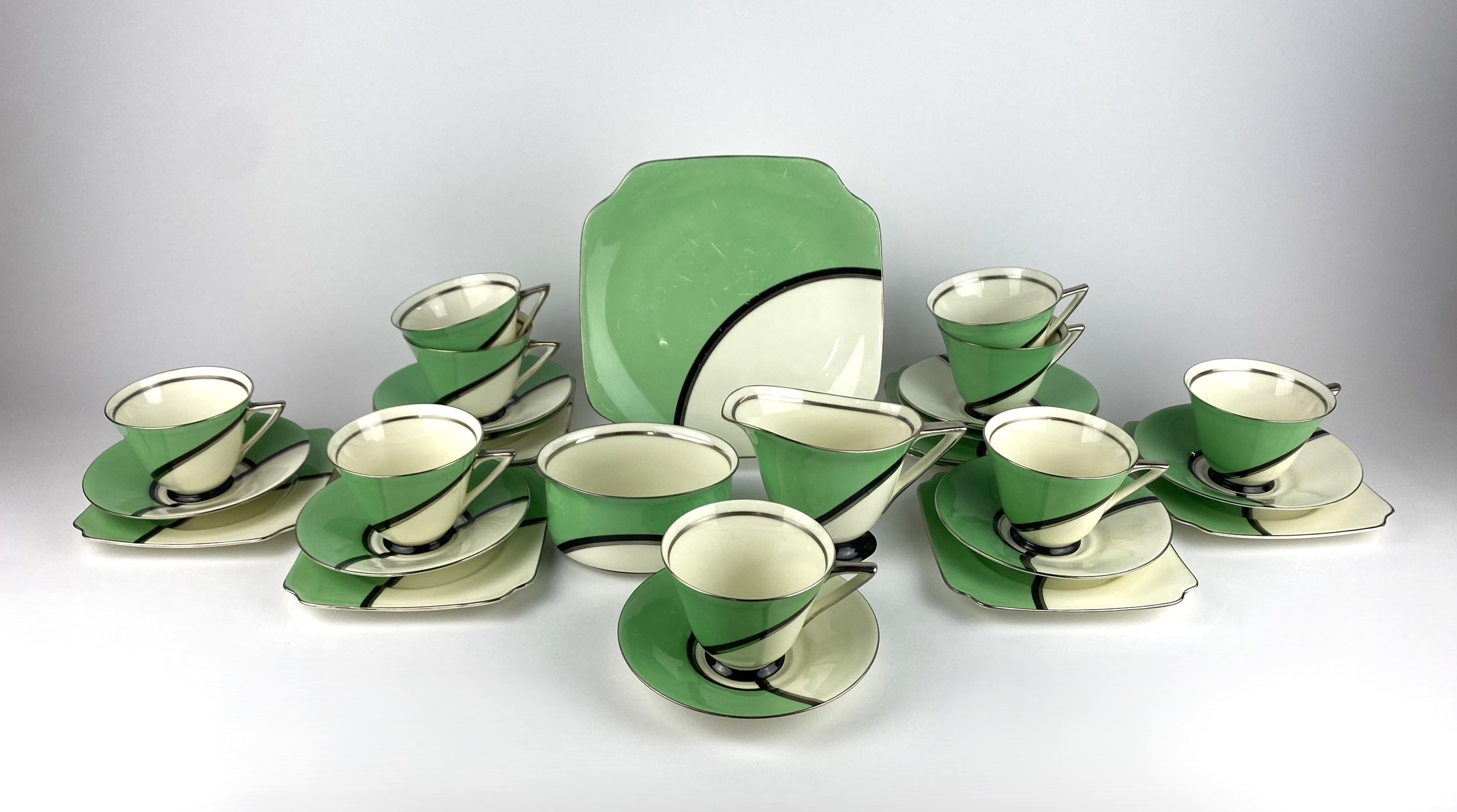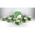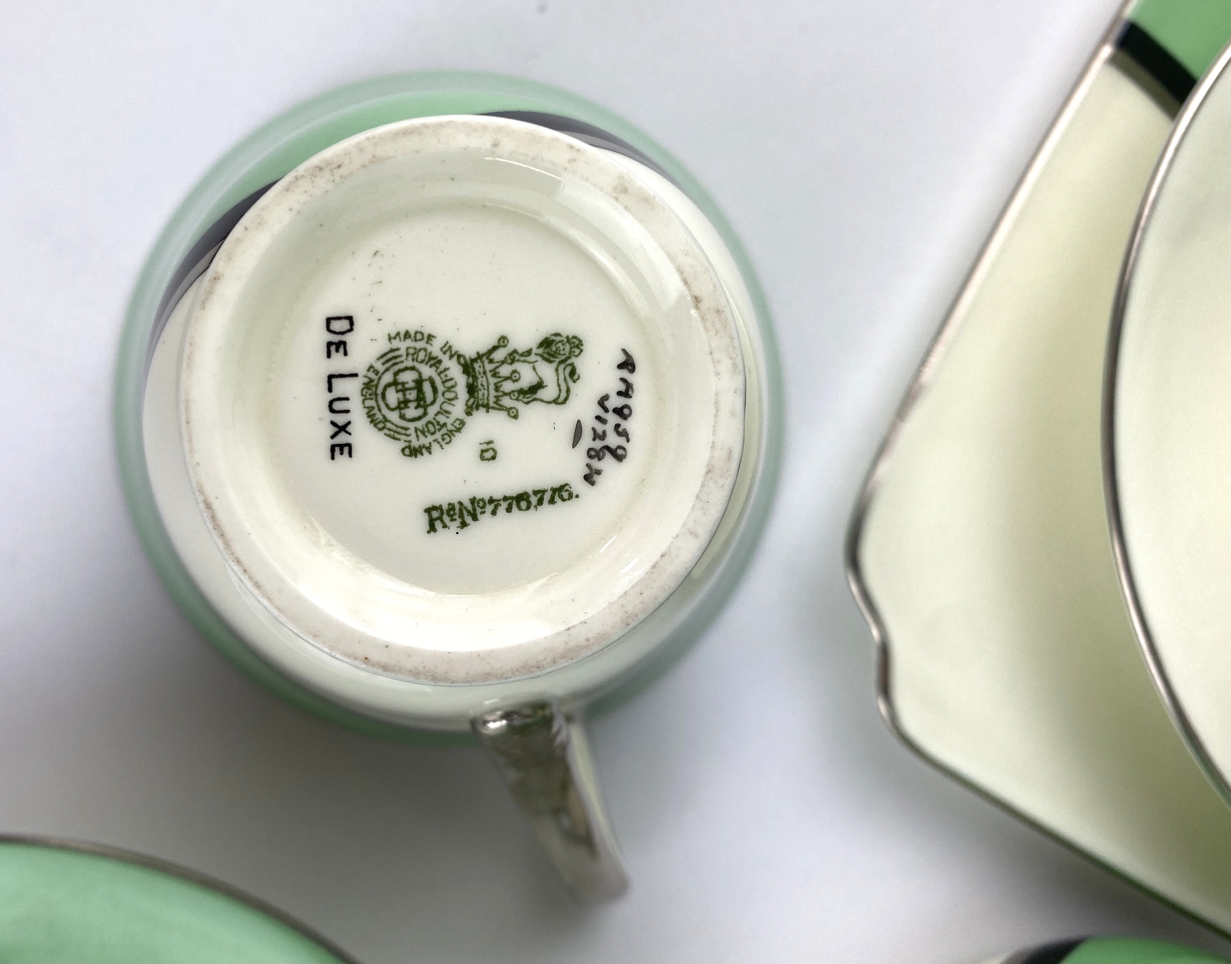 An Art Deco Royal Doulton 'De Luxe' pattern part tea service in white and green, with silver and black banding, comprising cream jug, sugar bowl, nine cups and saucers, eight small plates and one sandwich plate (a/f)