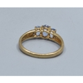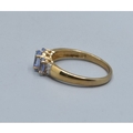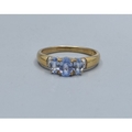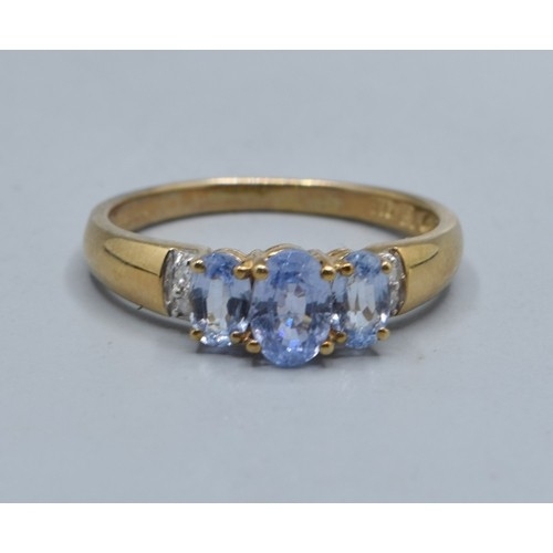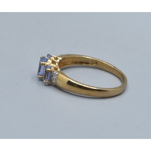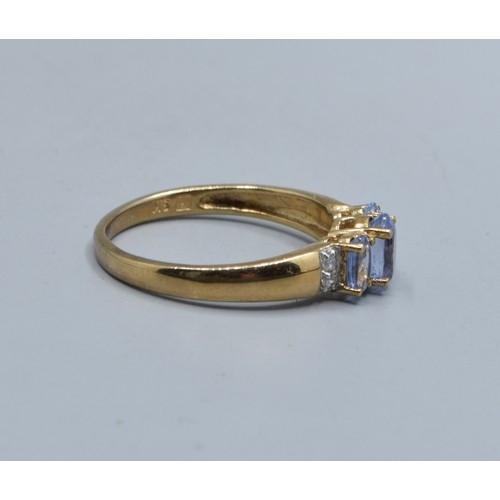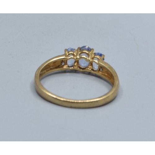 9ct gold ladies 3 stone Tanzanite graduating size ring decorated to the shoulders with accent Diamonds size P, 2.2grams