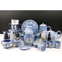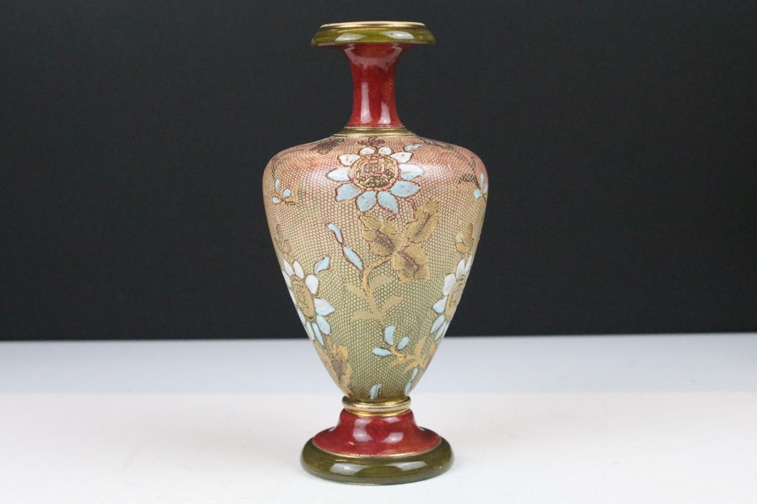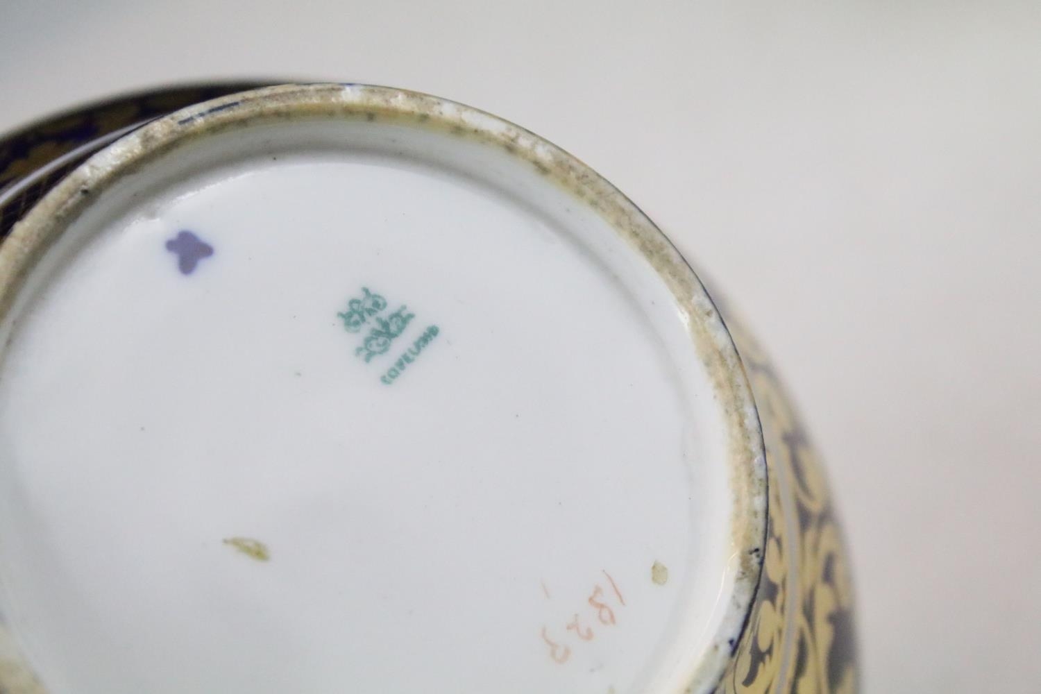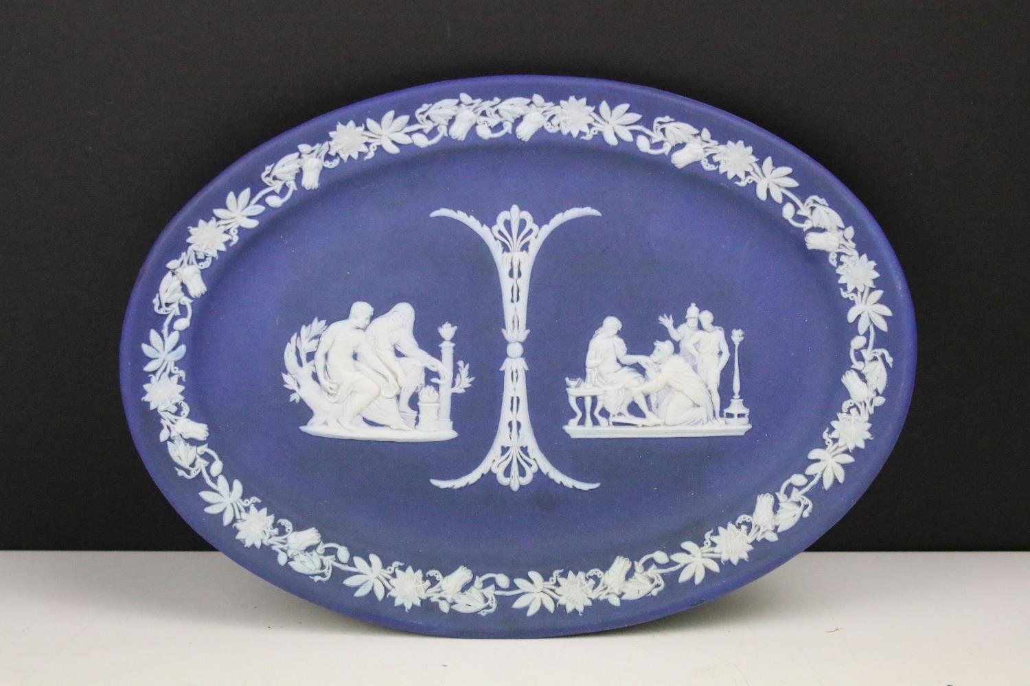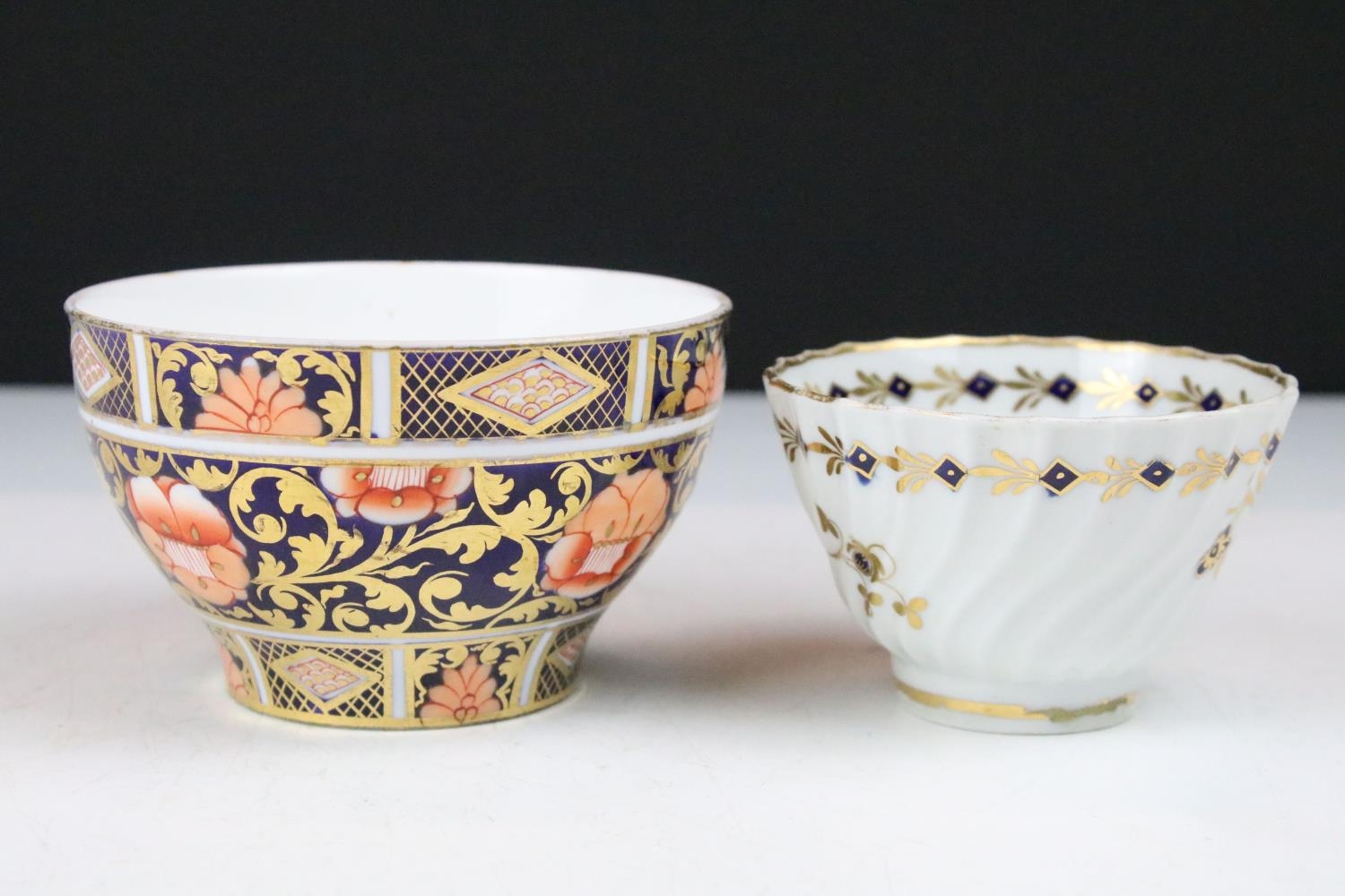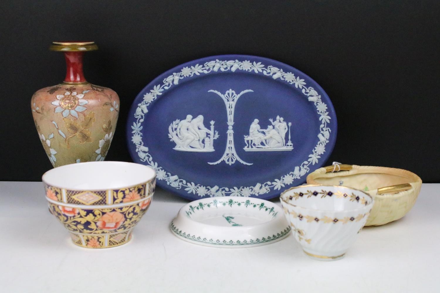Mixed lot of Antique Ceramics including Worcester Ribbed Tea Bowl, 19th century Copeland Imari and Gilt Bowl, 19th century Wedgwood Dark Blue Jasperware Oval Plate, Doulton Lambeth Stoneware Baluster Vase, Royal Worcester Blush Ivory Basket Weave Bowl and Royal Worcester ' Tolly ' Trinket Dish