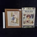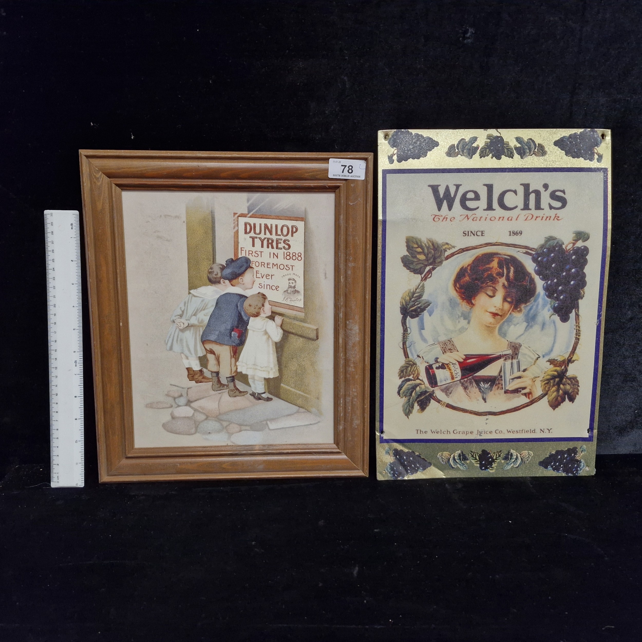 A vintage printed foil showcard advertising 'Welch's Grape Juice'. Lot also includes a framed vintage print featuring 'Dunlop Tyres'.