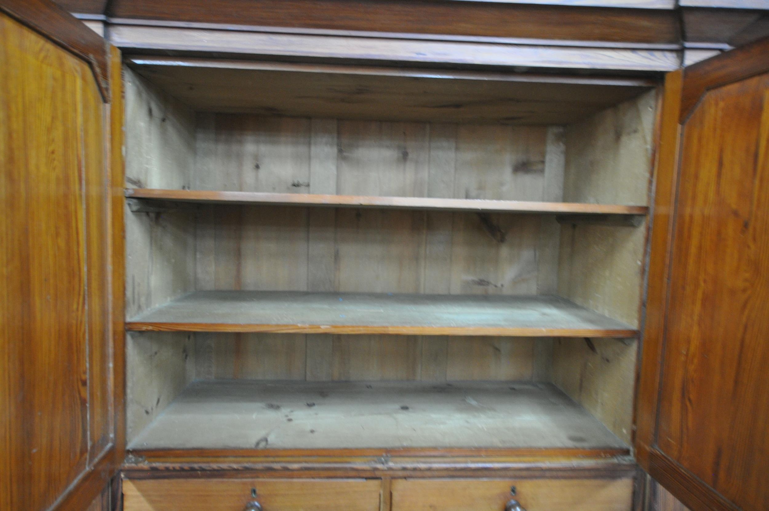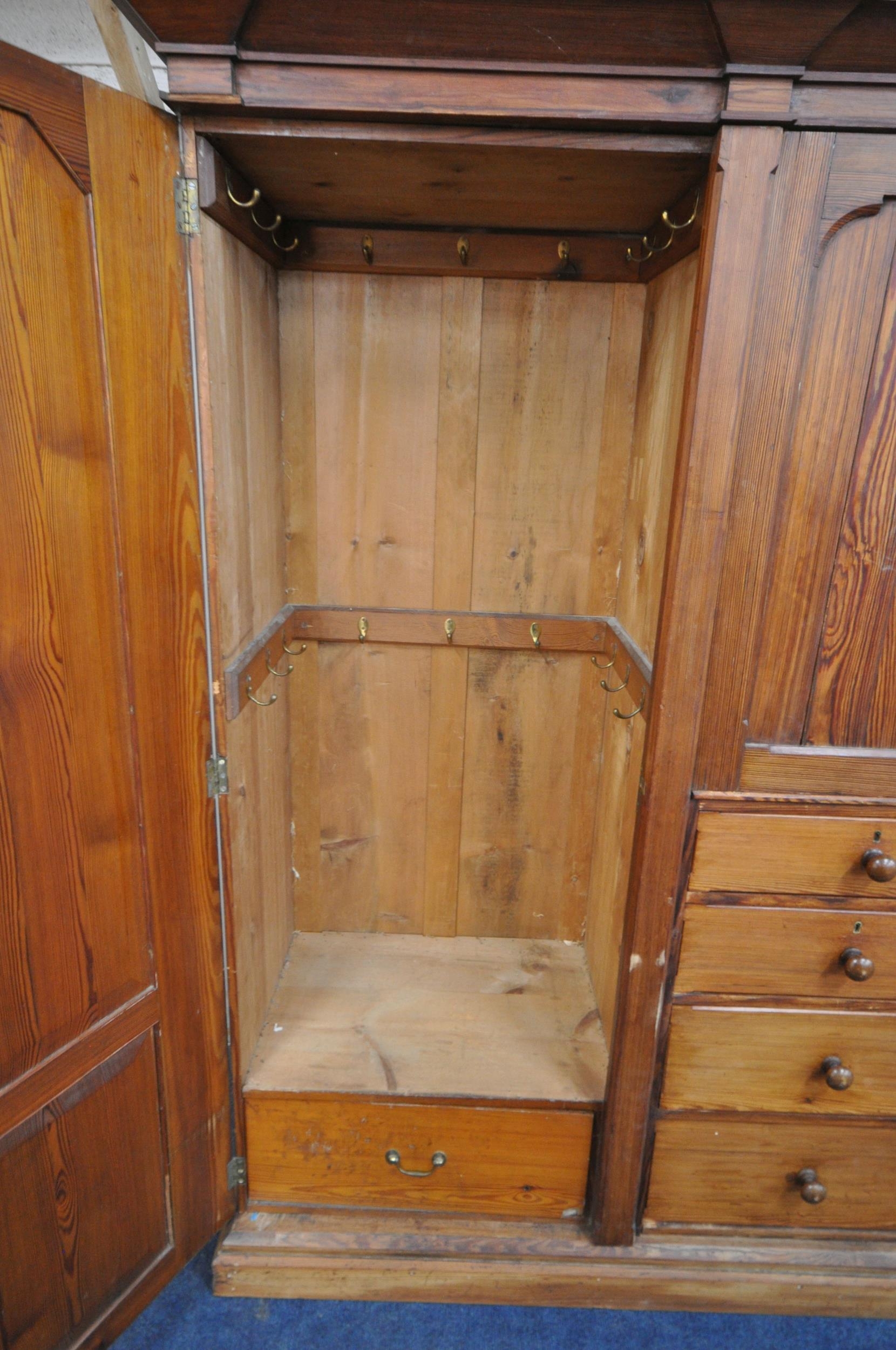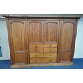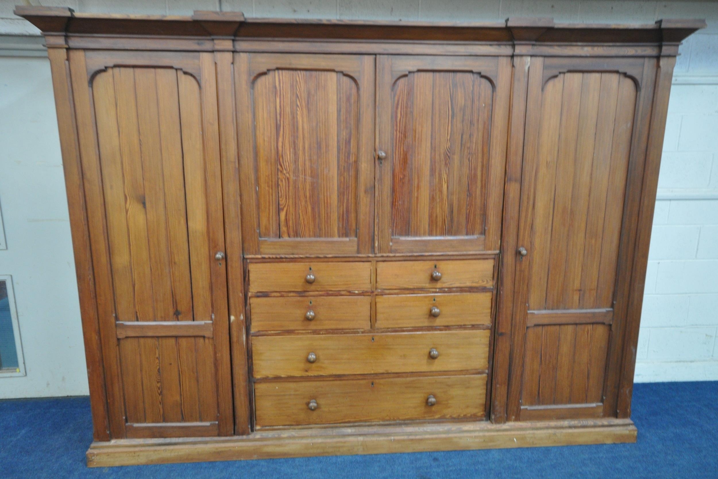 A 19TH CENTURY PITCH PINE WARDROBE, fitted with two large doors, flanking smaller double doors over six assorted drawers, width 289cm x depth 61cm x height 210cm, condition report: beading missing to the cornice, historical marks, scuffs, discolouration, other wear and usage
