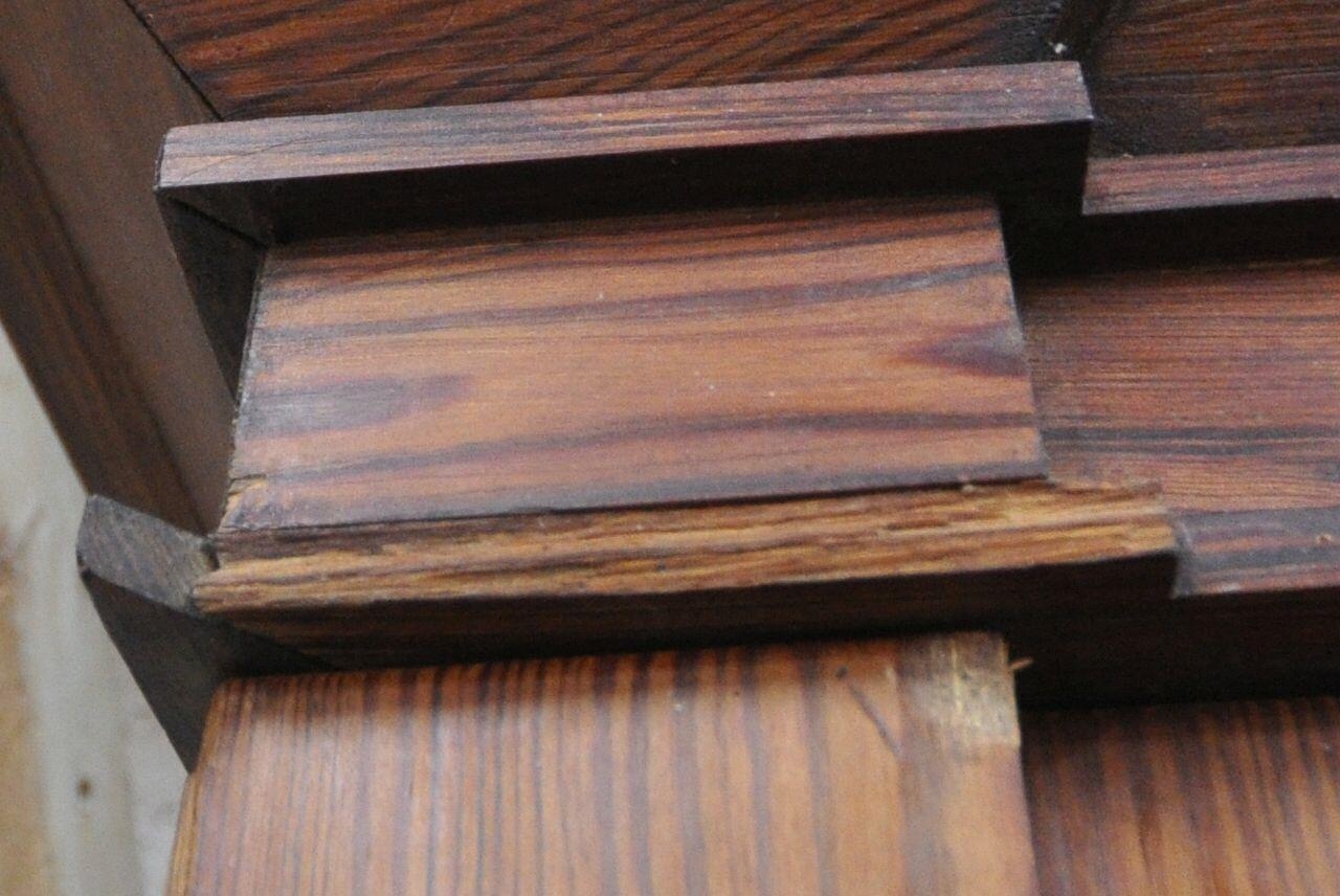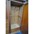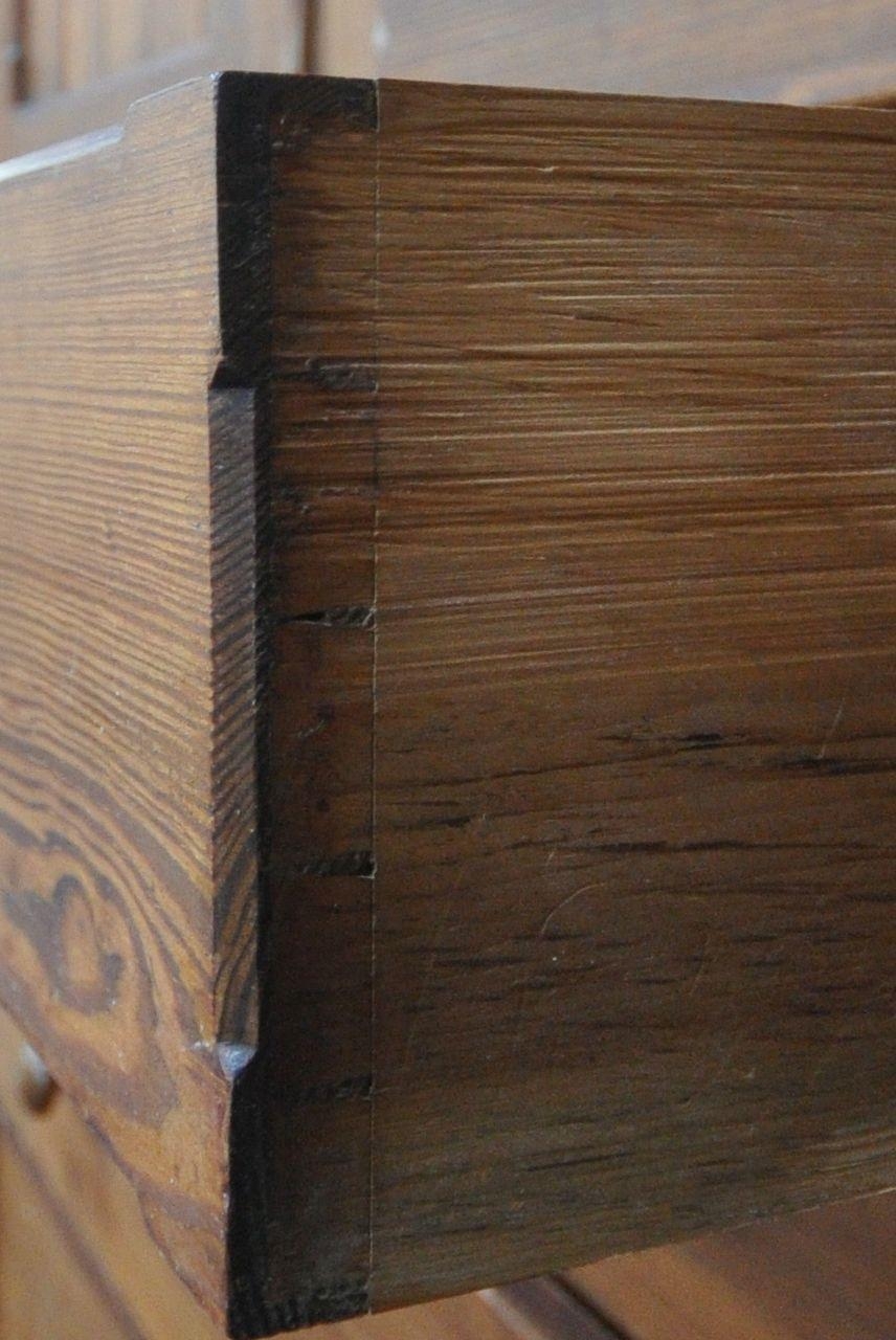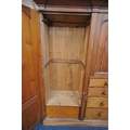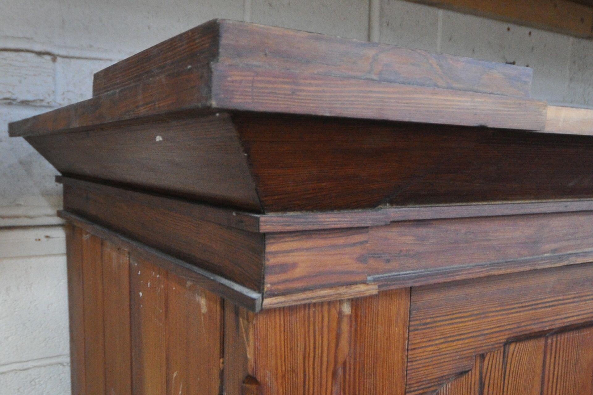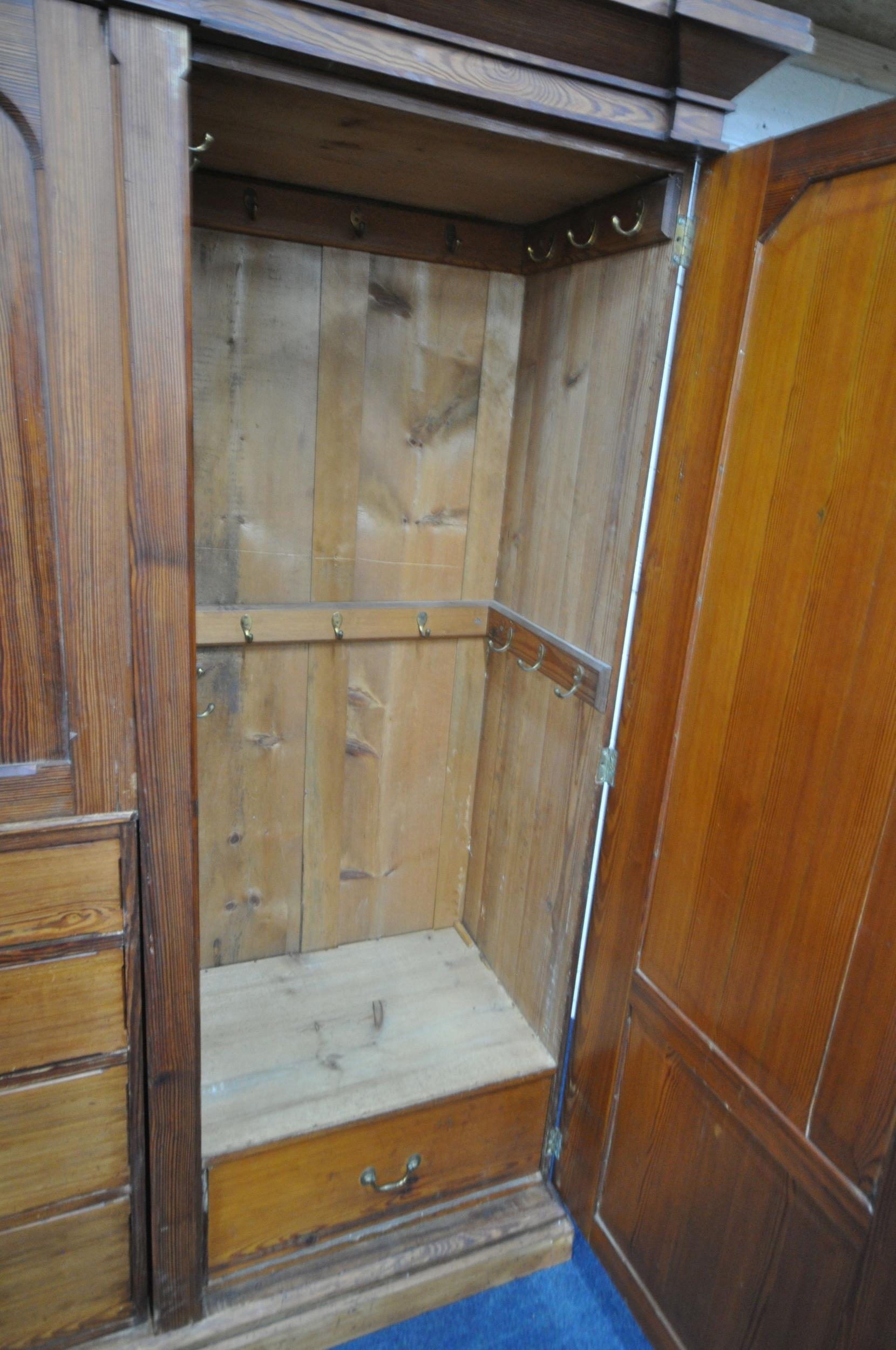 A 19TH CENTURY PITCH PINE WARDROBE, fitted with two large doors, flanking smaller double doors over six assorted drawers, width 289cm x depth 61cm x height 210cm, condition report: beading missing to the cornice, historical marks, scuffs, discolouration, other wear and usage