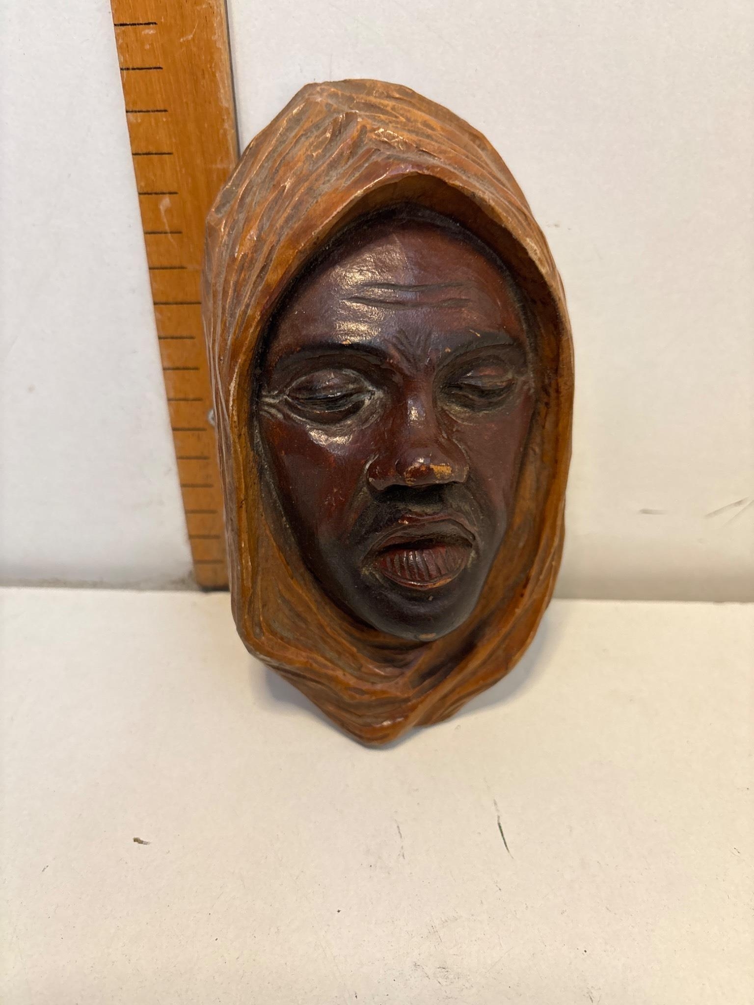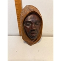 Hand-carved wooden bust depicting a hooded figure. Smooth features and detailed work.