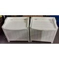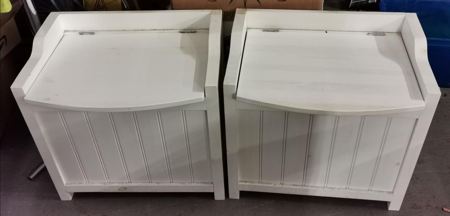 Pair of 56 x 42 x 54 cm tall white wooden hinged lid storage cabinets