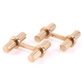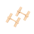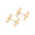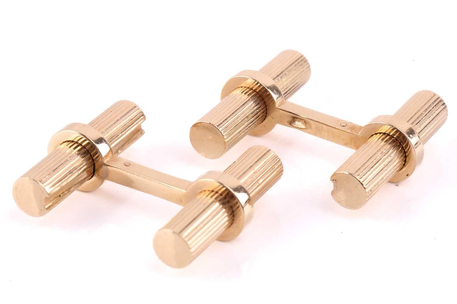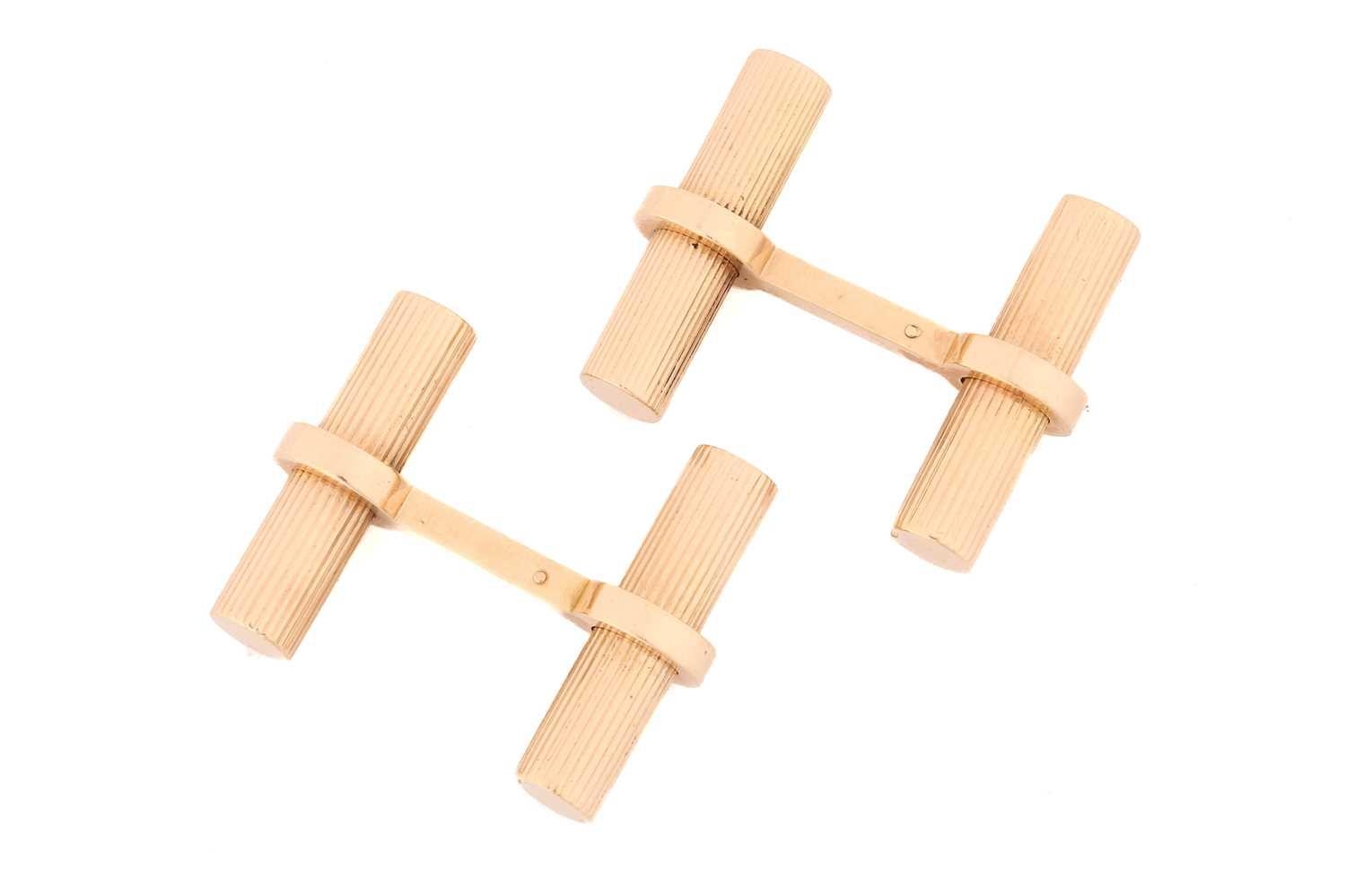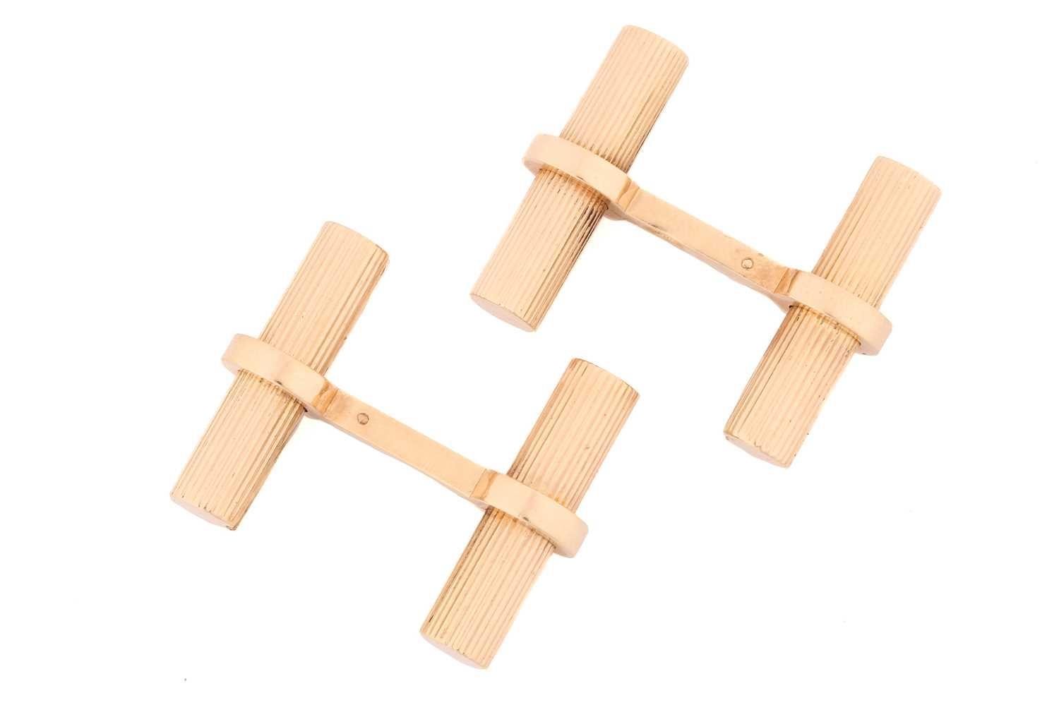 A pair of cufflinks in the style of Cartier; the yellow metal baton links, fluted and held in place with polished roundels. Rigid bar links. metal testing as 14ct, 14.1 grams