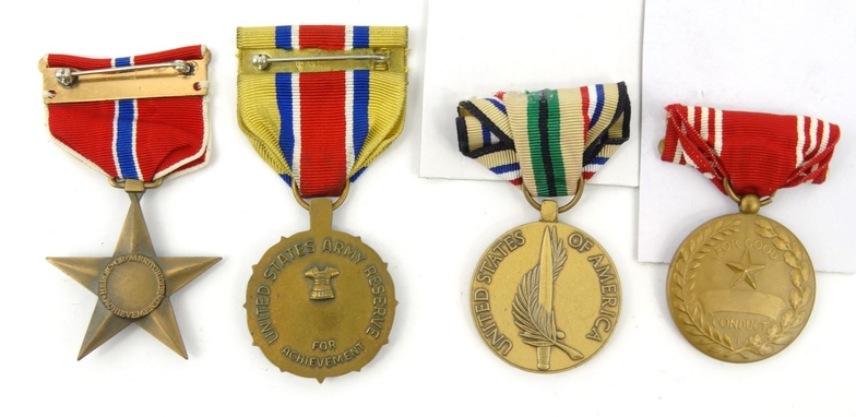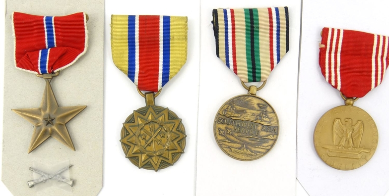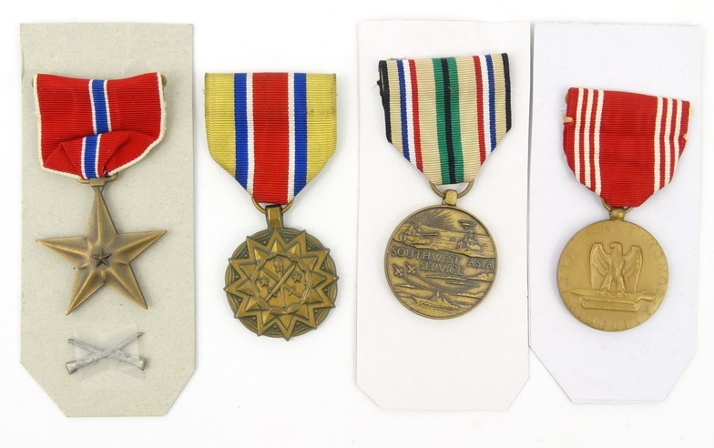 Four military interest American medals - Bronze Star for Gallantry, Southwest Asia Service medal, US Army Reserve, Components Achievement medal and Good Conduct medal