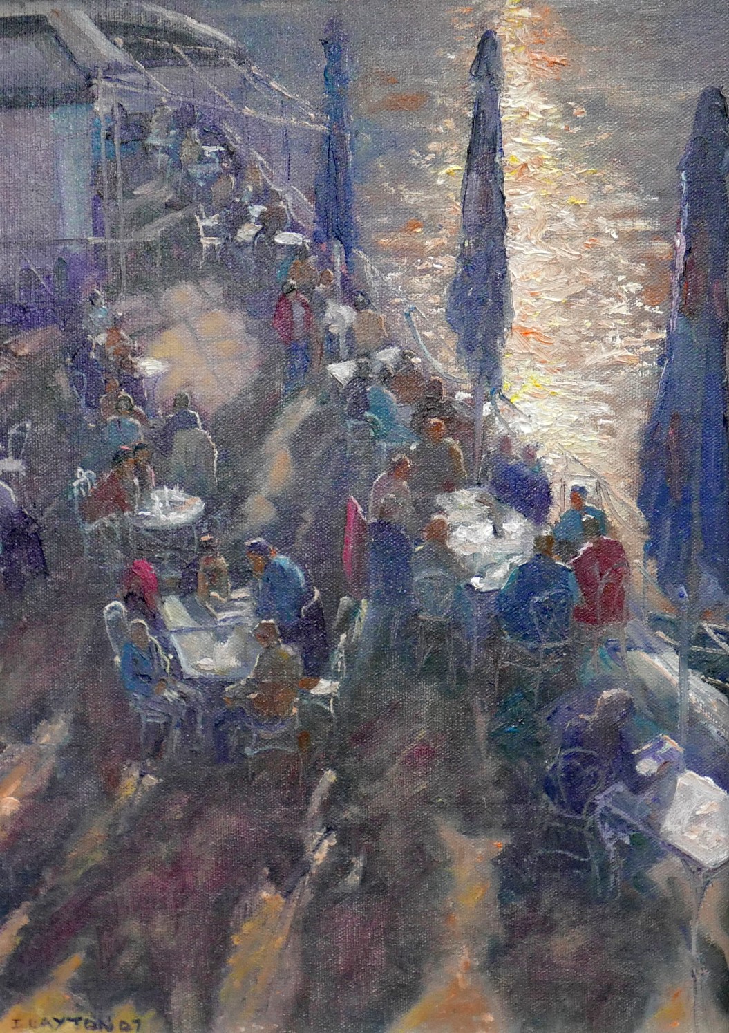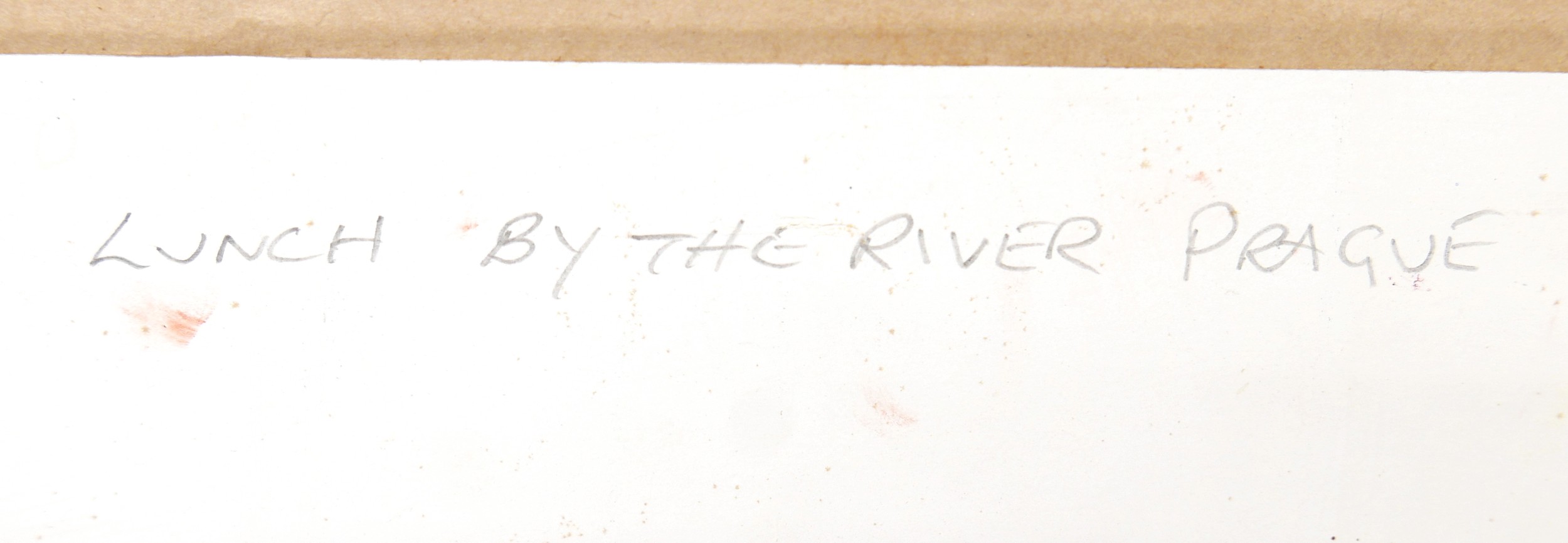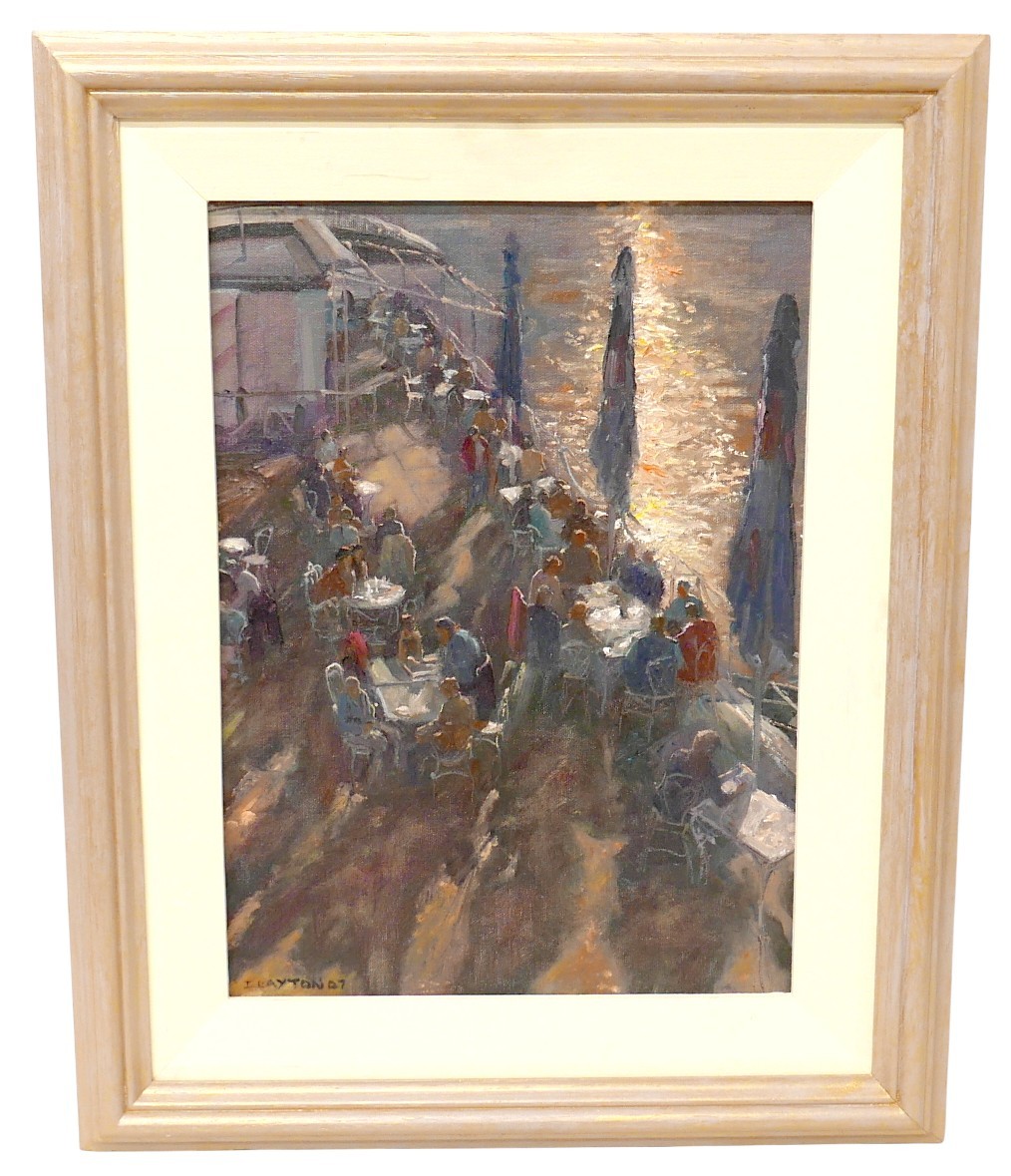 Ian Layton (British, b. 1953): Lunch by the River, Prague, oil on canvas, framed, signed I. Layton 07 lower right, 52 by 42cm.
