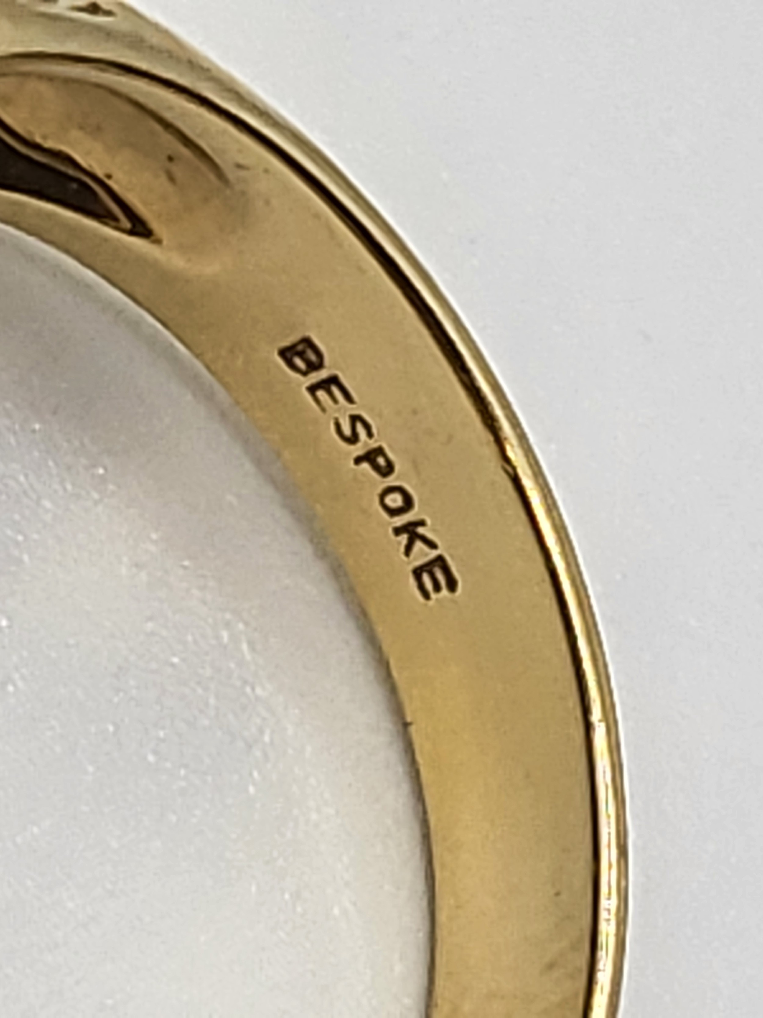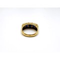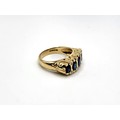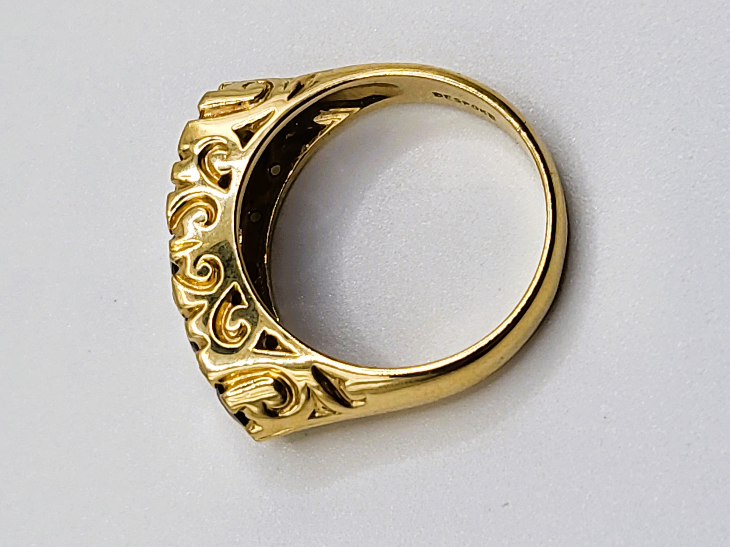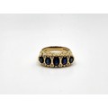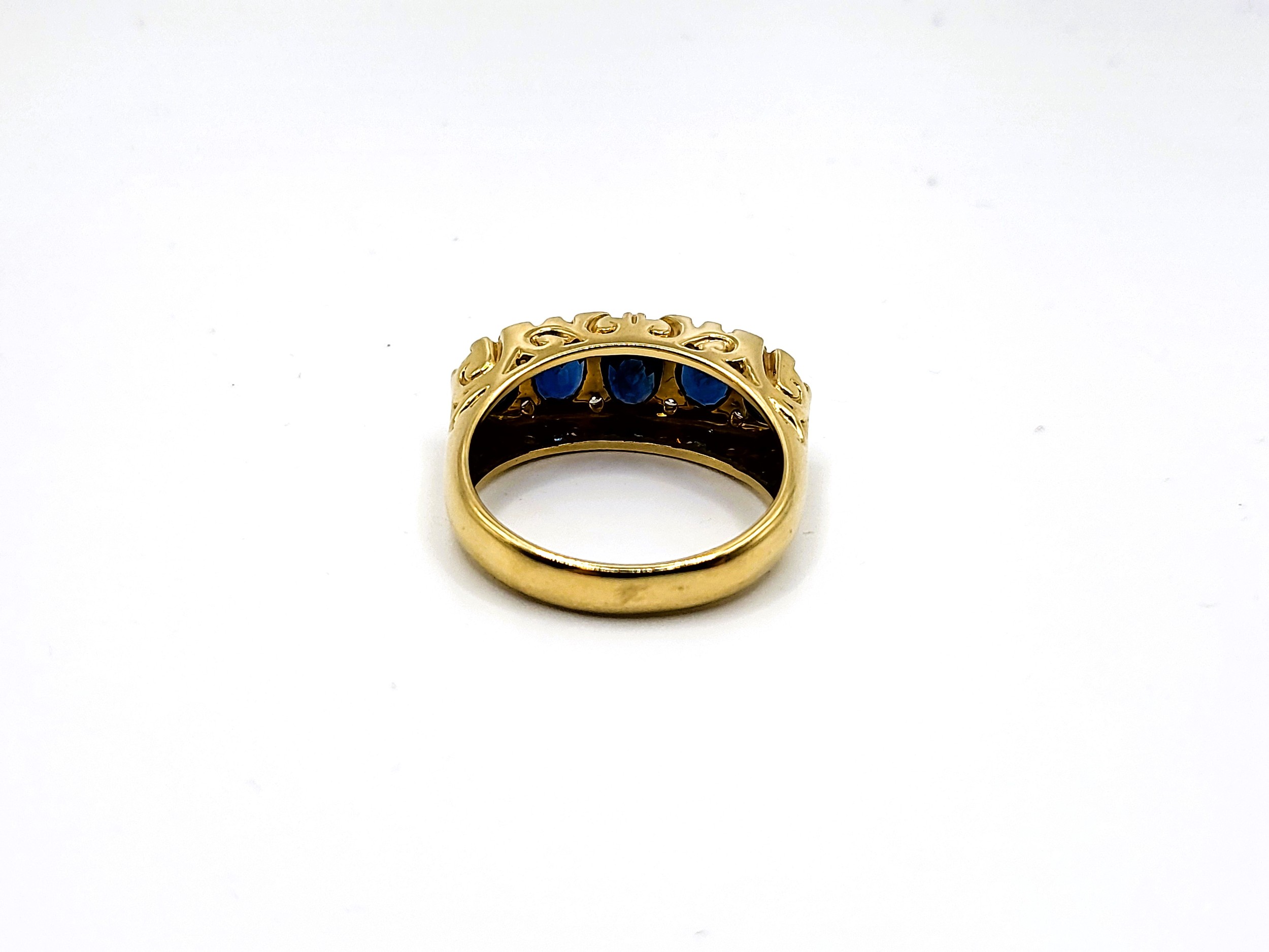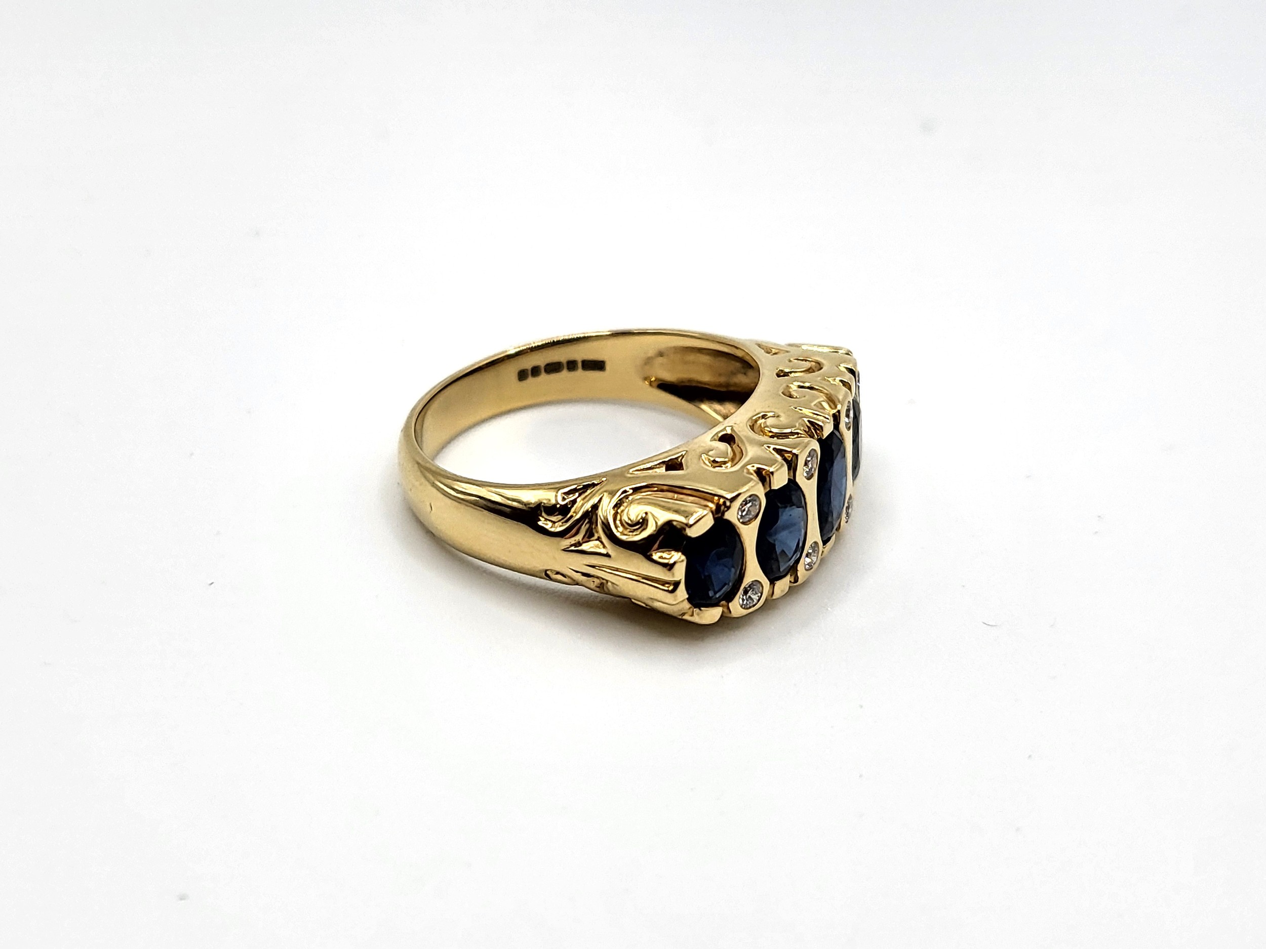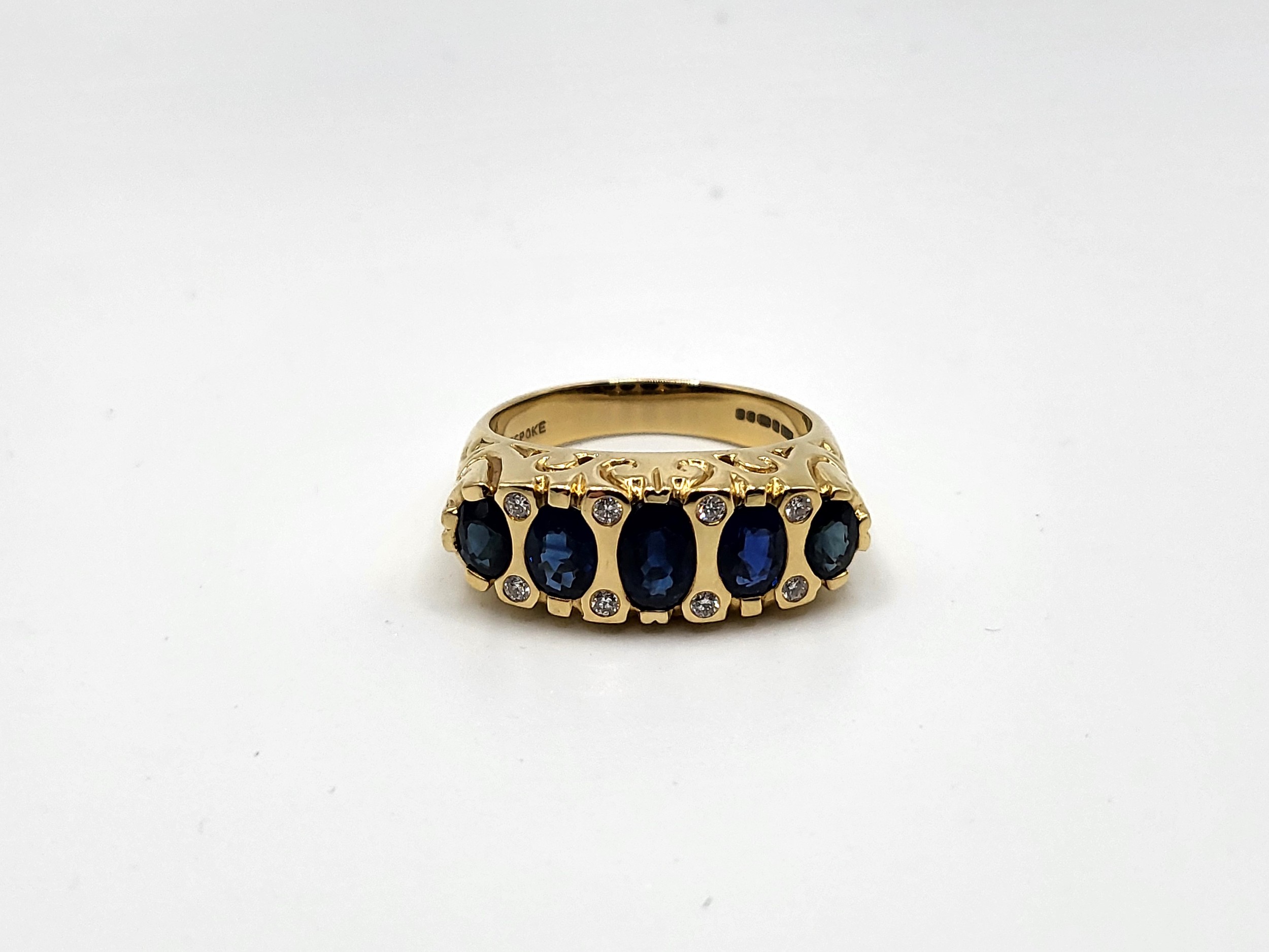 An 18ct yellow gold Victorian style setting sapphire and diamond set ring. With five graduated oval sapphires and eight diamonds. Fully hallmarked, AFJ London 2016. Size N. 6.8gms. Stamped bespoke.