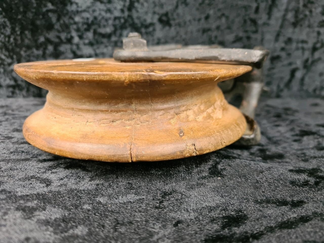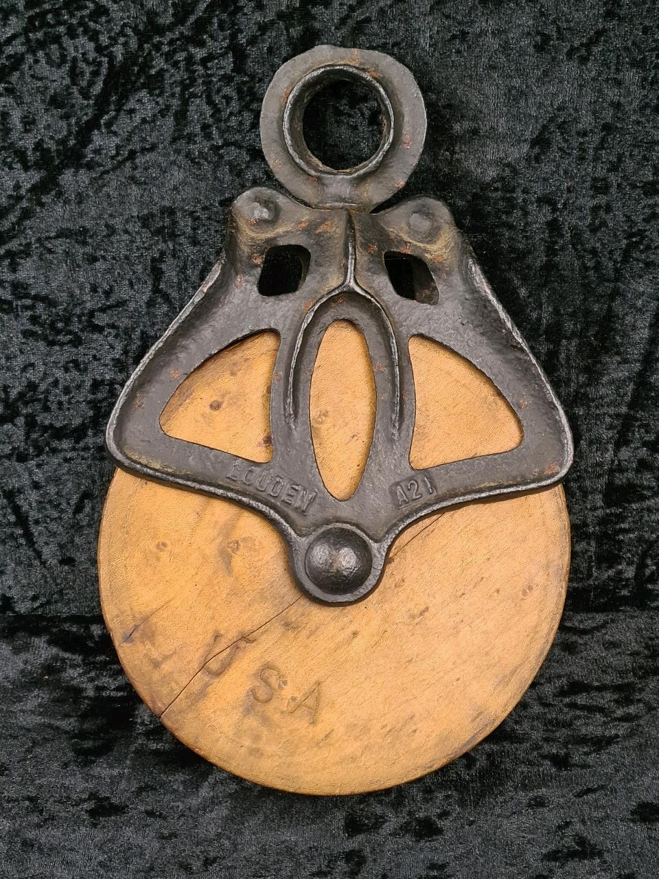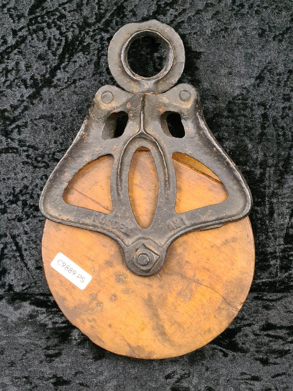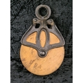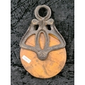 Antique Louden A21 cast iron and wood wheel barn pulley, used for handling hay bales. Approx H26cm.