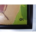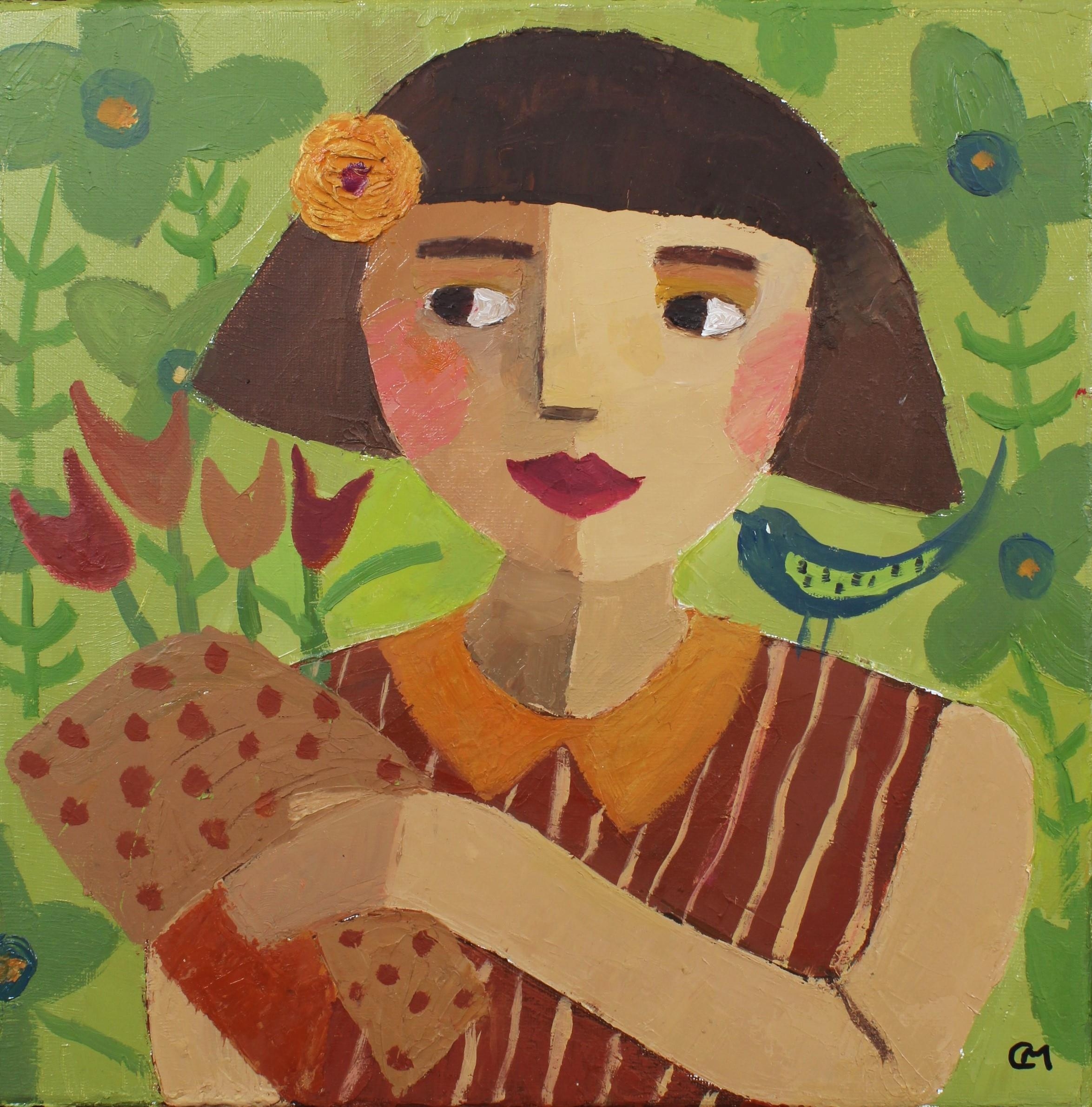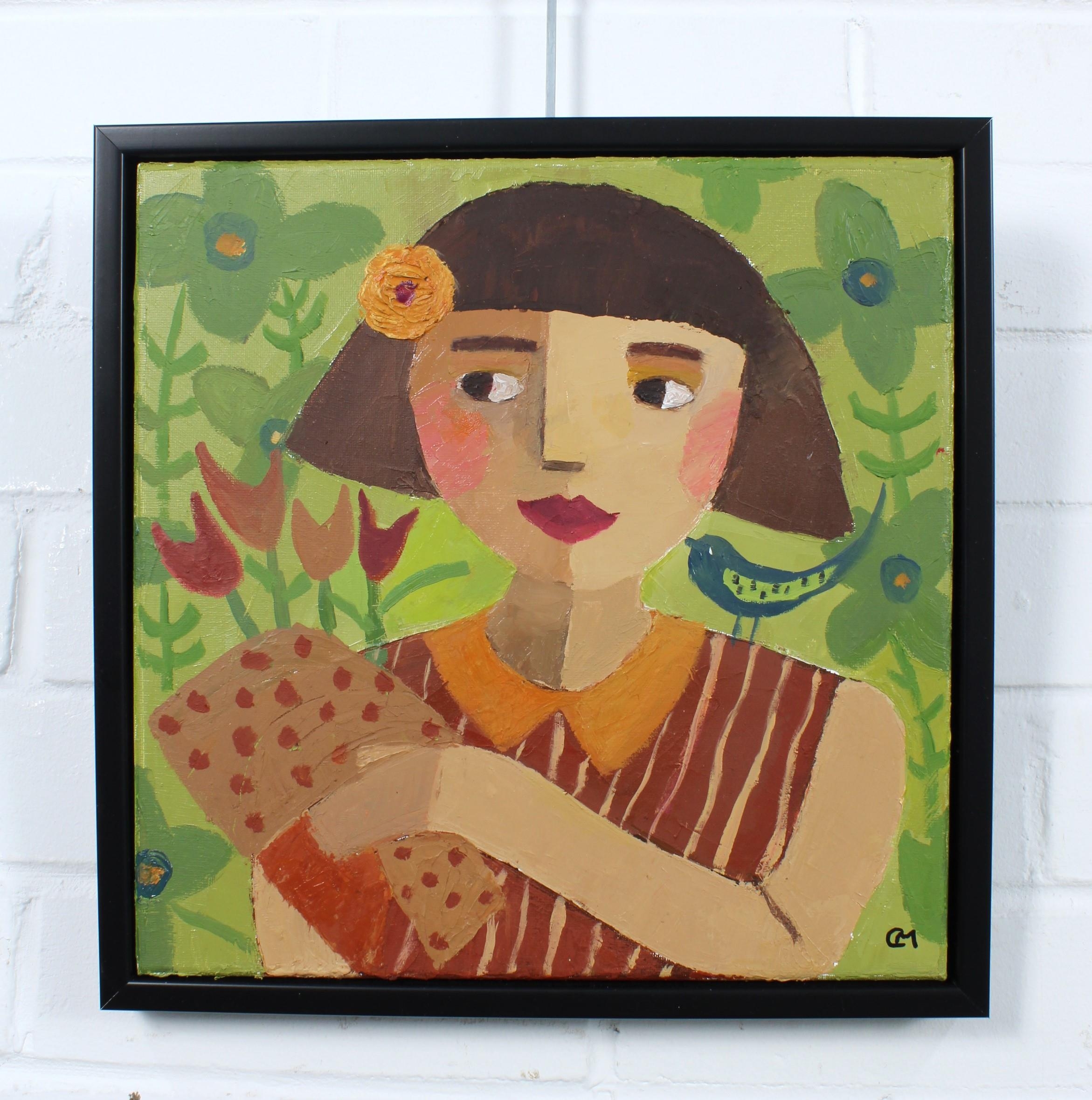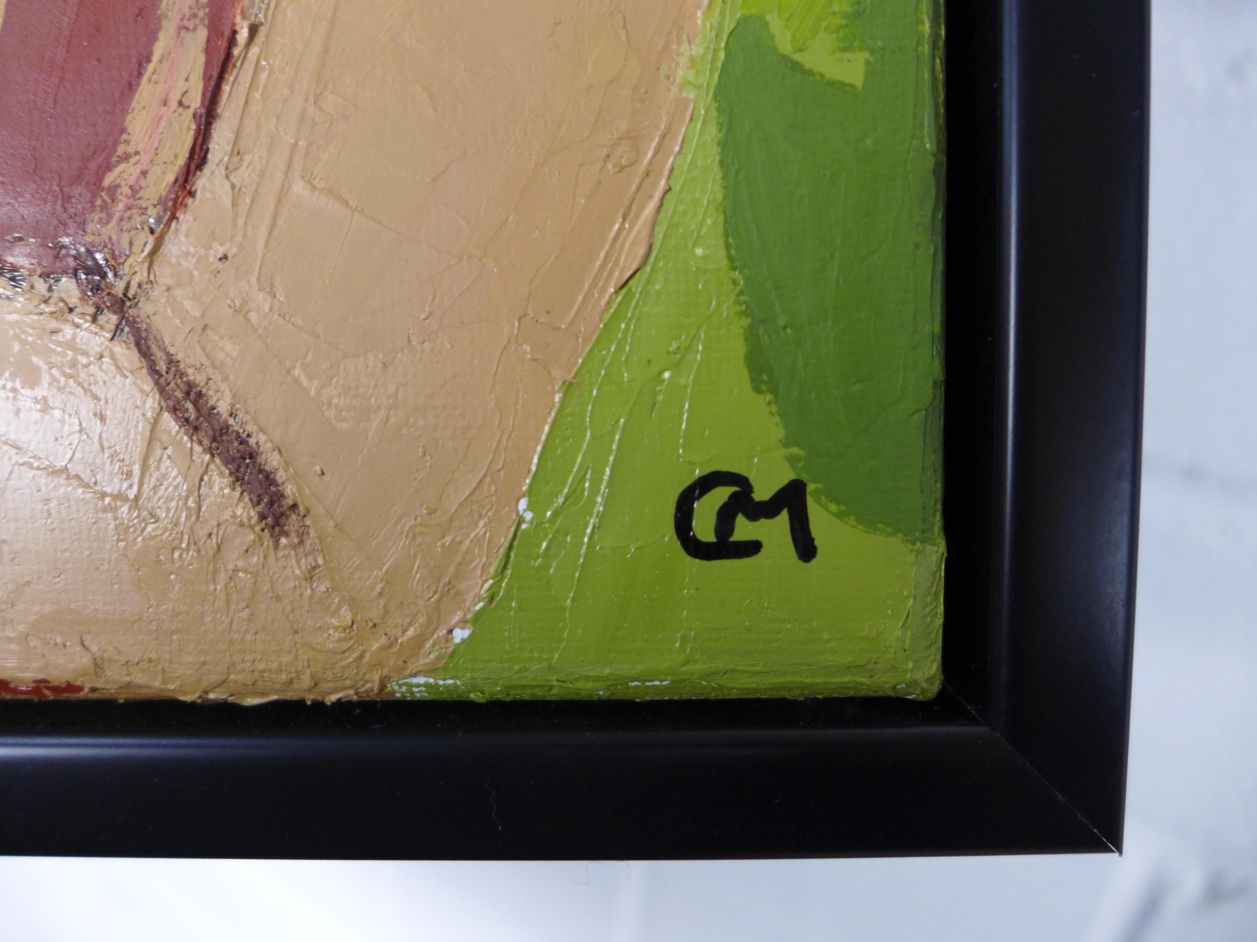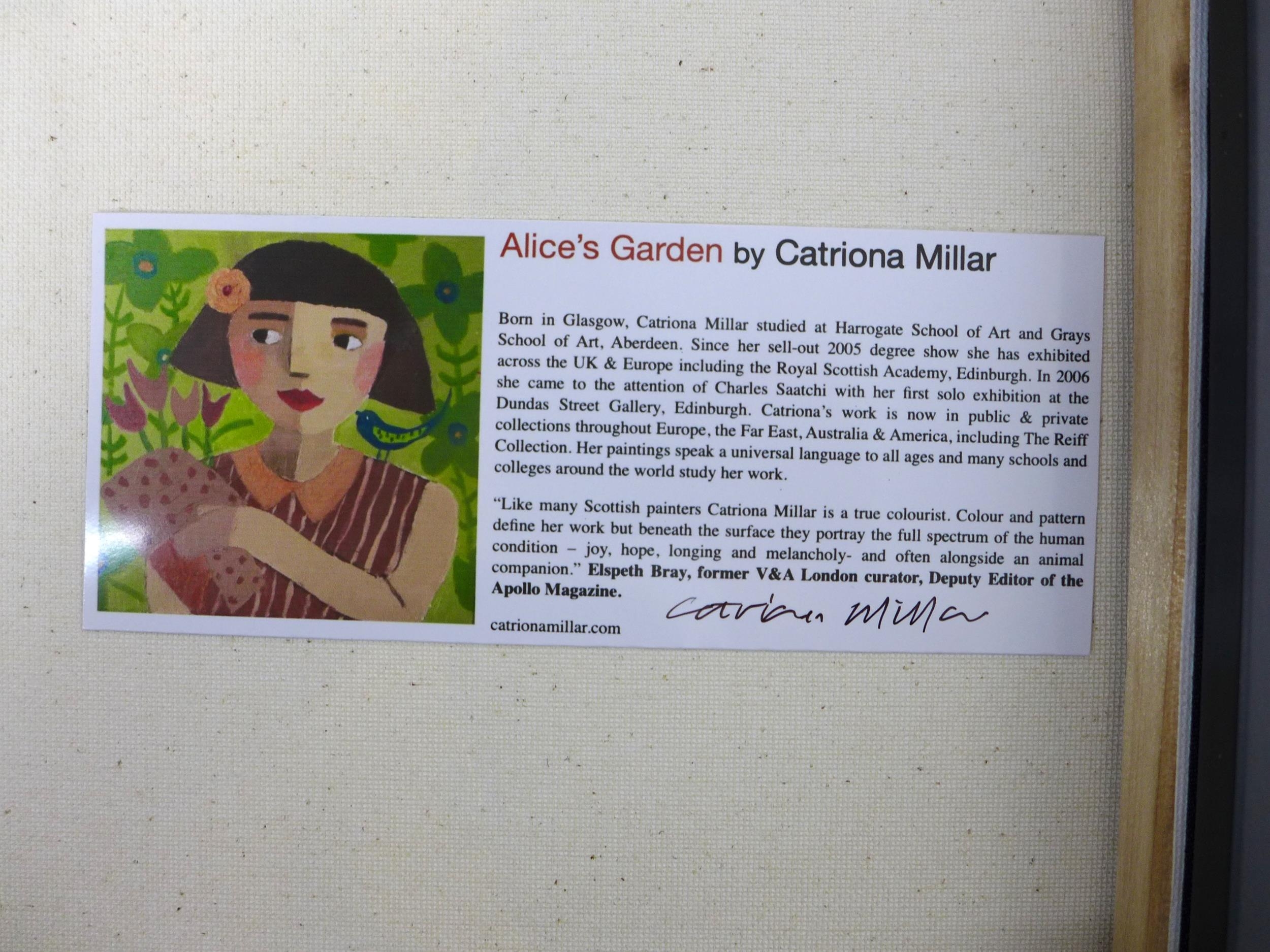 CATRIONA MILLAR (SCOTTISH 1956-) ALICE'S GARDEN oil on canvas, signed with initials and framed, 30 x 30cm, label verso.