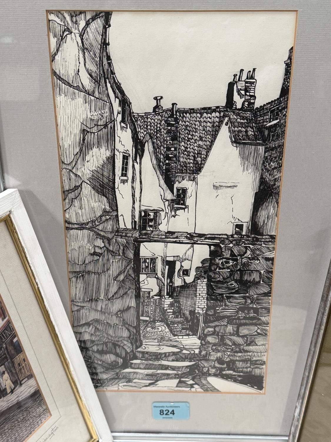 A pen and ink sketch of a Northern street scene, P. Winnington, 23/750 signed print and a silk.