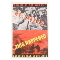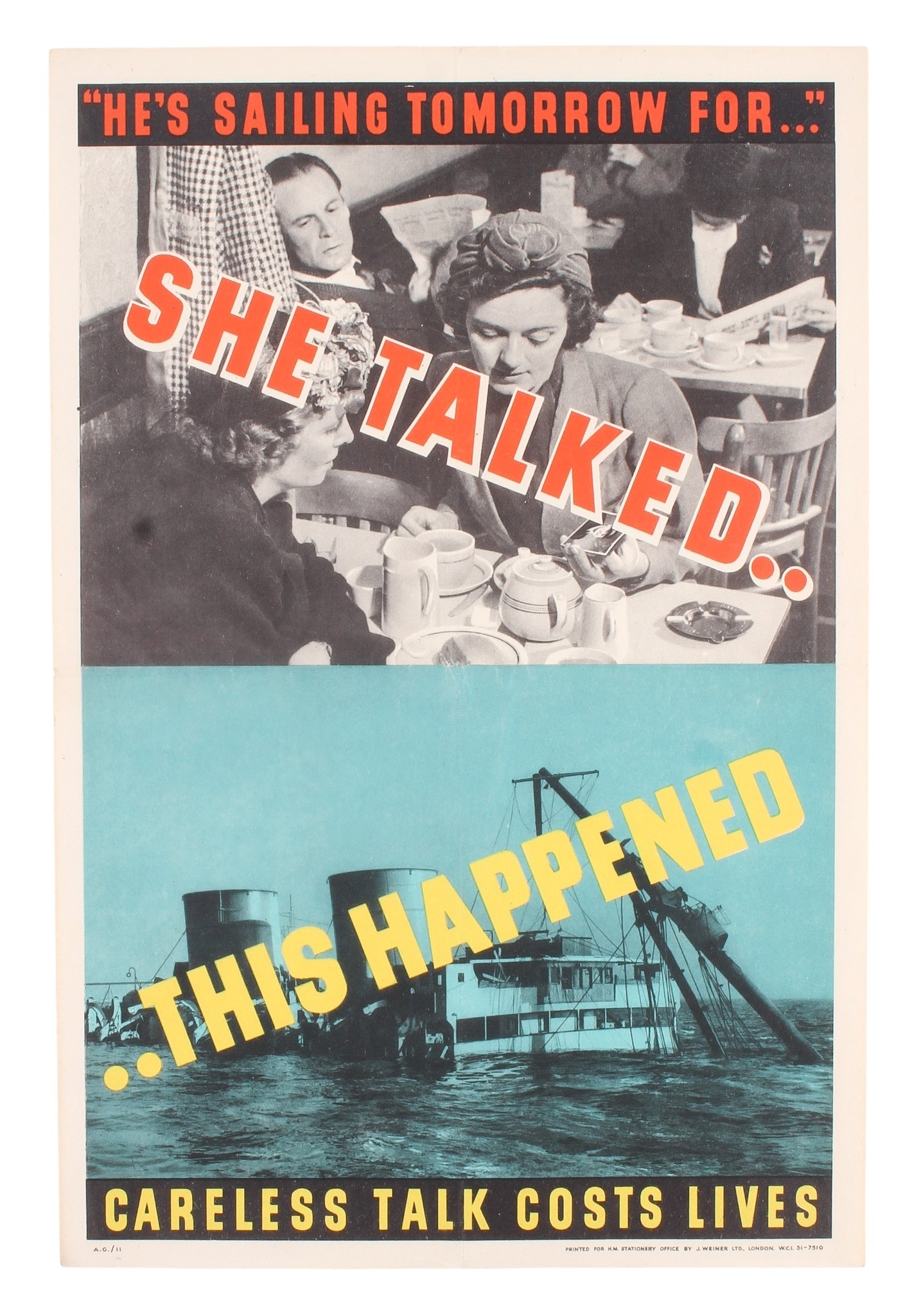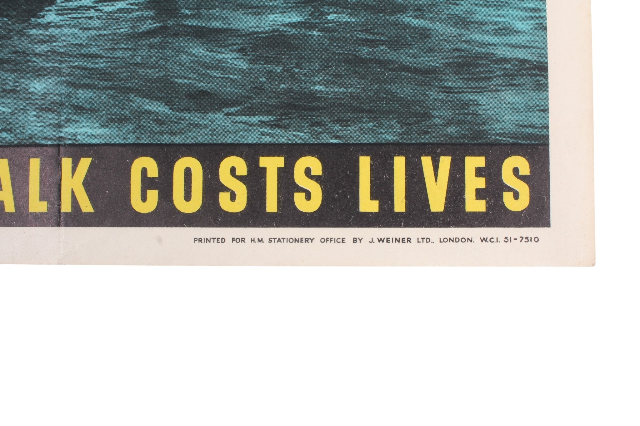 A WWII Home Front 'Careless Talk Costs Lives' poster. Printed by J. Weiner Ltd London for H.M. Stationary Office, featuring an image of a sinking merchant ship, 38cm x 25cm.