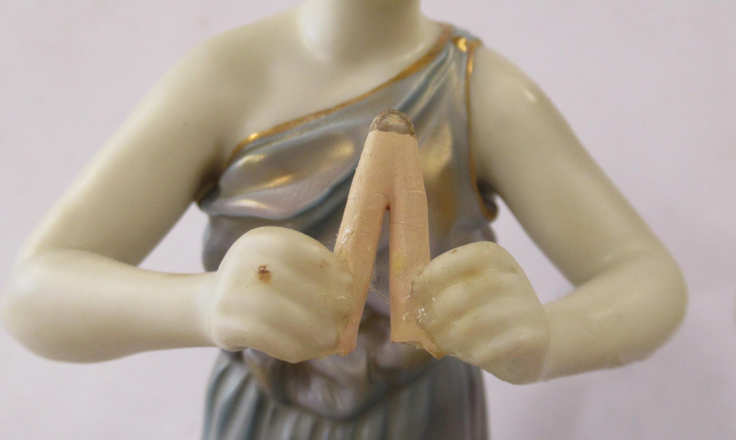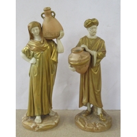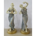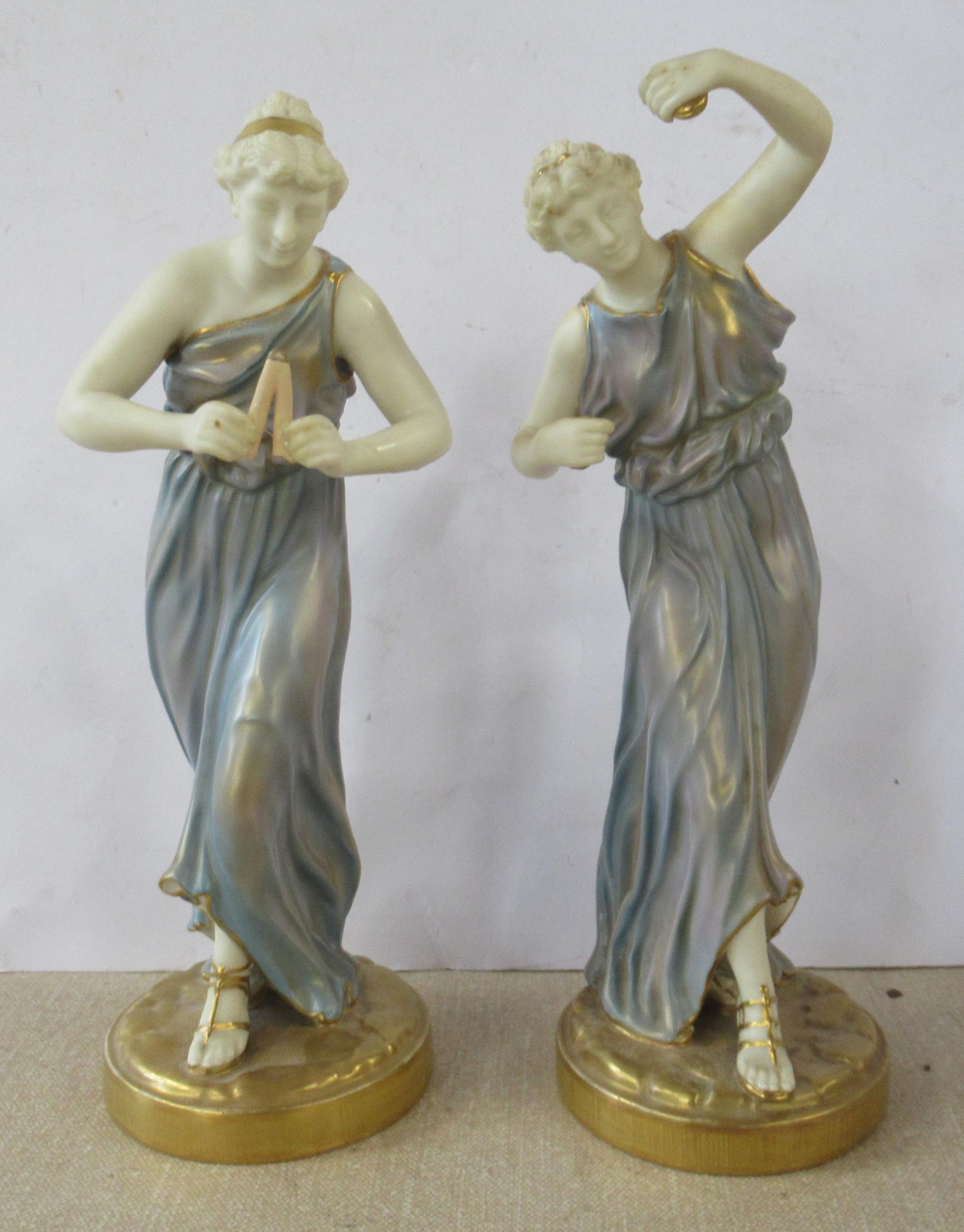 A pair of Royal Worcester James Hadley figures, decorated in shot silk colours of two woman playing instruments, model number 1827 and 1828, height 8.5ins