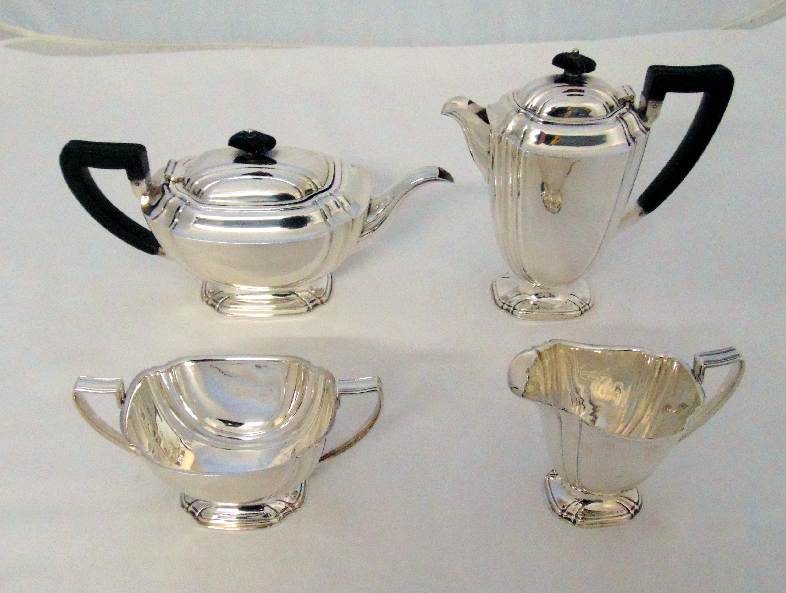 A hallmarked silver Art Deco style four piece tea and coffee set, Sheffield 1940, approx total weight 1499g