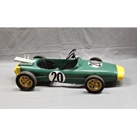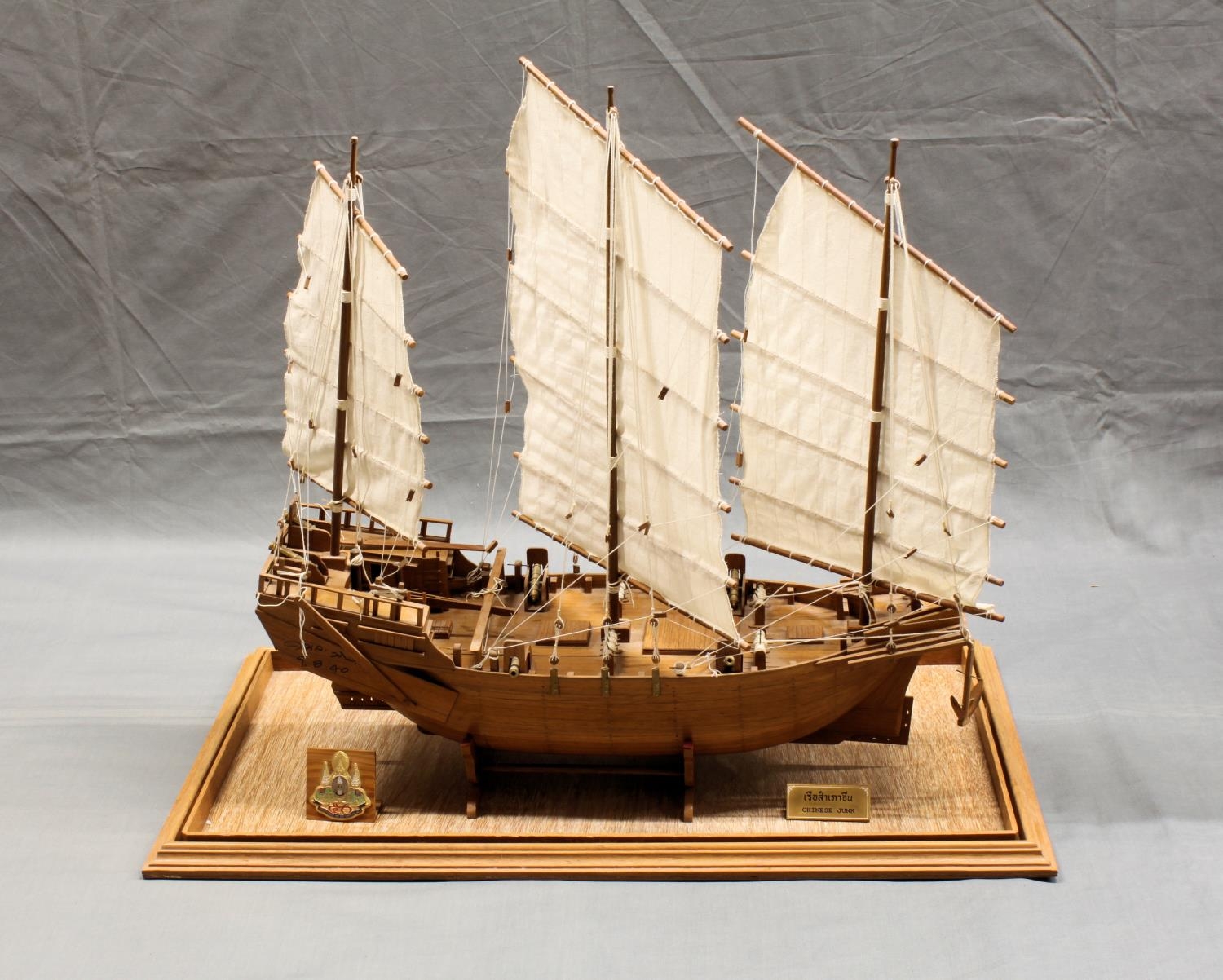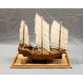 A hand built wooden model of a Chinese junk, made in Thailand by The Miniature Shipyard, the three masted junk on stand and wooden tray base, 32 x 18in. (81.2 x 45.7cm.), 26½in. (67.3cm.) high.