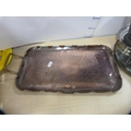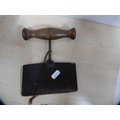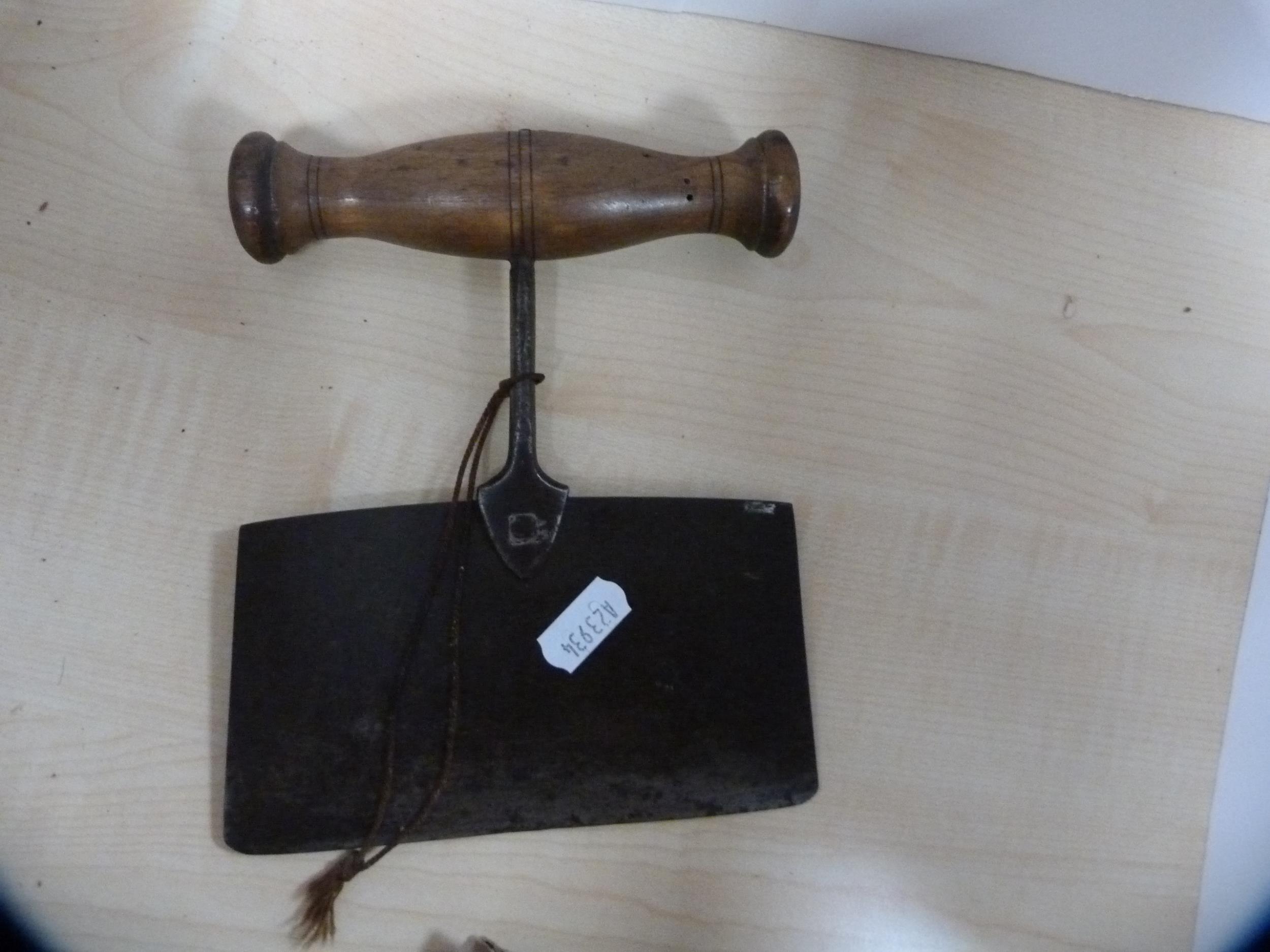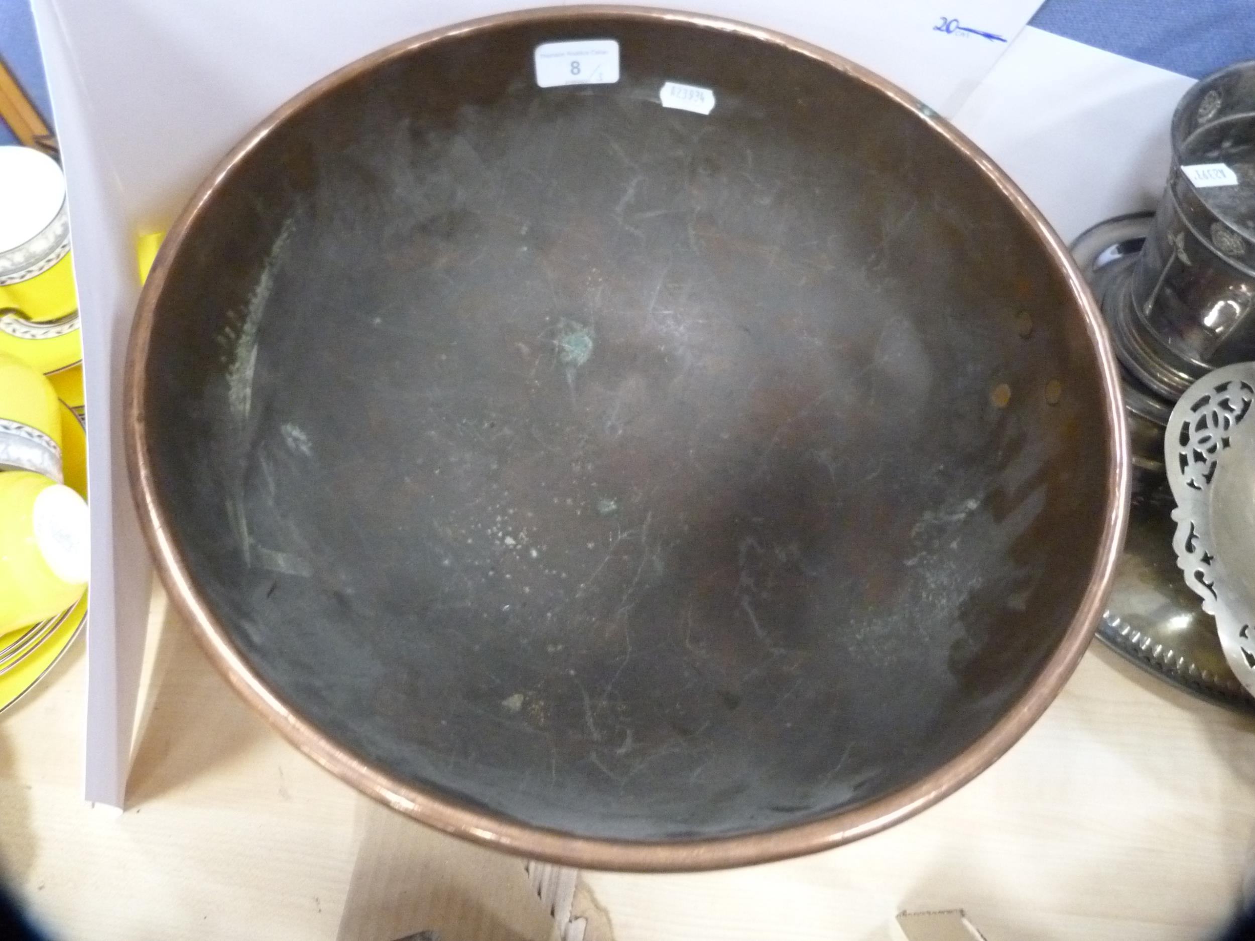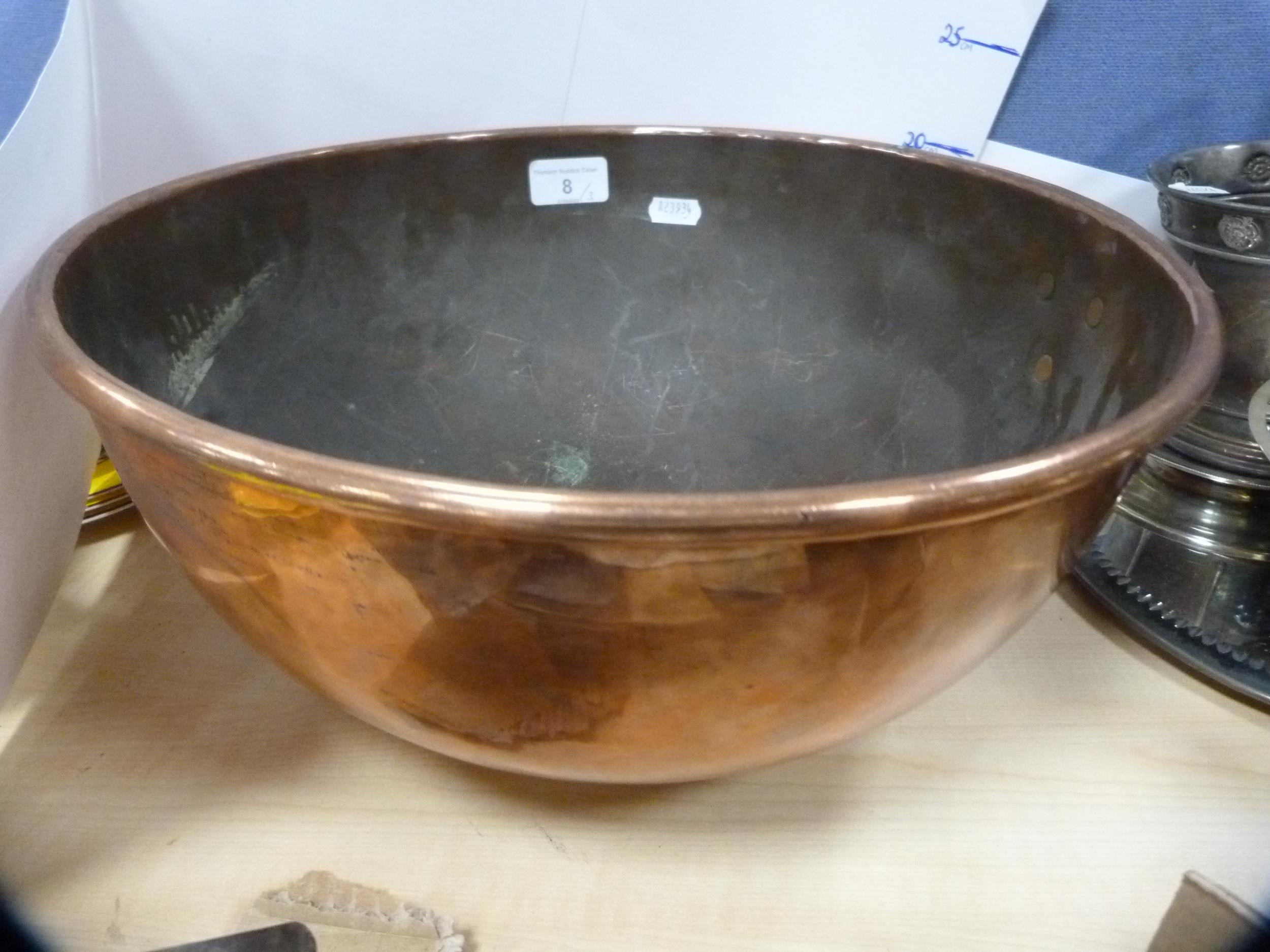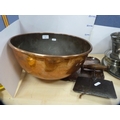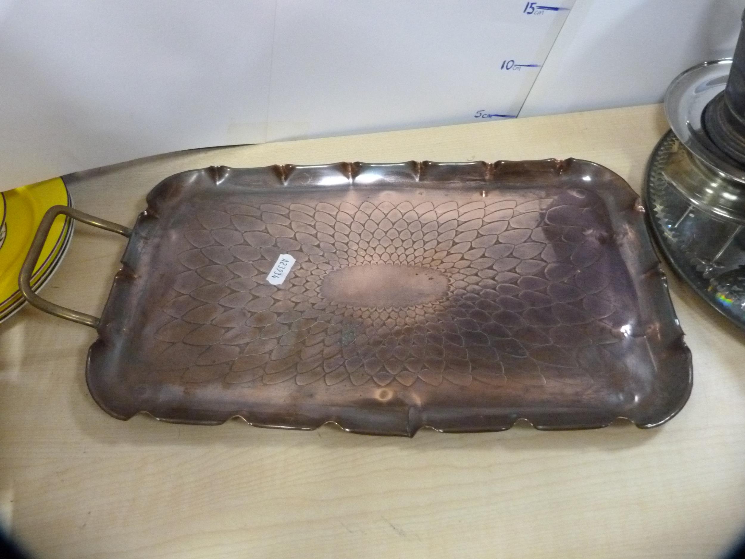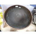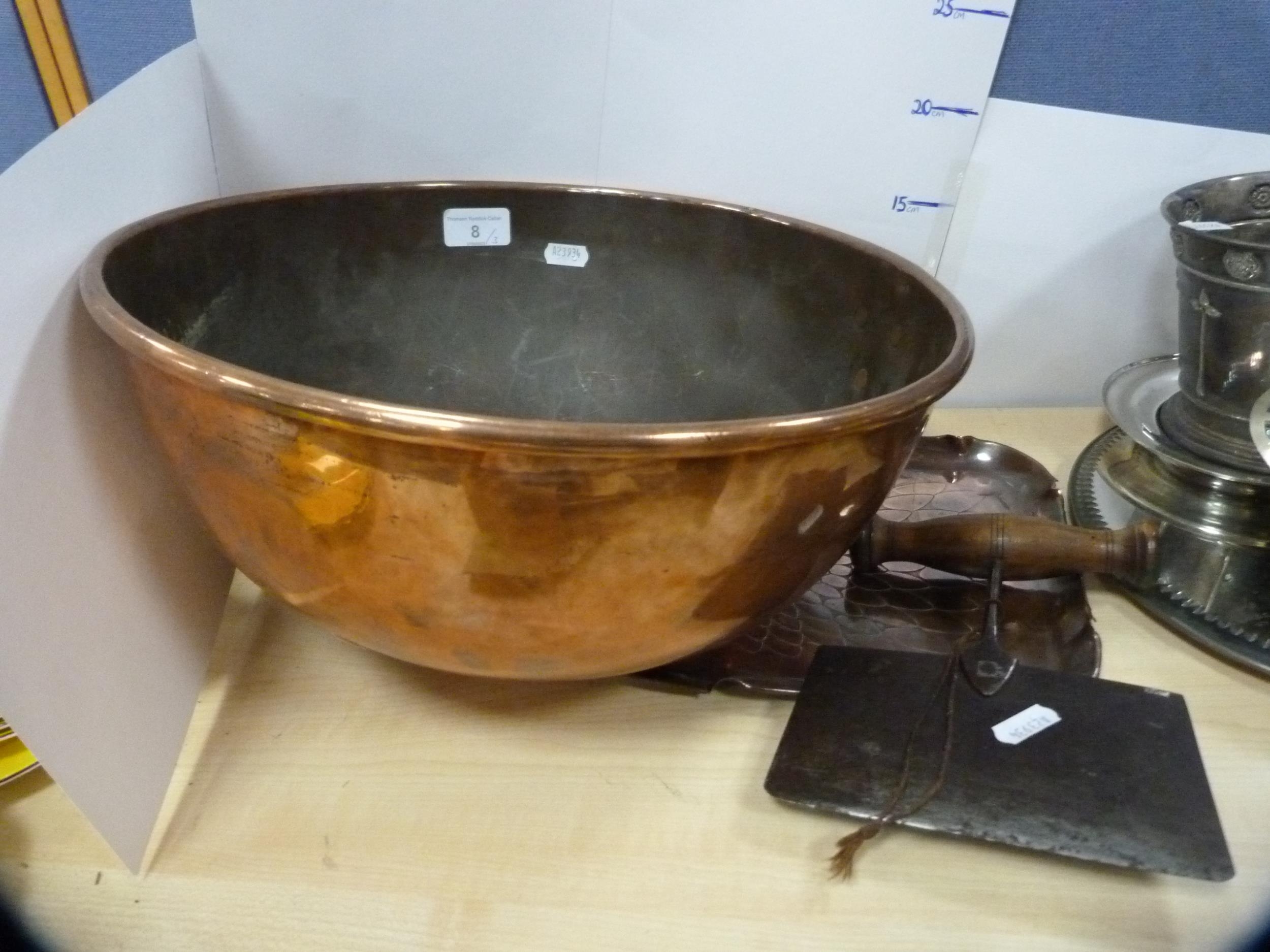 Copper bowl with brass ring handles, shaped copper tray with brass handle and an antique dough cutter with turned wood handle. (3)