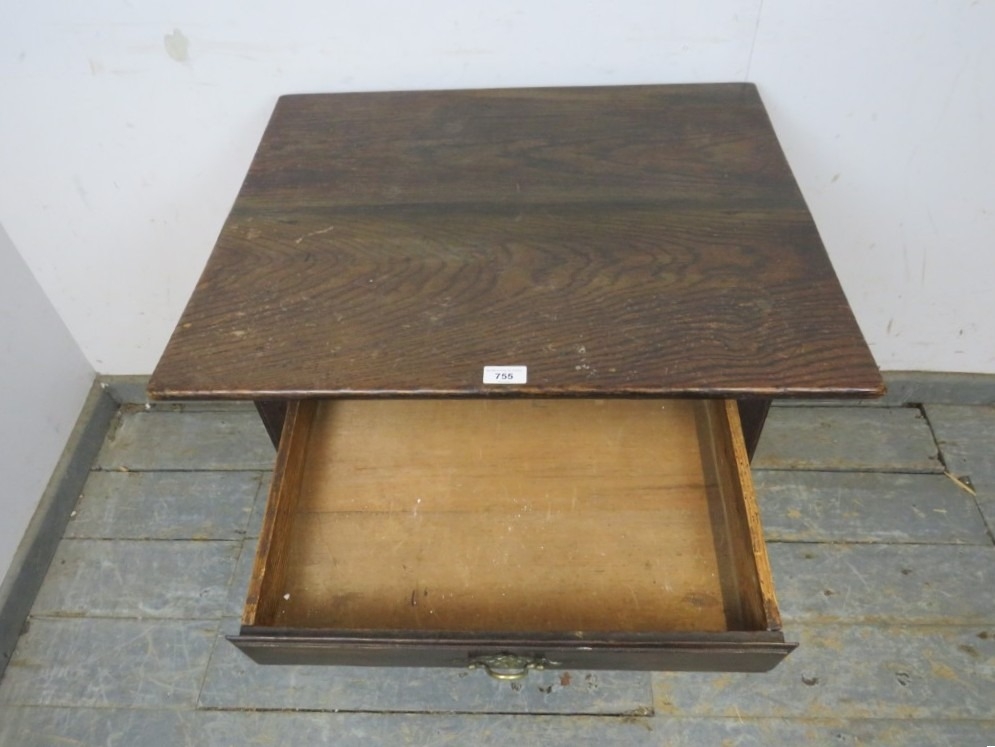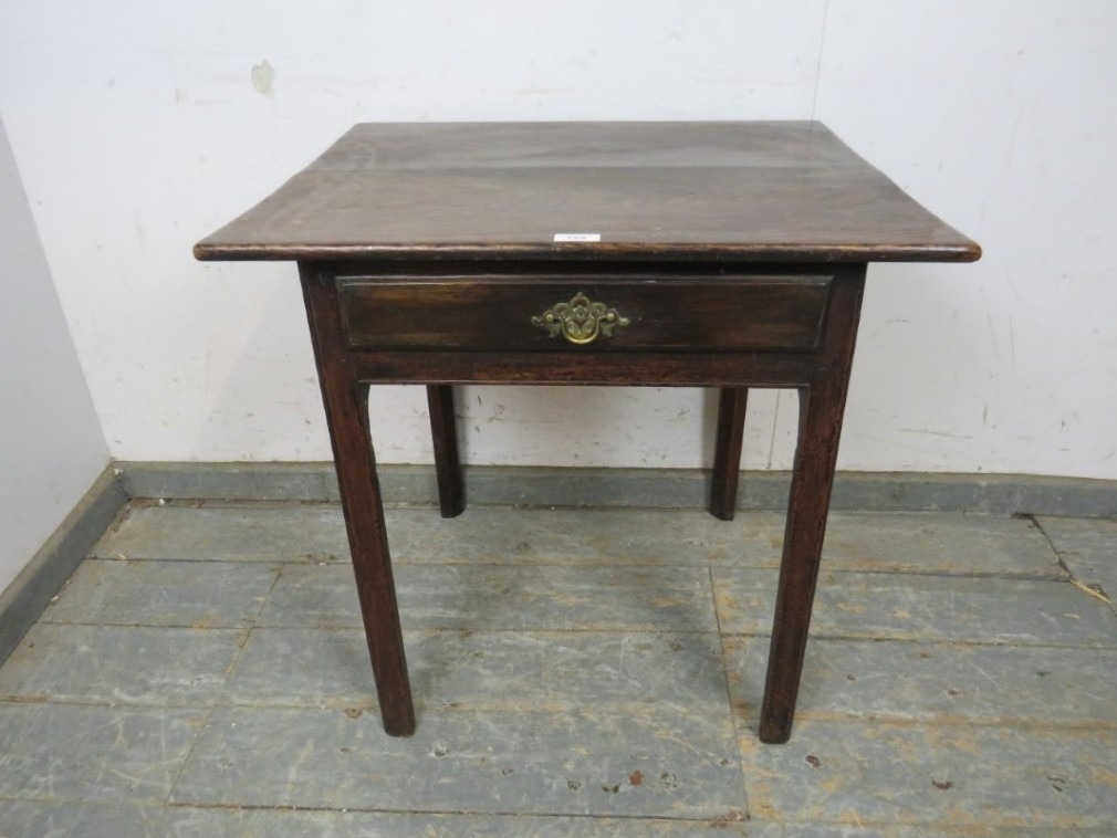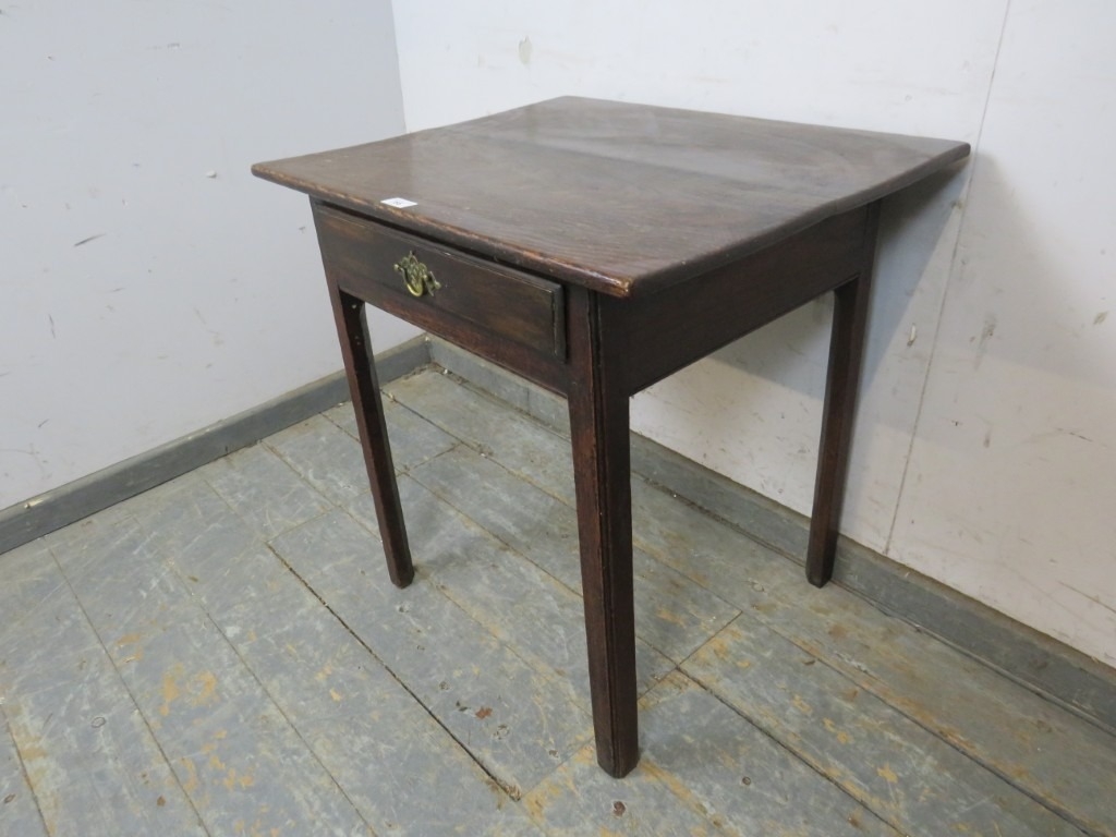 A 19th Century oak side table with a single drawer, brass handle and square chamfered legs. H66cm x W66cm x D55cm approx.
