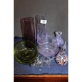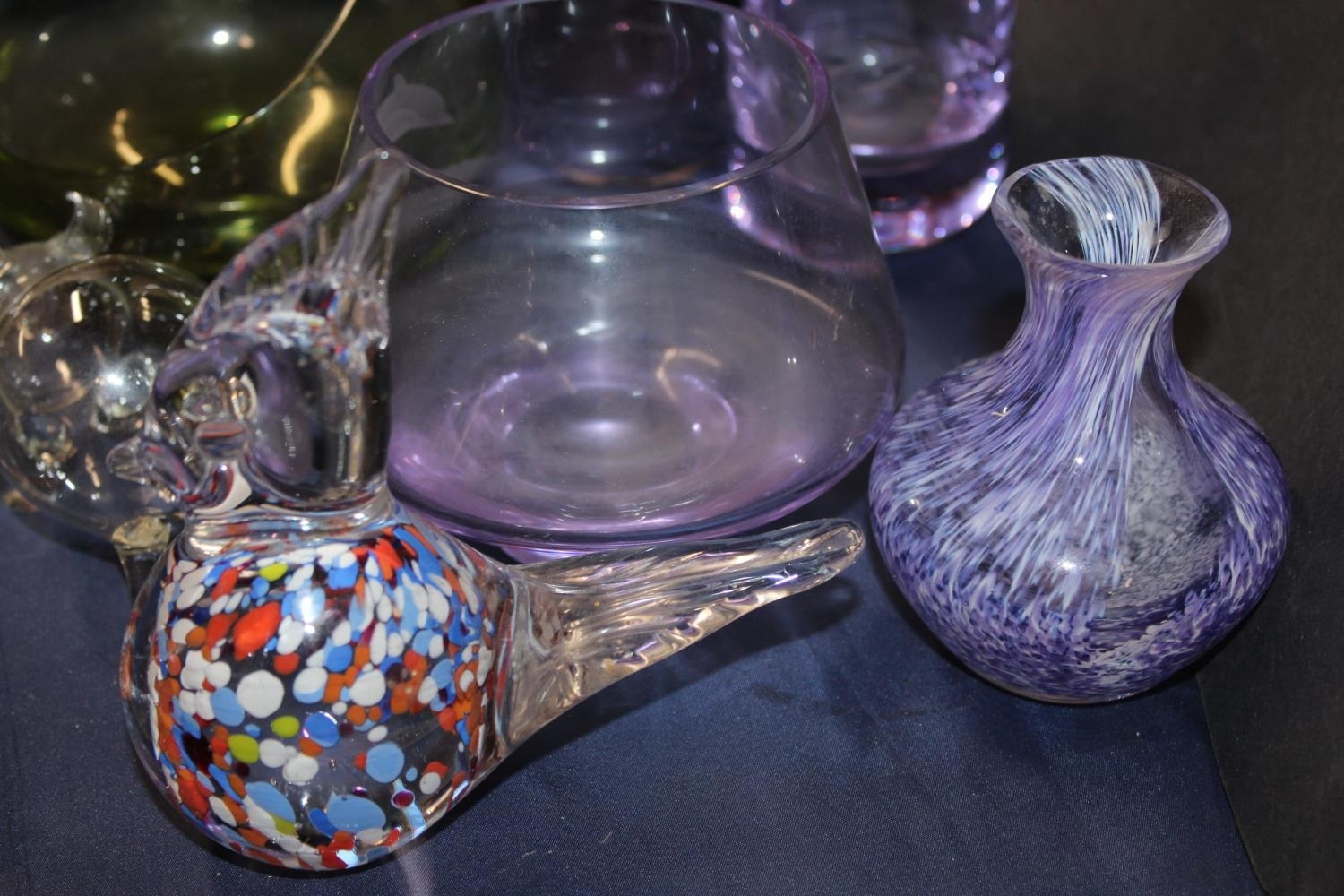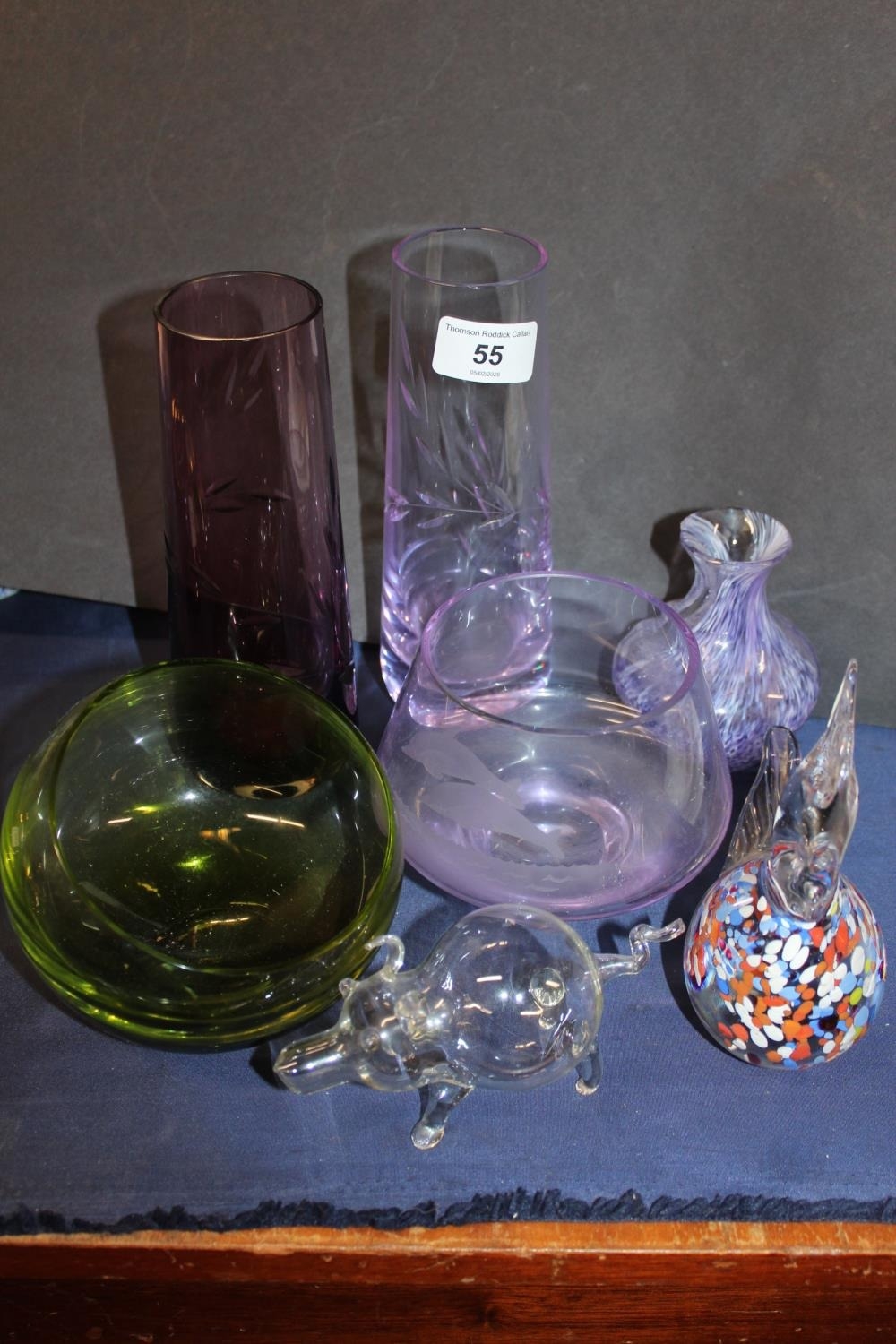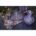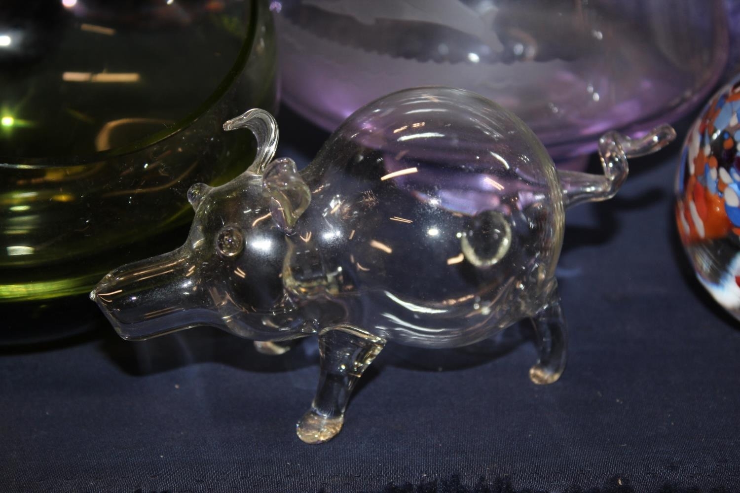 Caithness Glass vases and bowls, a Murano style bird paperweight, and a glass pig.