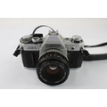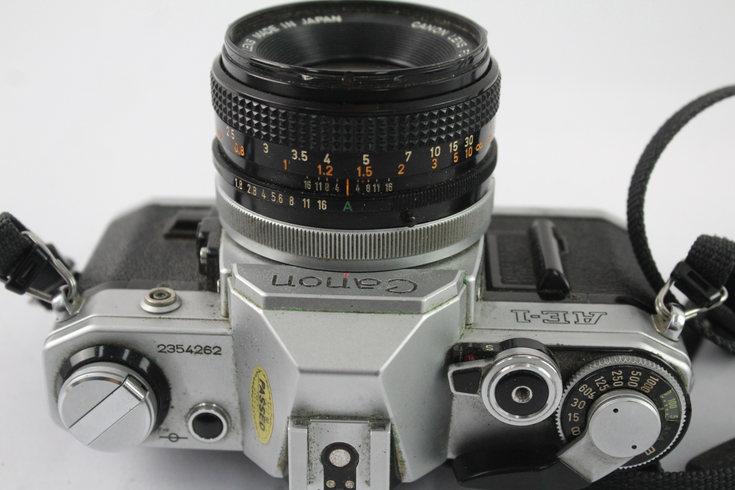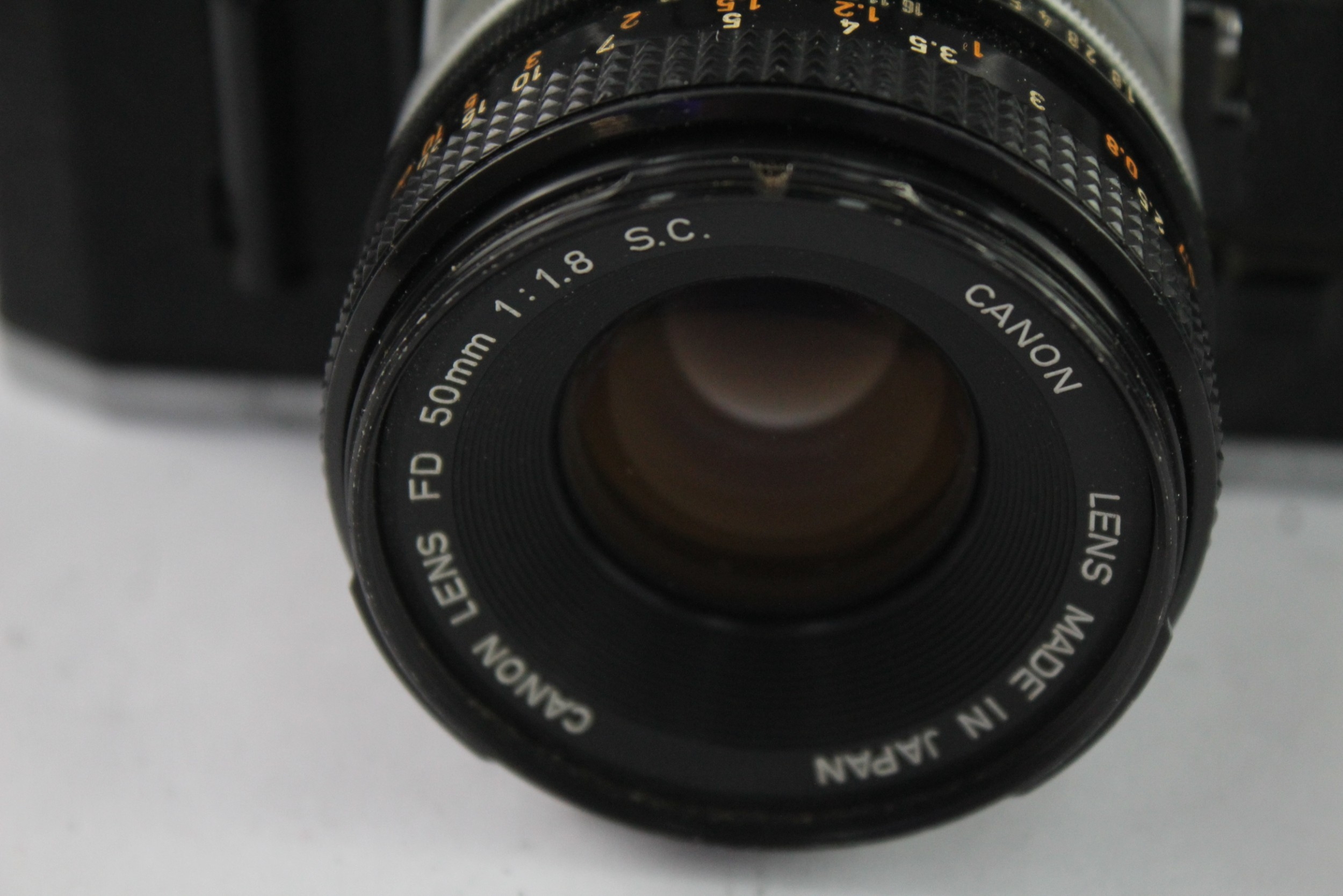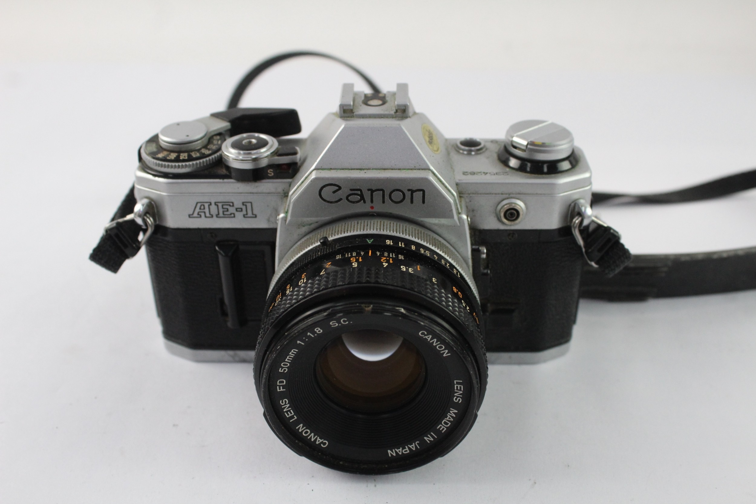A Canon AE-1 35mm SLR camera fitted with FD 1:1.8 50mm S.C. lens