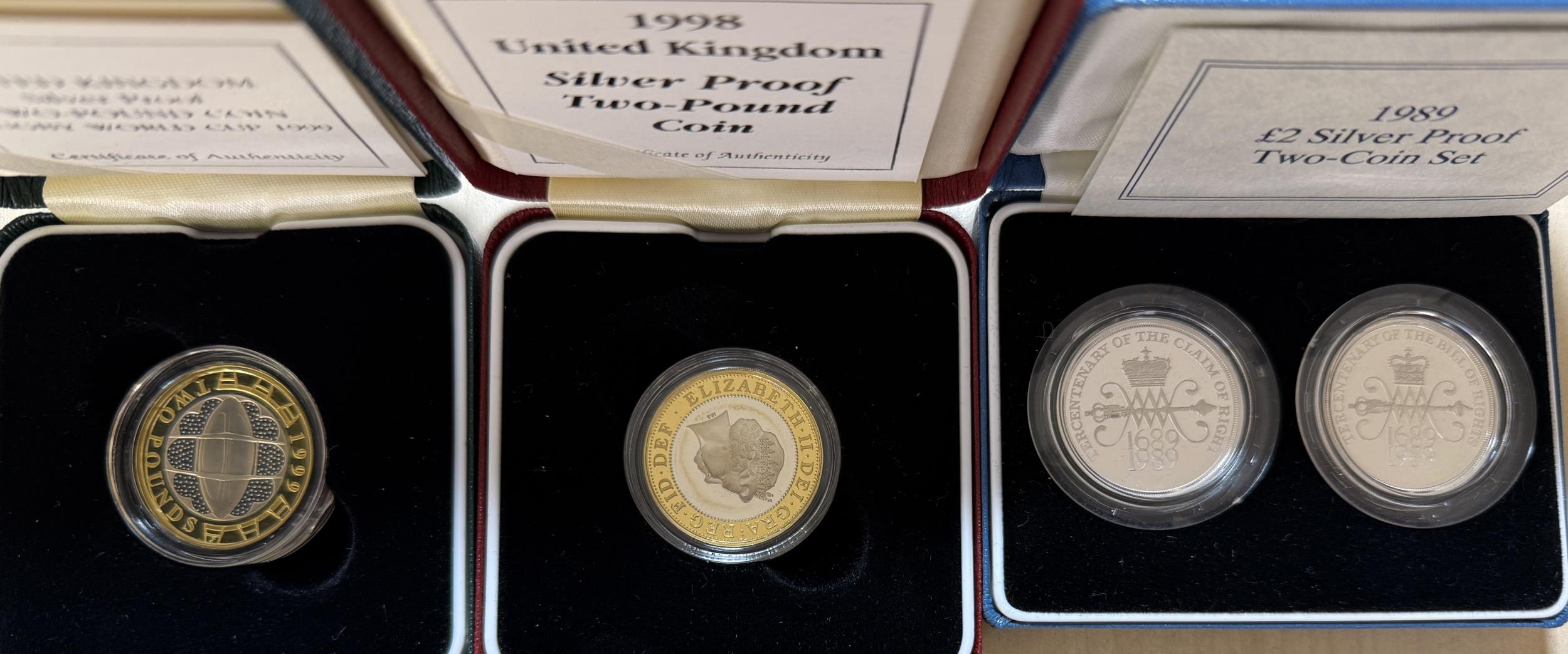 A collection of x15 UK QEII silver proof £2 coins, from 1986 to 2006, all boxed with CoAs