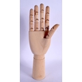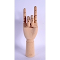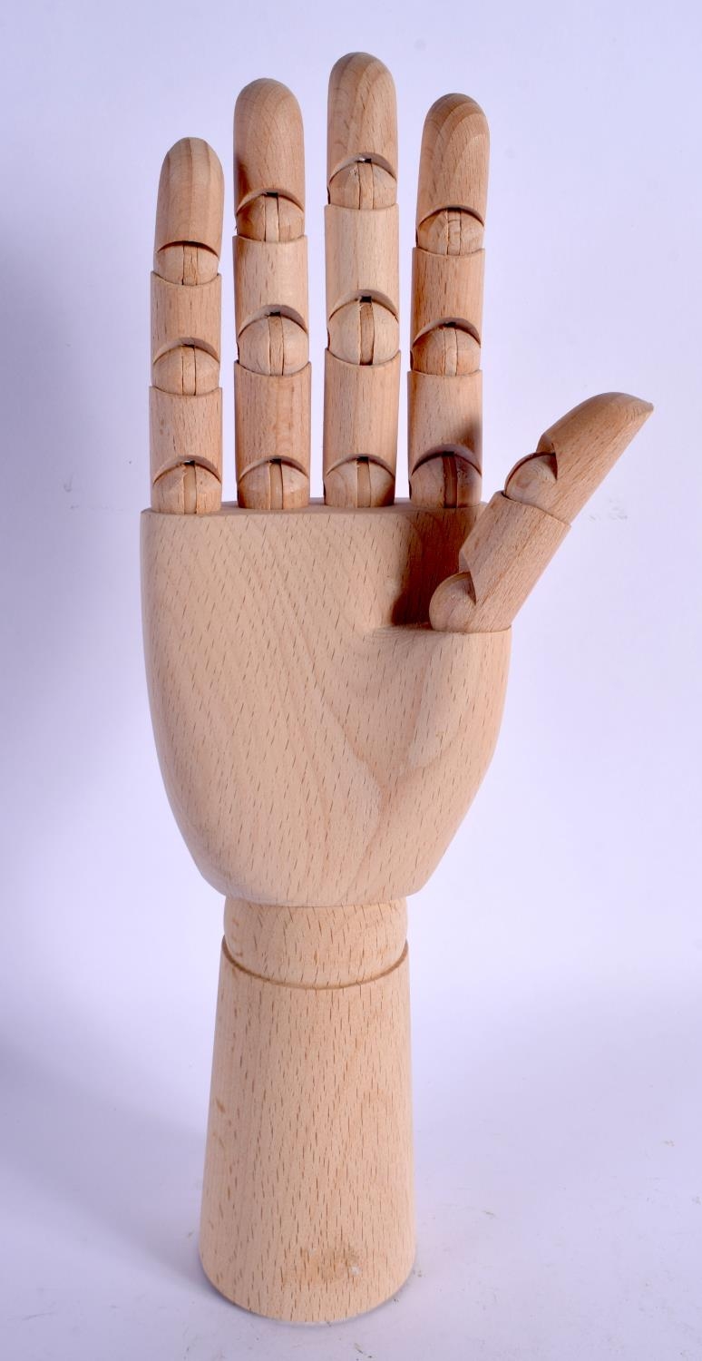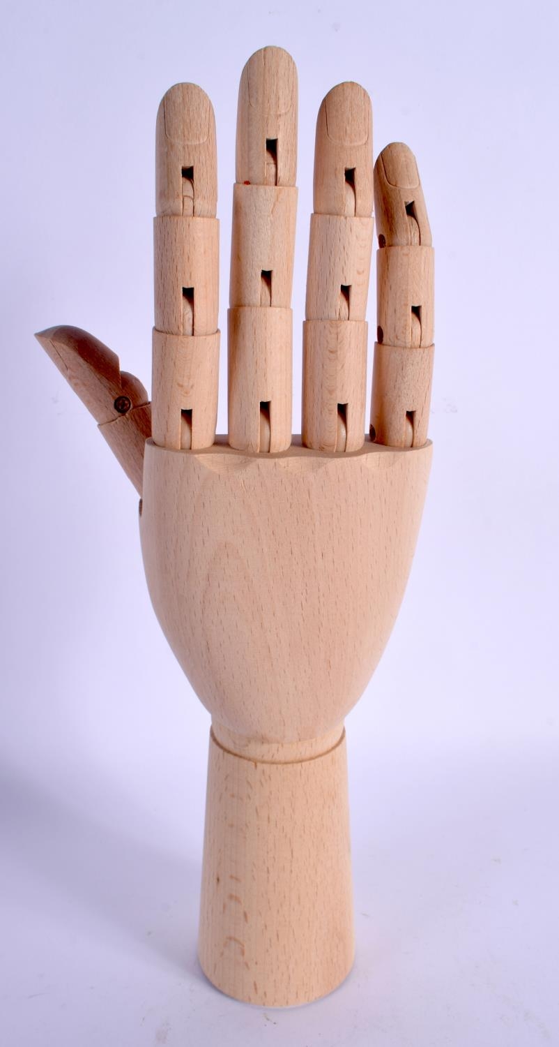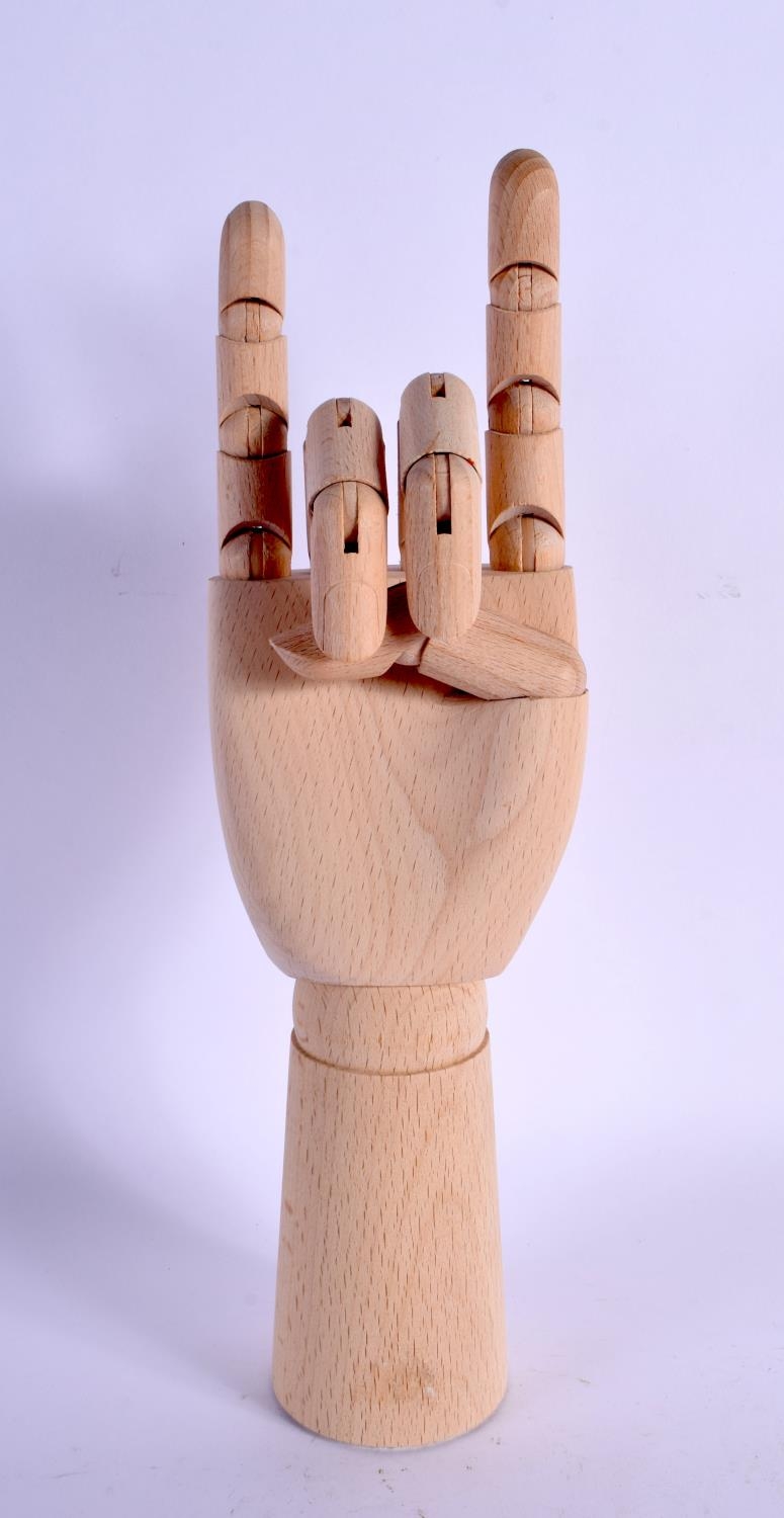 A CONTEMPORARY CARVED WOOD ARTICULATED LAY TYPE RING DISPLAY in the form of a hand. 30 cm high extended.