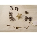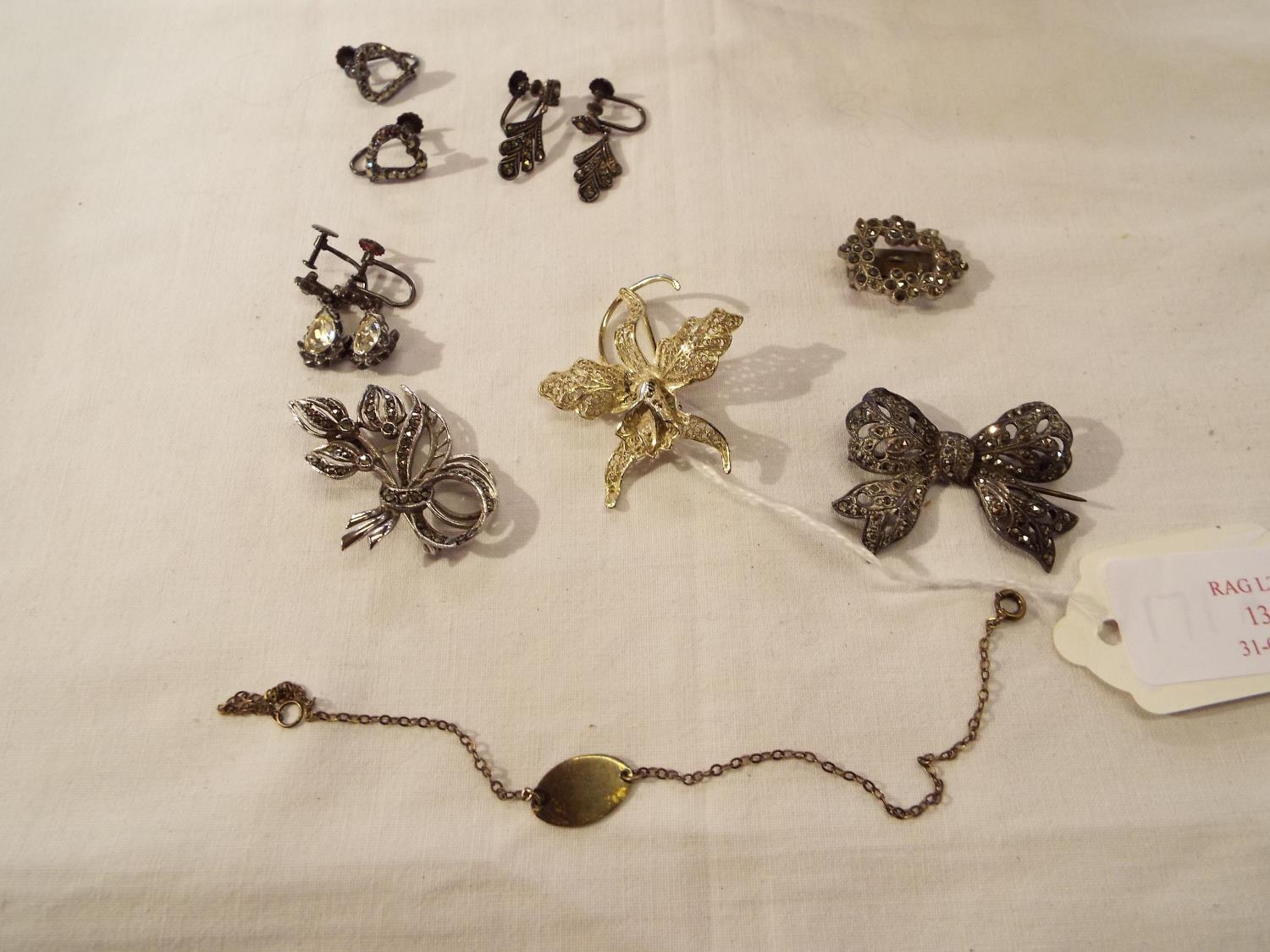 A mixed selection of silver items to include a marcasite set bow brooch, orchid brooch, earrings, bracelet etc