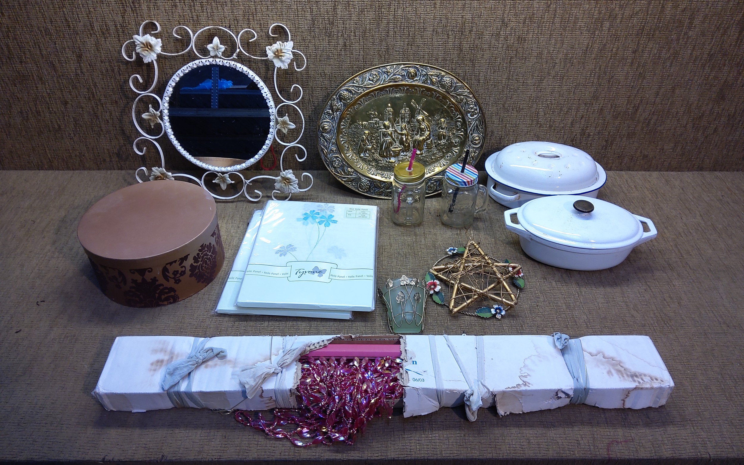Eclectic items including cast iron cooking pots and beaded curtain