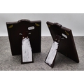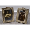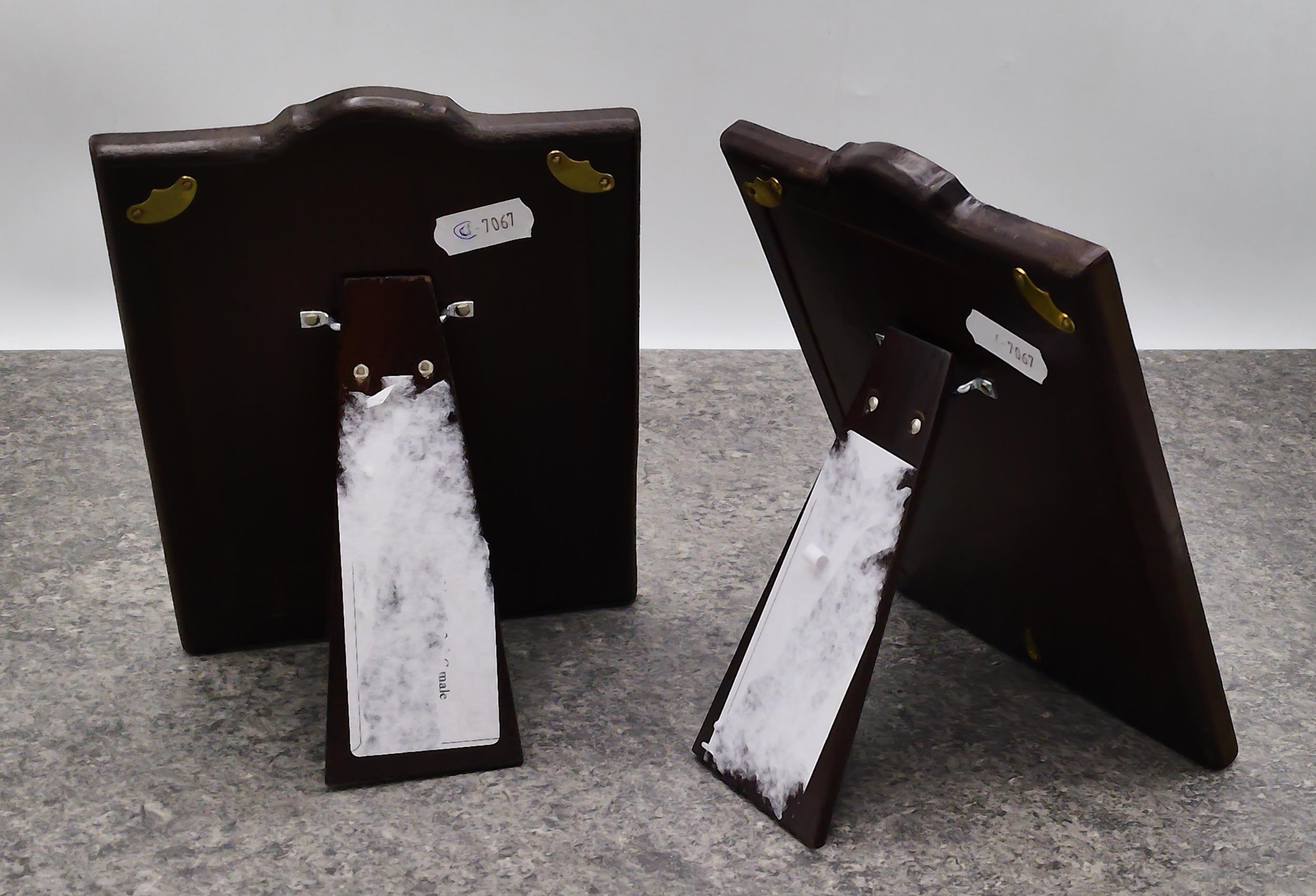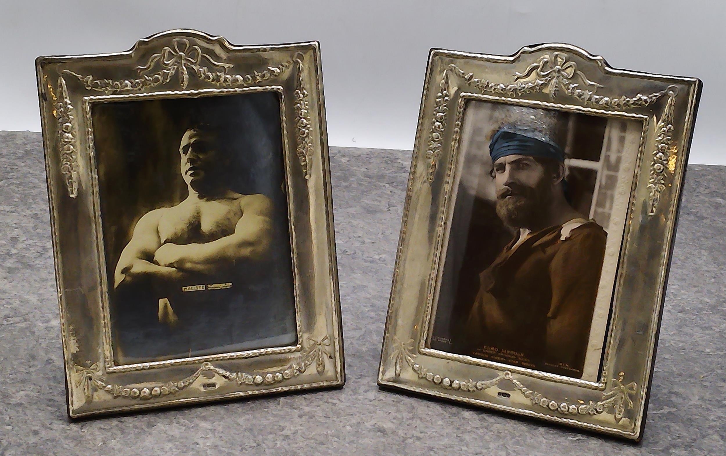 A pair of Britannia standard silver mounted easel-back photograph frames, each with a shaped crest and embossed with ribbon-tied floral swags and pendants and raised decorative borders, maker Ray Hall, Birmingham marks circa 1985-2005, 18cm high overall, 13.5cm wide
