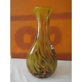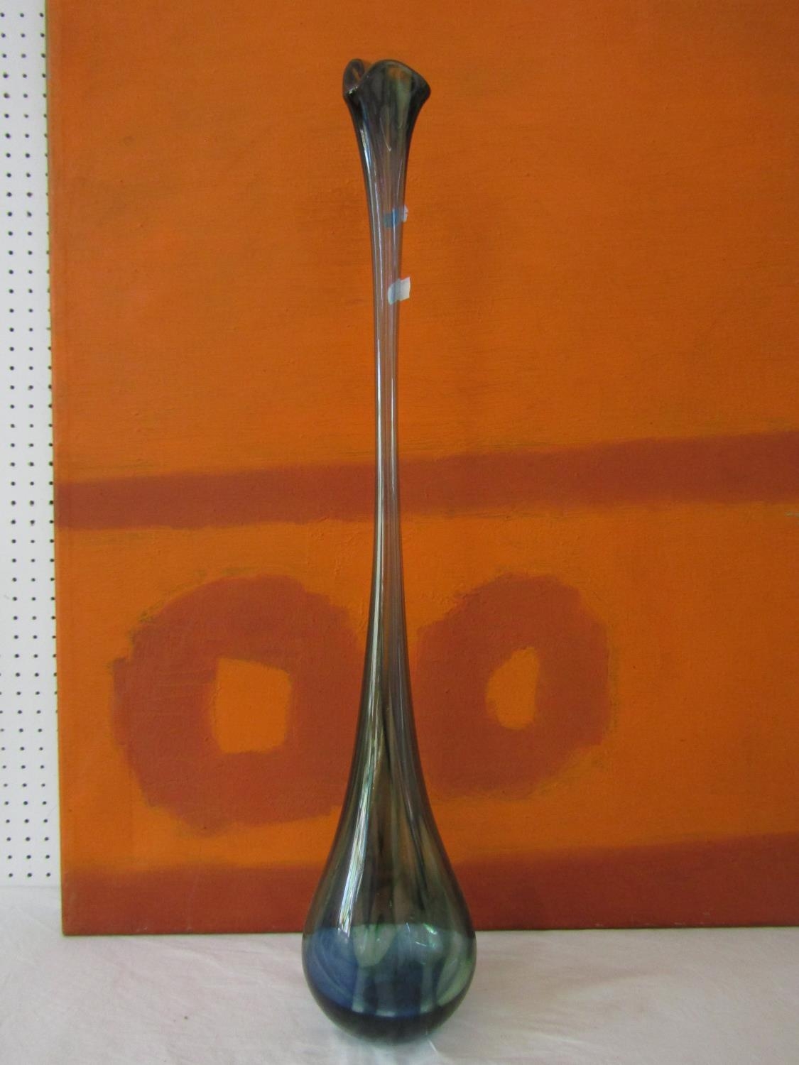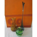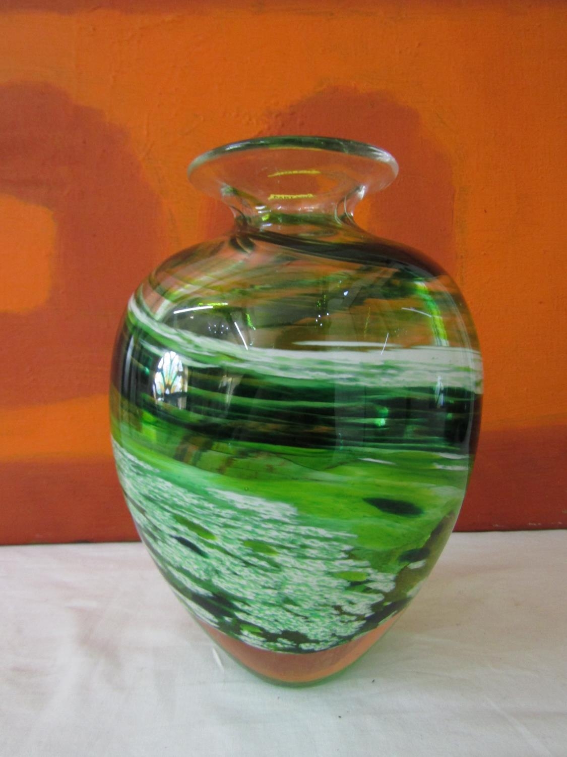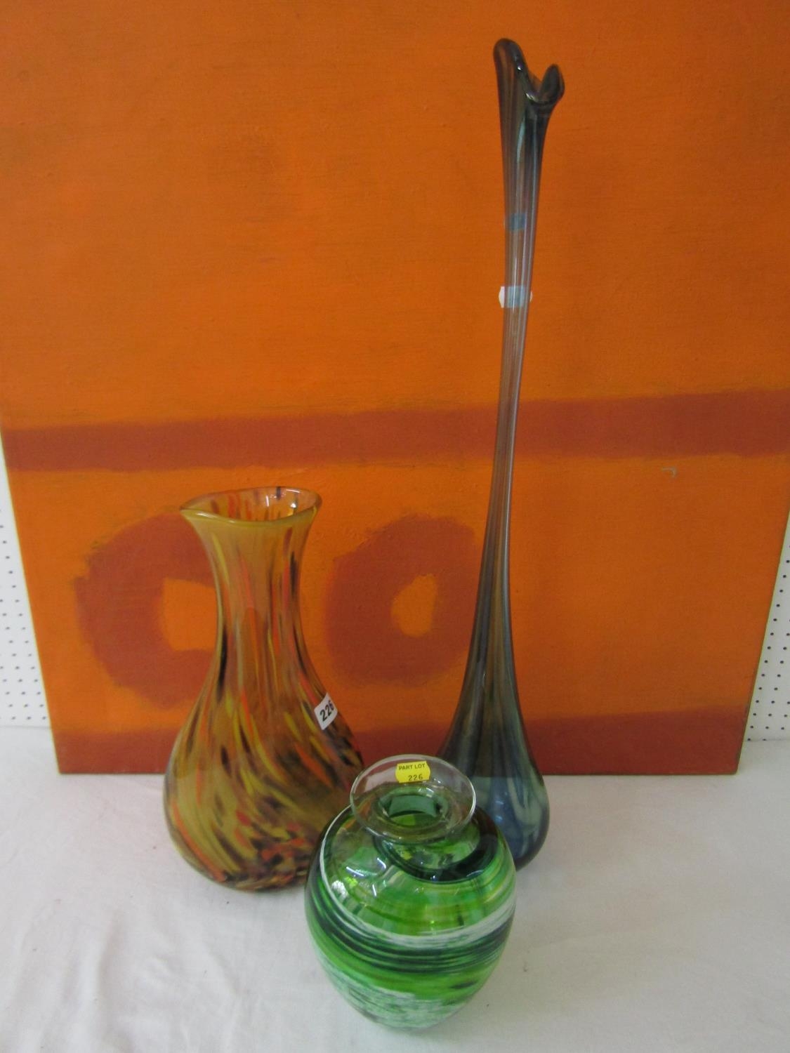 Good quality heavy glass baluster vase with mottled stripe green and white decoration, 23 cm high, together with a further Sunderland glass baluster vase with mottled orange decoration upon a yellow ground, 40 cm high, and a further tall Venetian type glass vase, 73 cm (3)