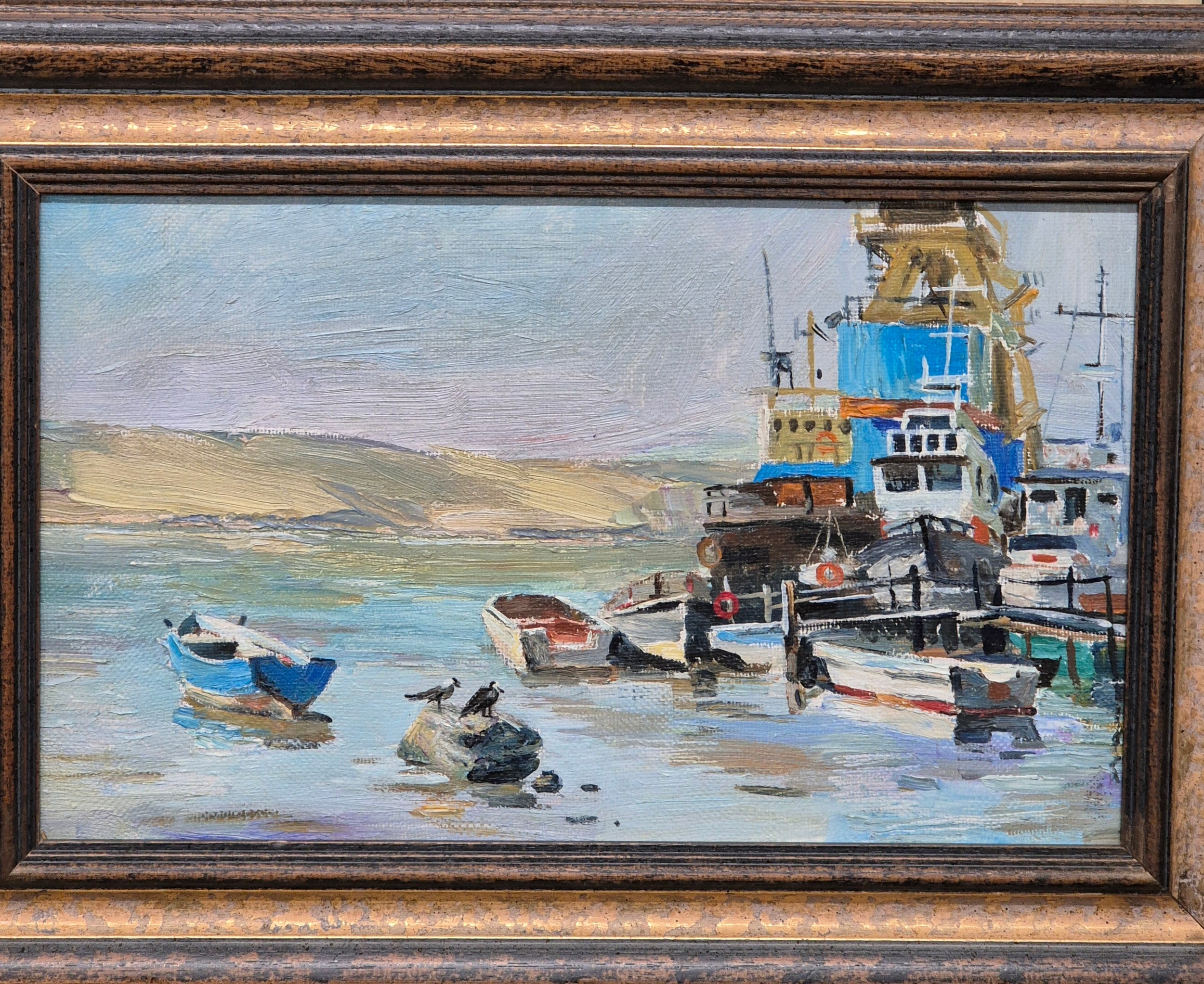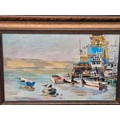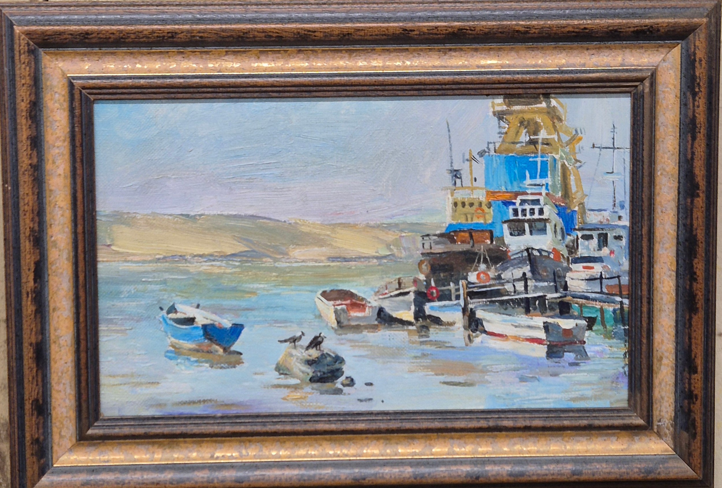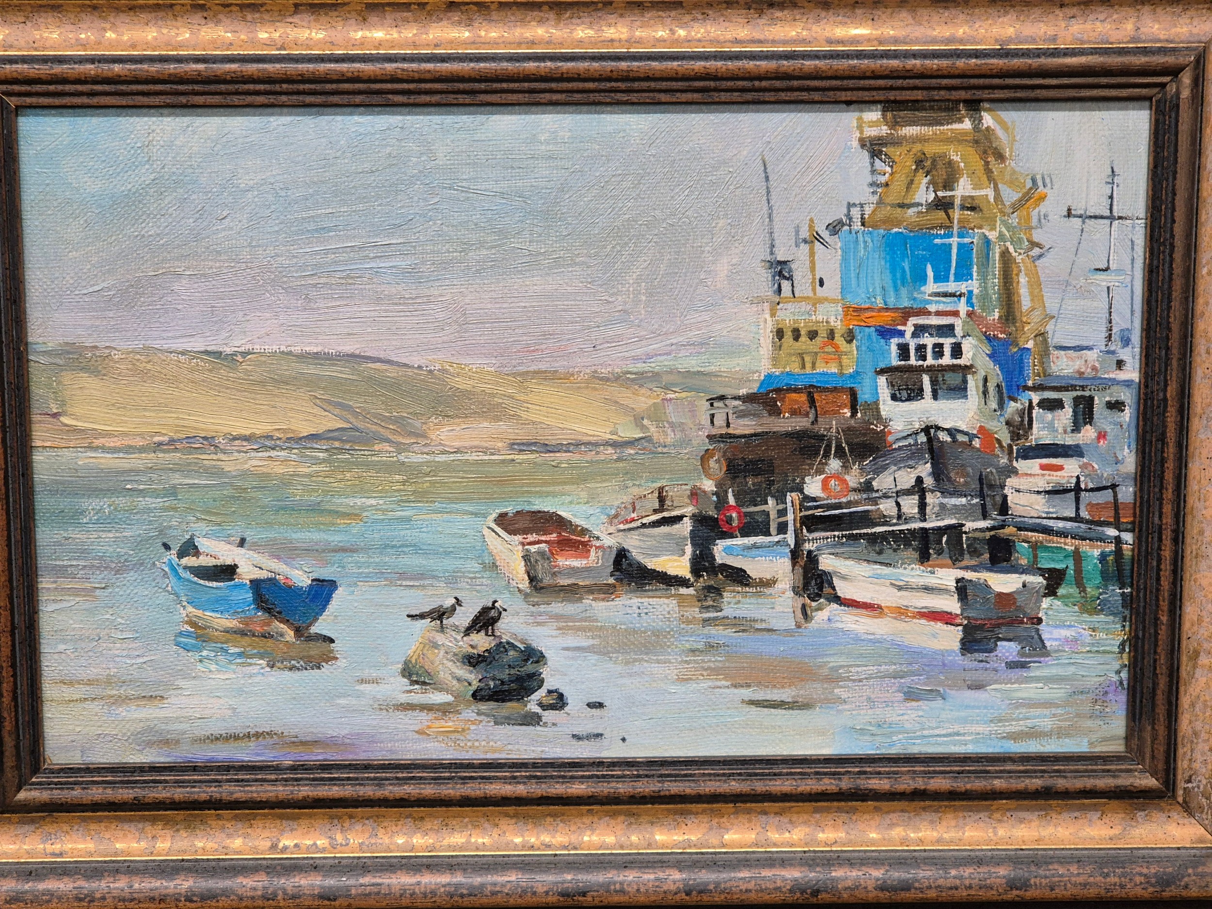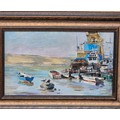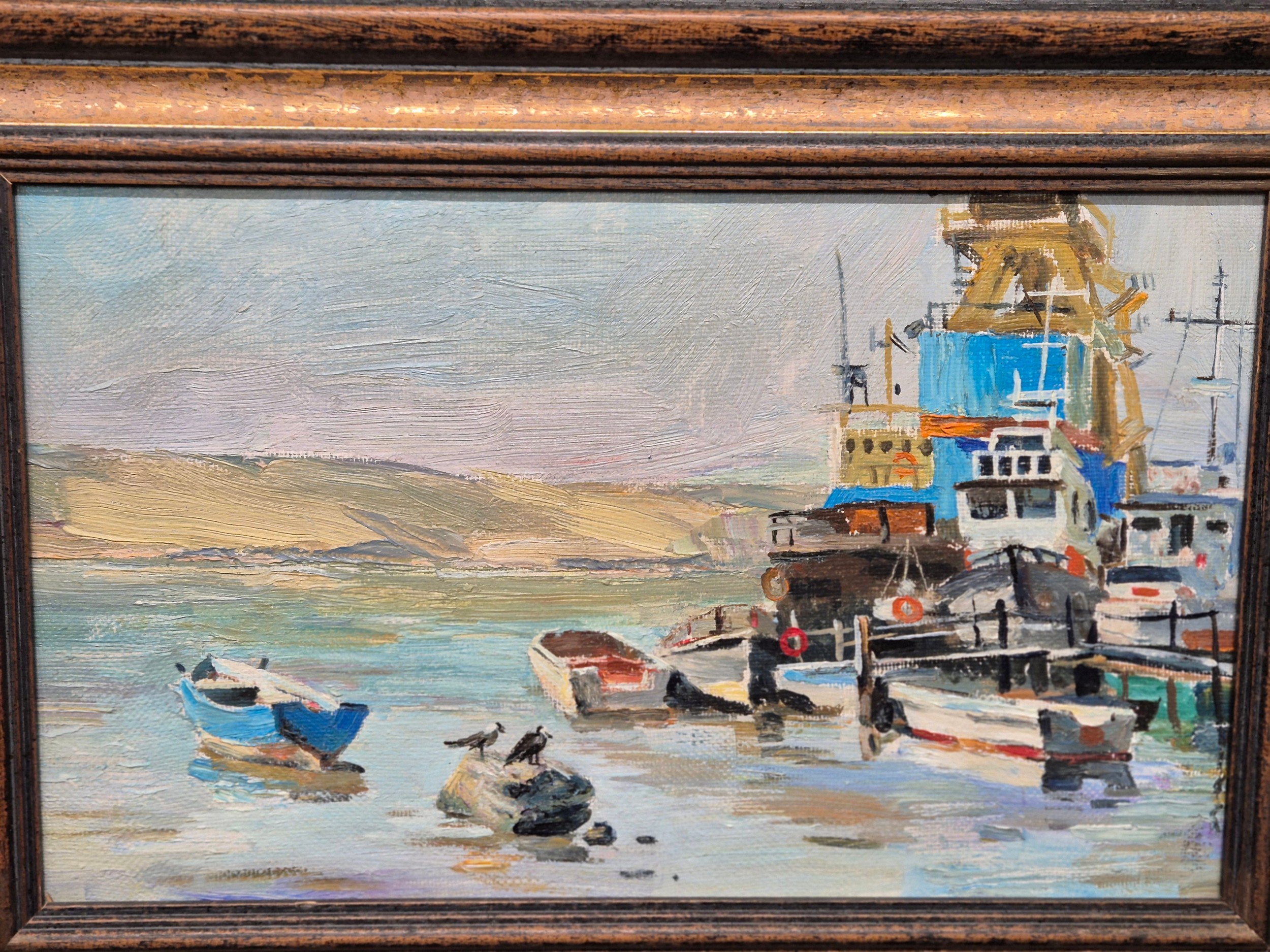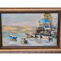 Original oil on canvas "Smaller Pier". Signed and details to back. Dated 2002. Fitted within a gilt and wash black frame. Artwork- 23x38cm. From the private collection of Preston House.