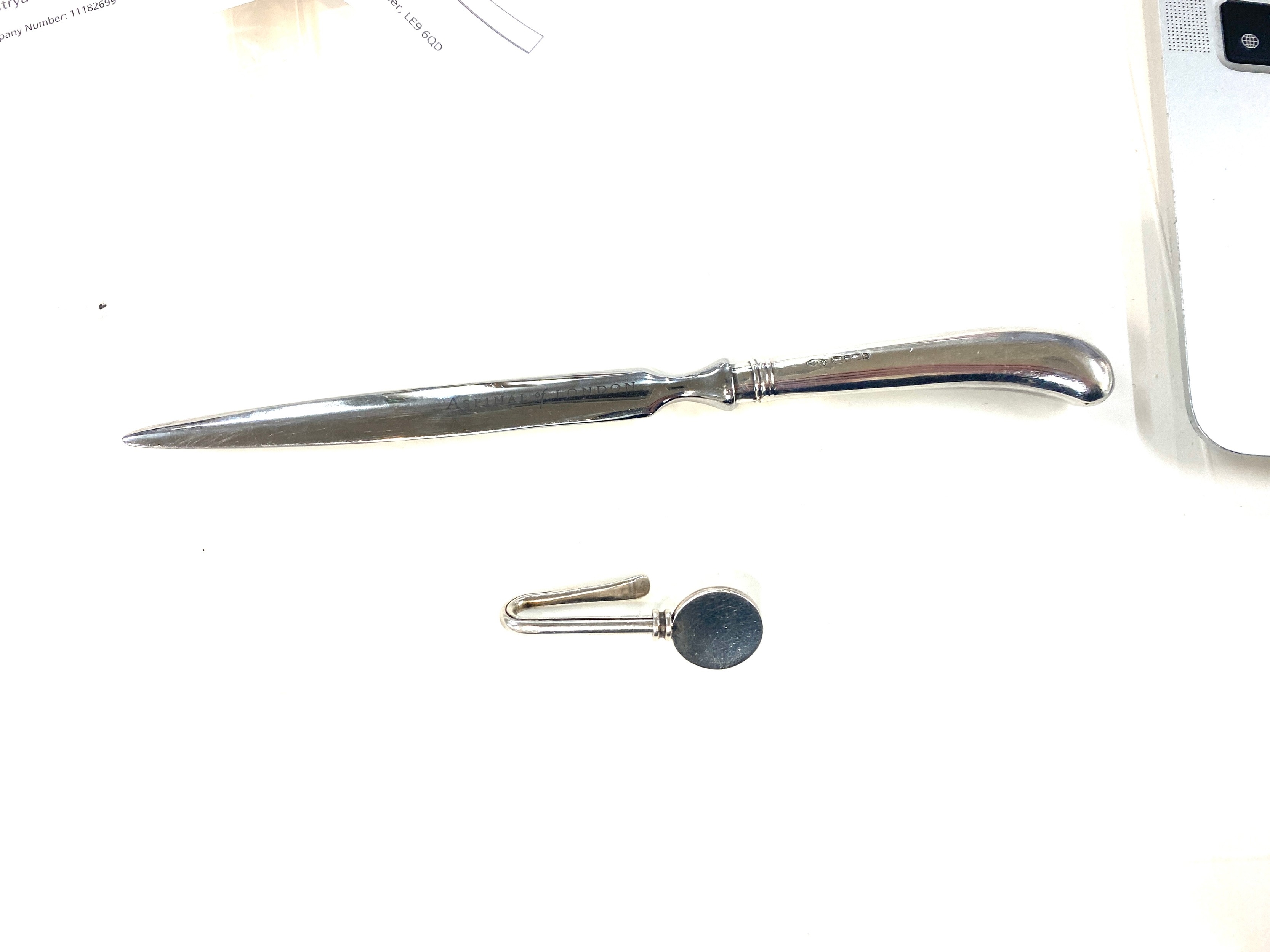 Silver handled Aspinal of London letter opener and a silver tie clip