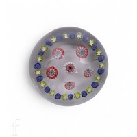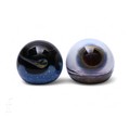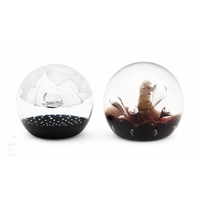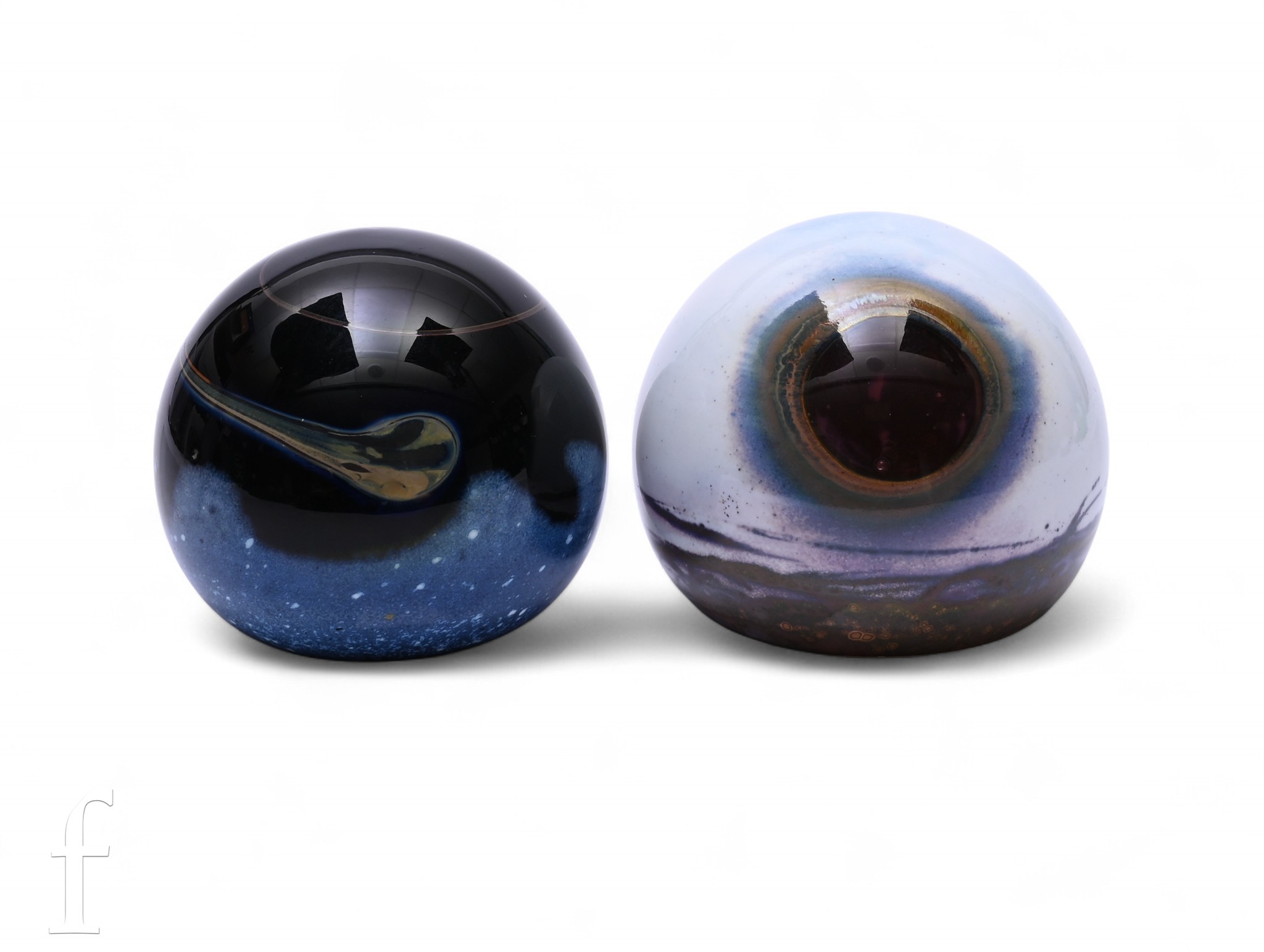 A 20th Century Caithness glass paperweight, in the 'Meteror' pattern, of domed form decorated with a ochre and blue swirl over an opaque black and mottled blue ground, acid mark, numbered 27/1000, retains certificate of authenticity, together with a similar Caithness paperweight titled 'Winter Moon', decorated with a red moon over a mottled white ground with interior white core, acid mark, retains certificate of authenticity, diameter 8.5cm. (2)