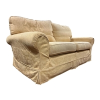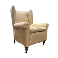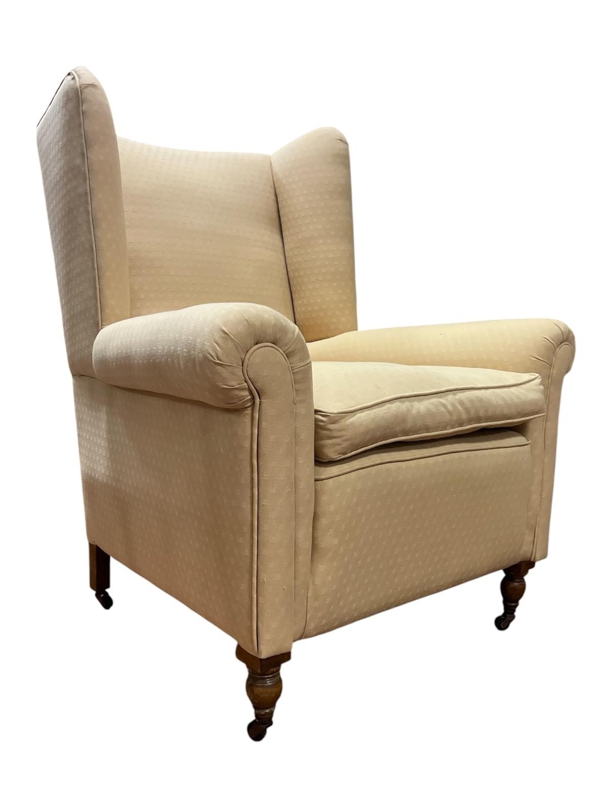 A VICTORIAN STYLE WING BACK ARMCHAIR with loose cushions and scroll over arms on turned legs with castors