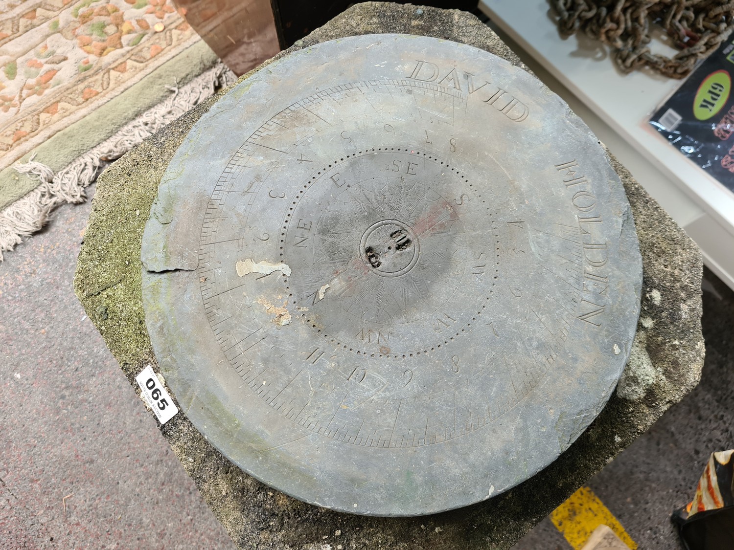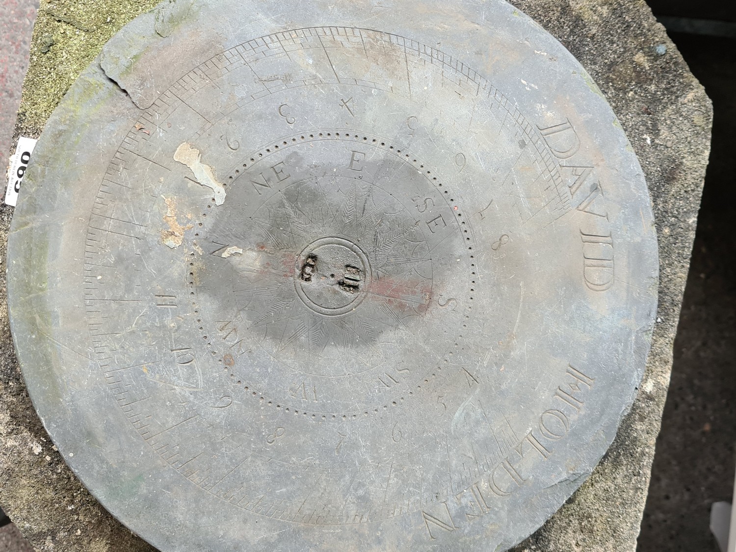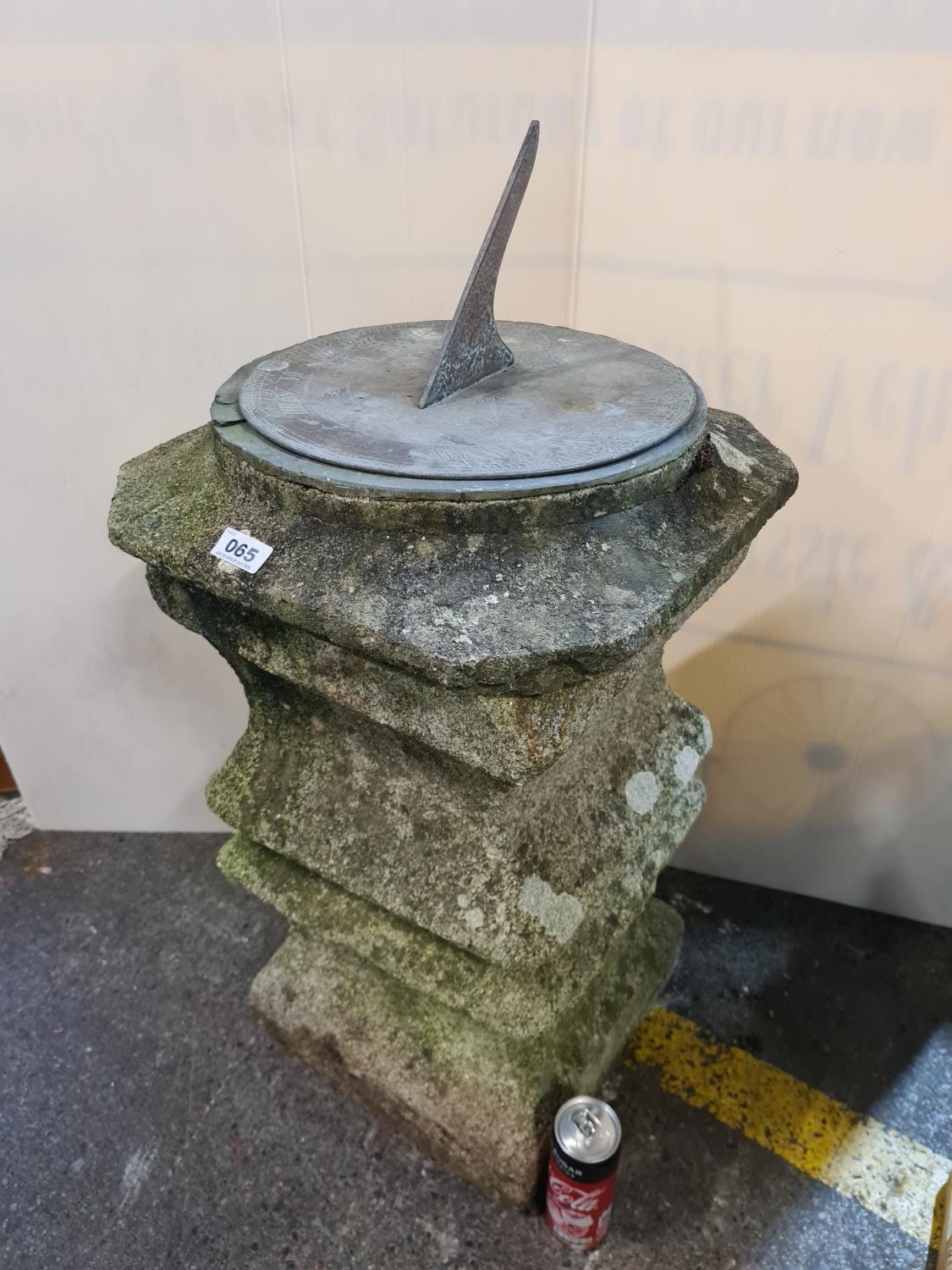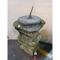 Fabulous Geordian carved limestone Sun dial pillar. The original top is named David Holden and the removable top dial also has lots and lots of age and is signed R Wood, made from copper with a super patina. Fabulous original piece. From the large home in Dublin 4. 72cm tall