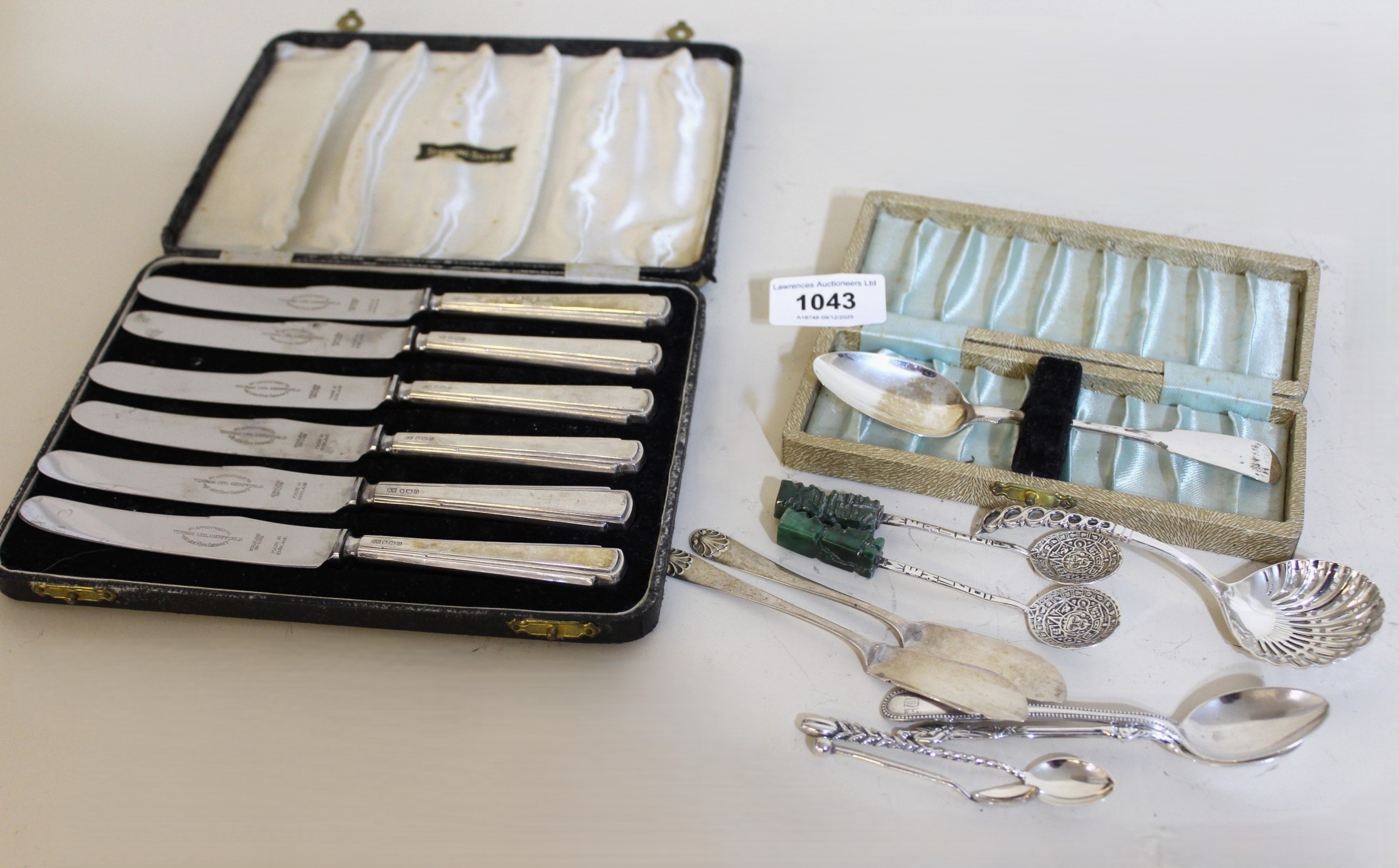 Cased silver Fiddle pattern teaspoon, cased set of six silver handled tea knives, two silver butter knives and various silver and white metal coffee spoons, sifter spoon etc., two with jadeite handles